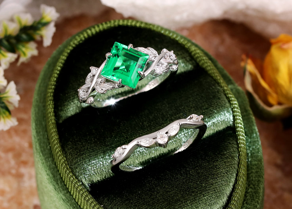 MIRETH Nature Inspired Square Shaped Moss Agate Bridal Ring Set - Gold