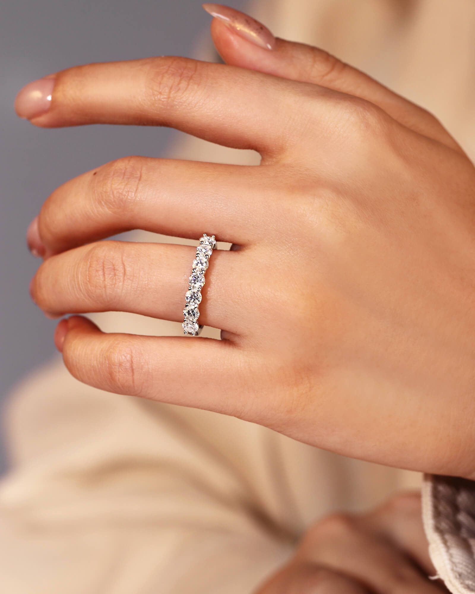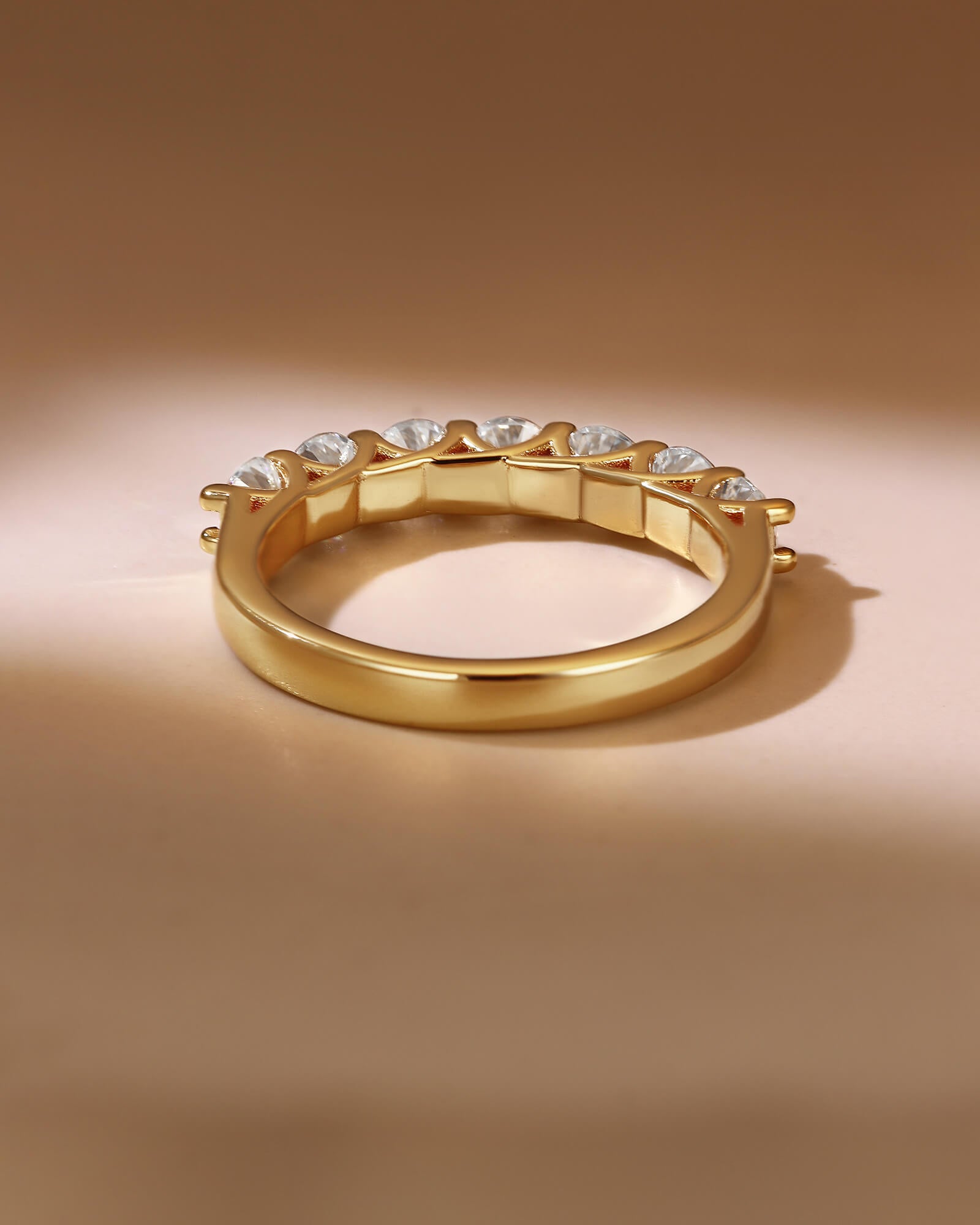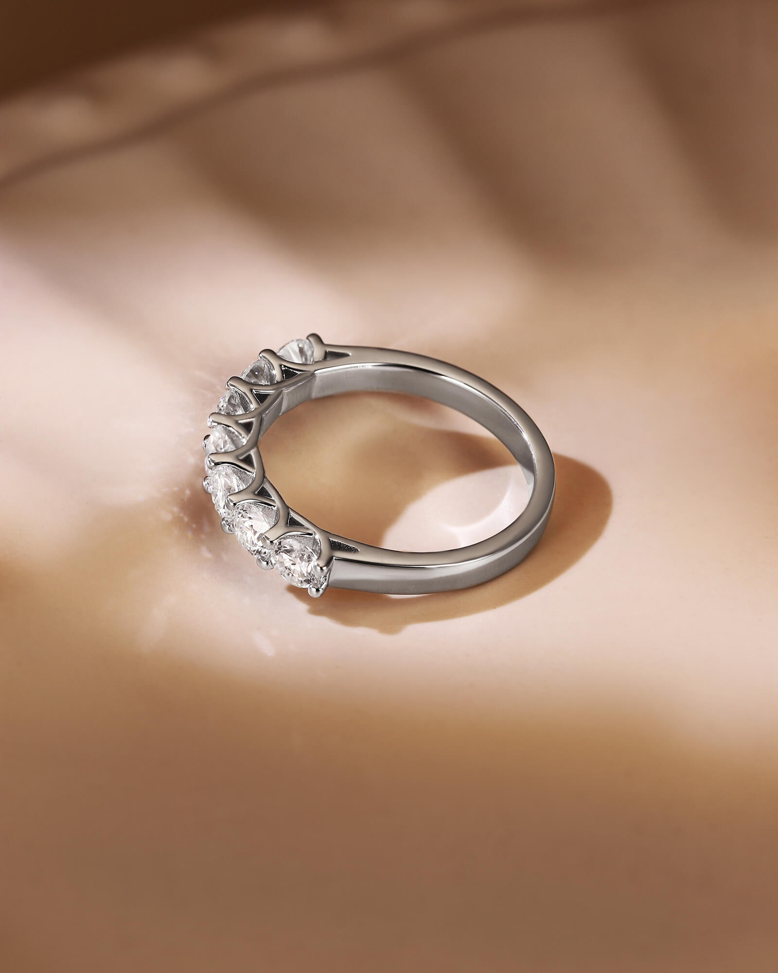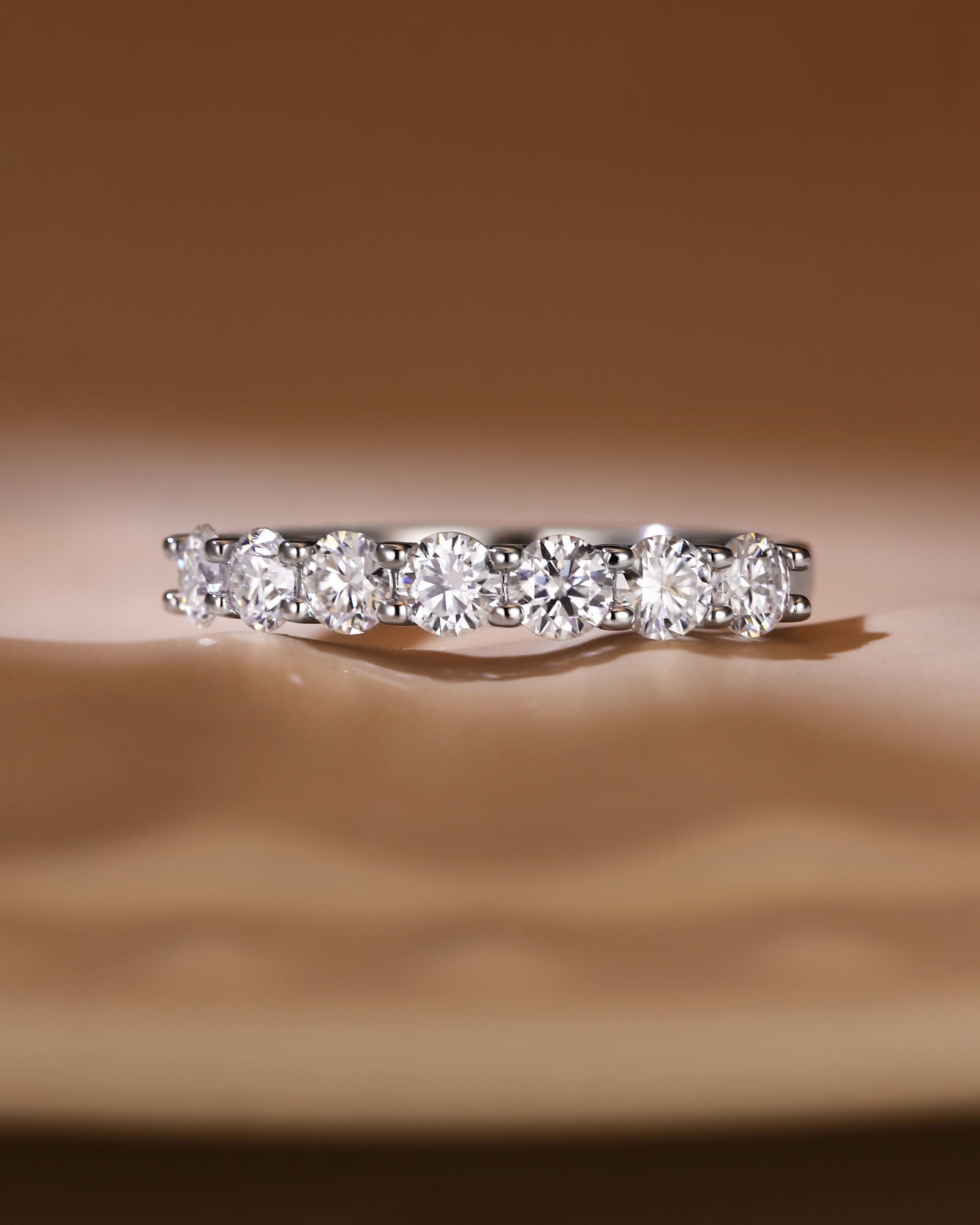 The ISLA ring presents a clean, modern line of seven fiery moissanites. A minimalist yet profound symbol of a promise that grows brighter with time.