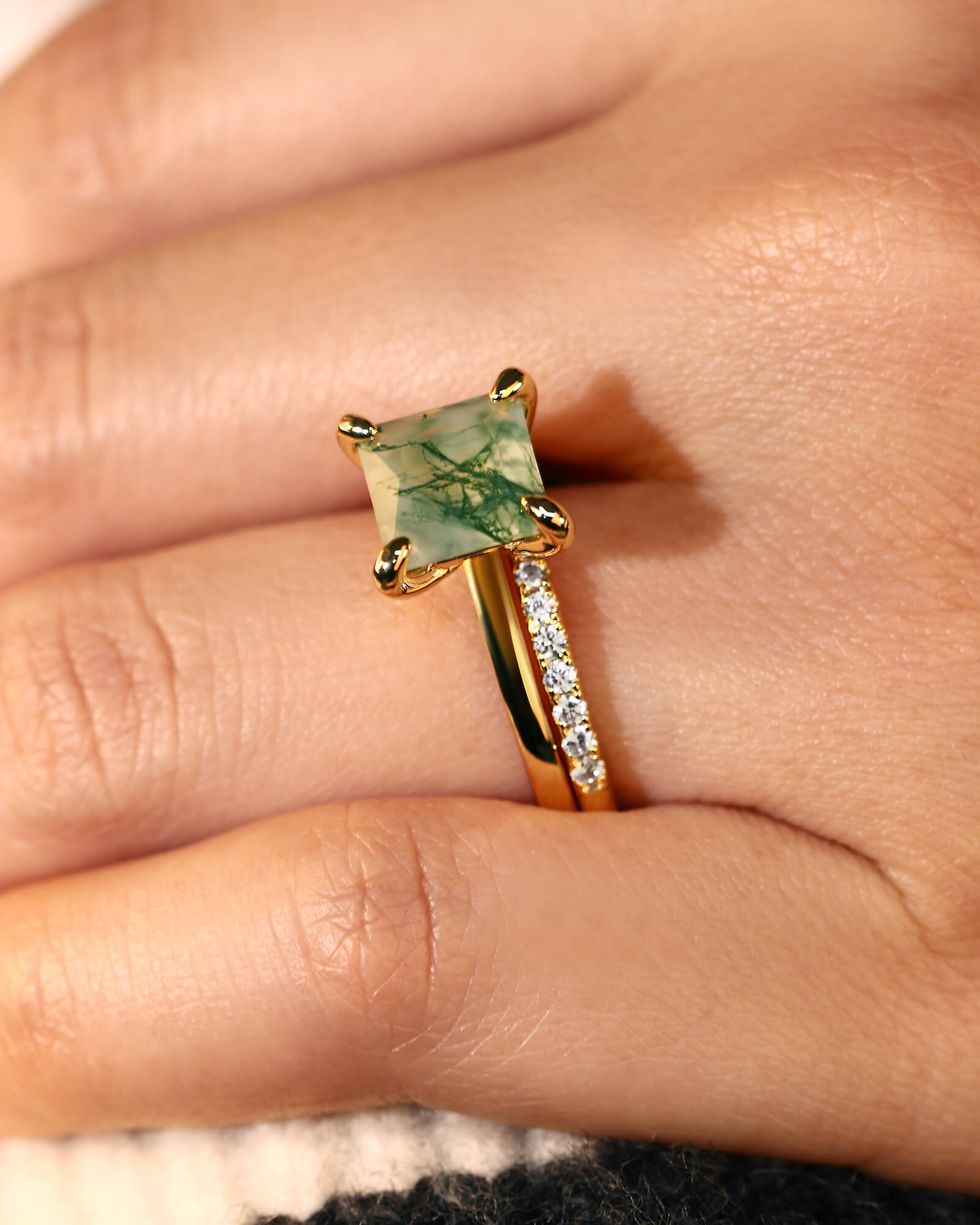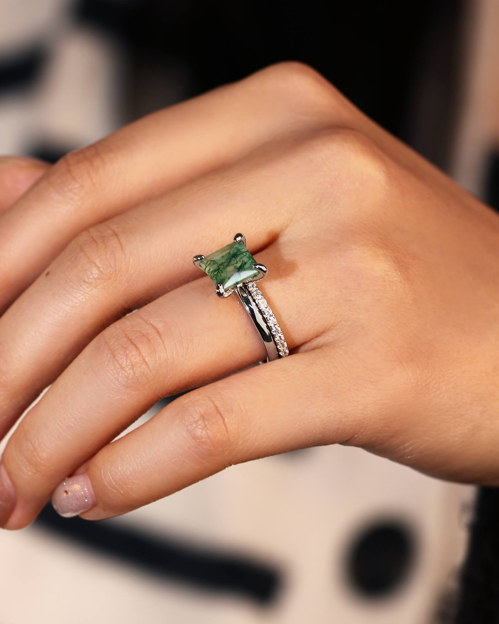 A pristine princess-cut moss agate sits in solitary clarity above a celestial band of scattered diamonds. This set captures the duality of love: a soul both deeply rooted in nature's untamed beauty and gracefully adorned by moments of pure brilliance.