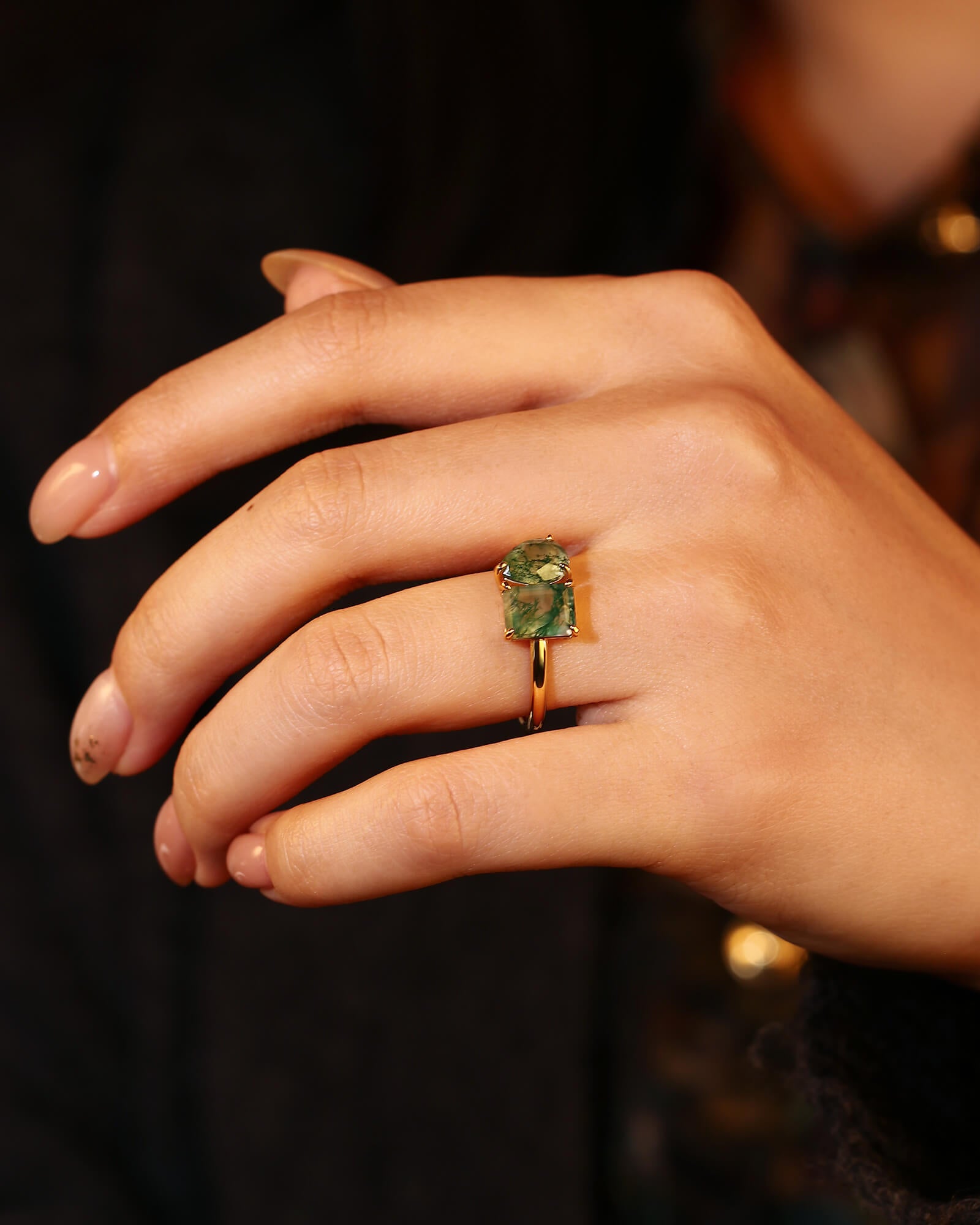 The ACACIA ring reinterprets the timeless Toi et Moi motif for the modern romantic. It brings together two distinct expressions of nature's beauty: the emerald cut moss agate, a window of geometric clarity and structured depth, and the pear cut moss agate, a teardrop of fluid grace and soft intention. Each stone is a world unto itself, with unique mossy landscapes that tell their own story.