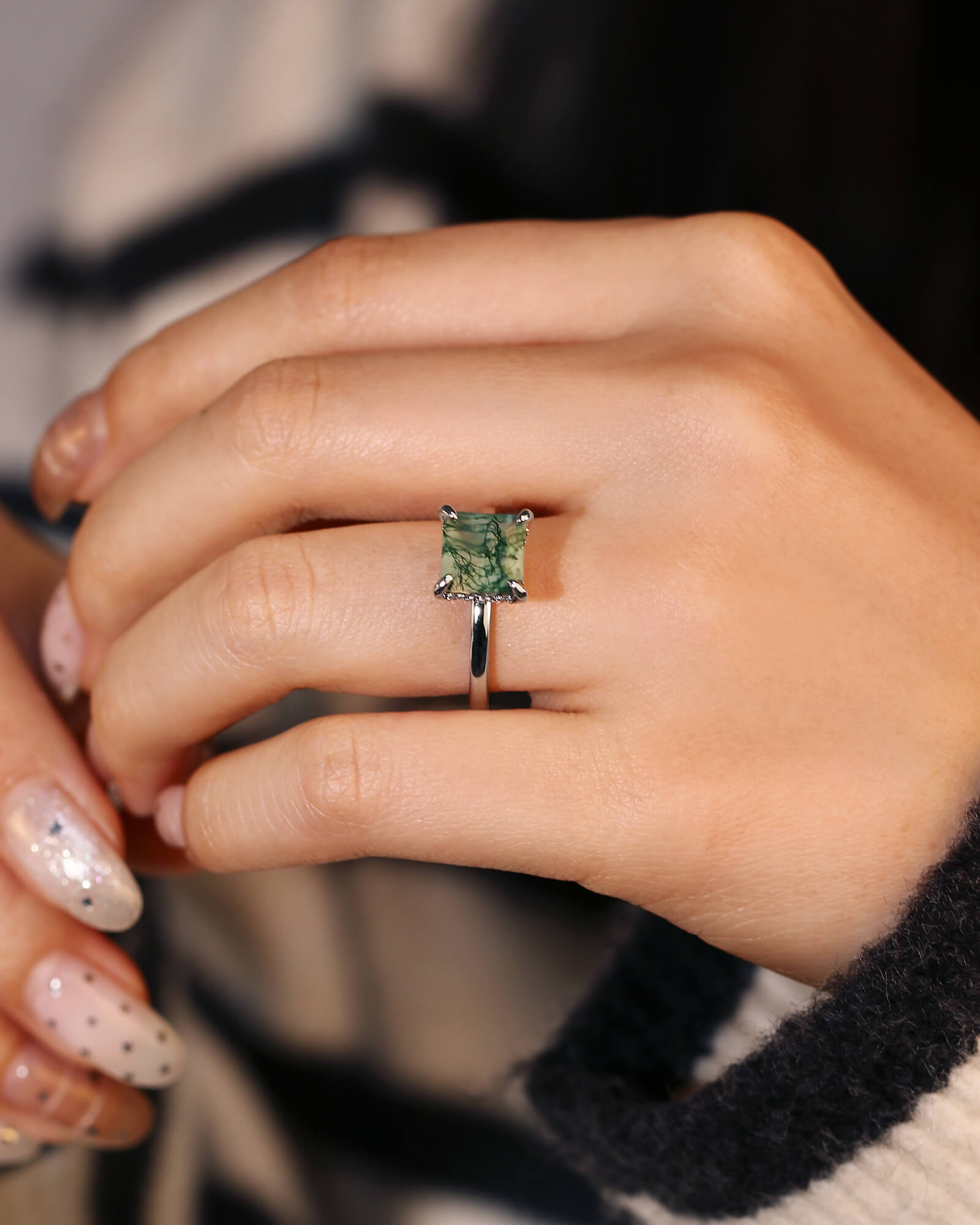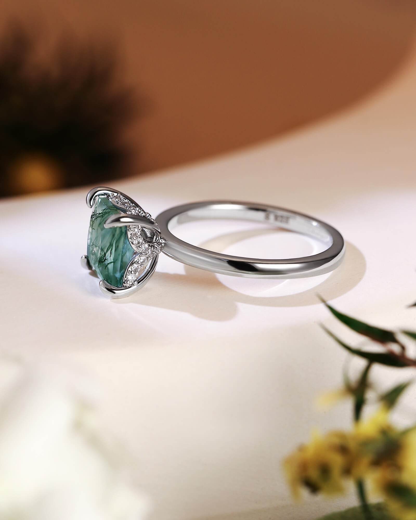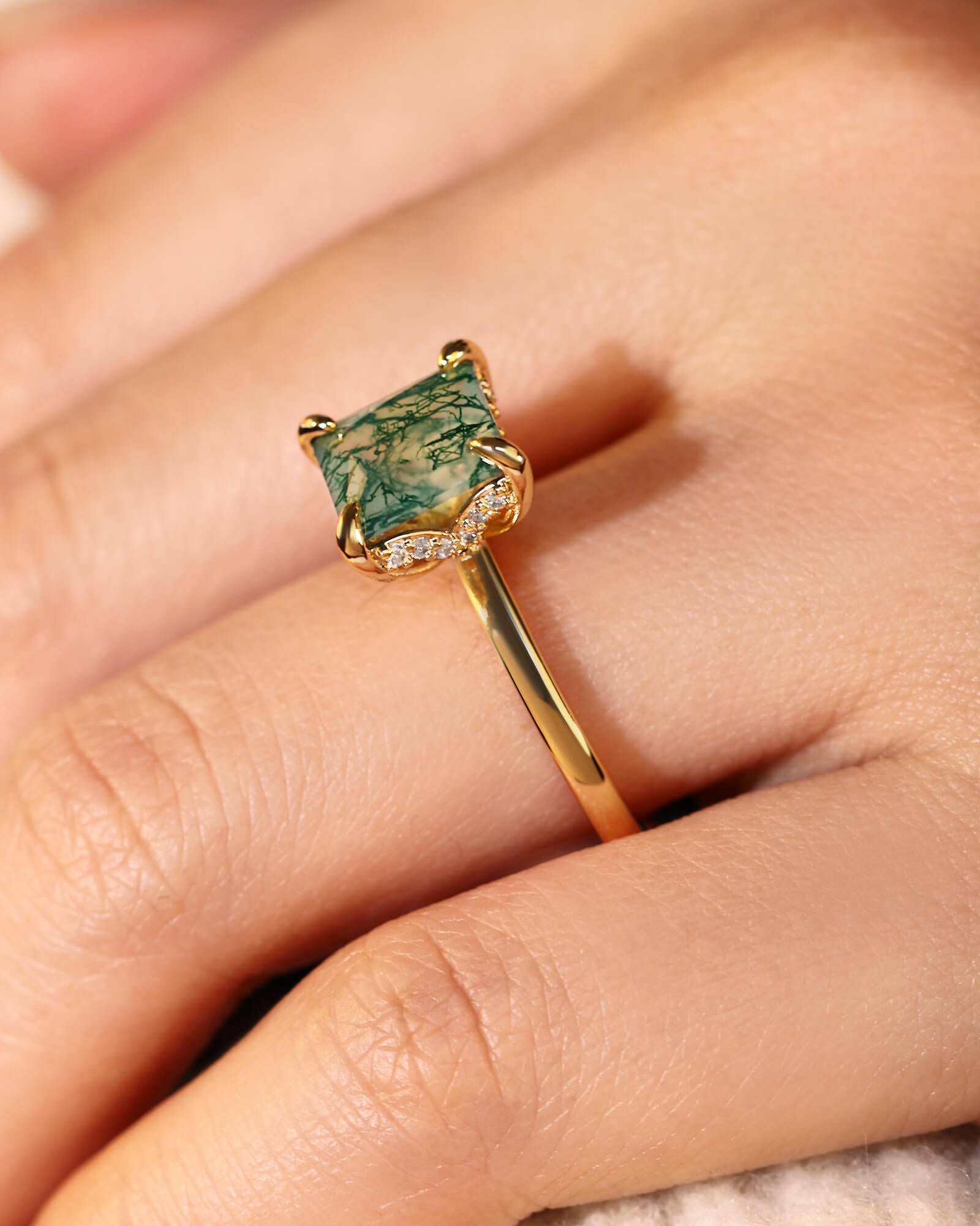 A princess-cut moss agate cradled within a delicate pave diamond basket, where petals of light embrace a serene green heart. This is more than a ring—it’s a miniature garden, crafted for a love that grows in both stillness and sparkle.