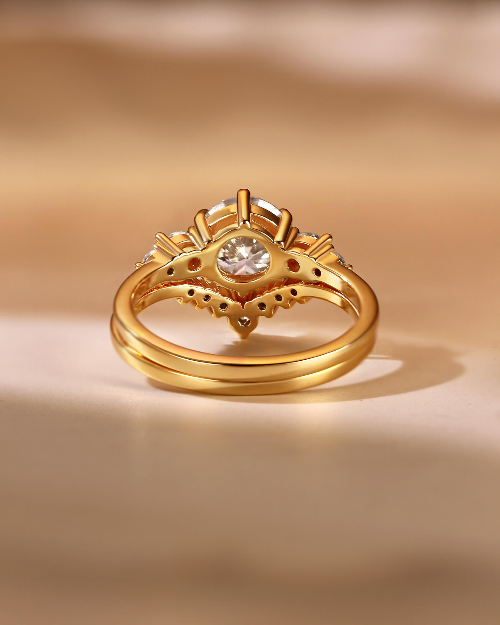 A radiant round moissanite, flanked by two graduating pairs of diamonds, meets its perfect partner—a sparkling curved diamond band. This set captures the dynamic harmony of a love that is both anchored and flowing.
