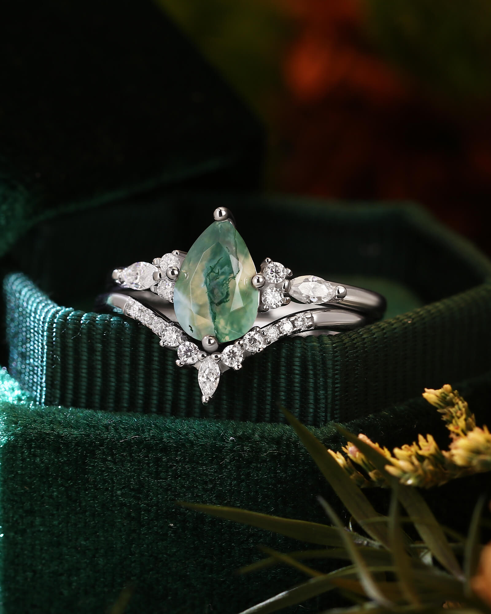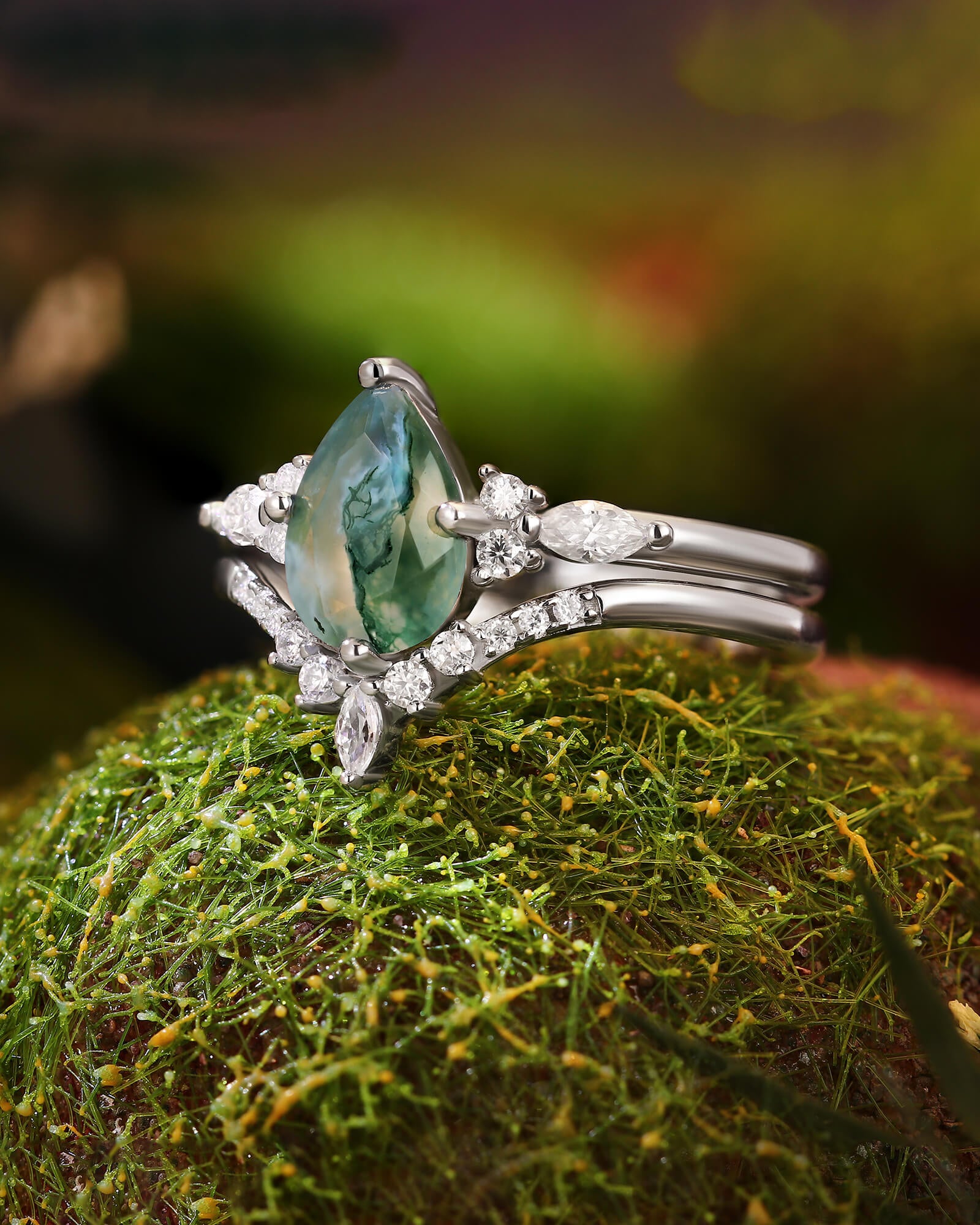 The ARBELLA ring set is a masterful narrative of love's graceful path. It begins with the ARBELLA Solitaire, featuring a luminous pear-shaped moss agate. This captivating teardrop of nature, with its serene green hues, is adorned with a delicate cluster of two round diamonds and a marquise diamond, a celestial trio that guides the eye along the stone's elegant taper.