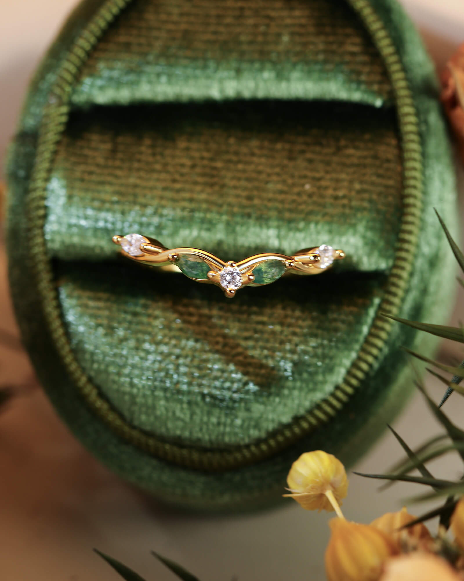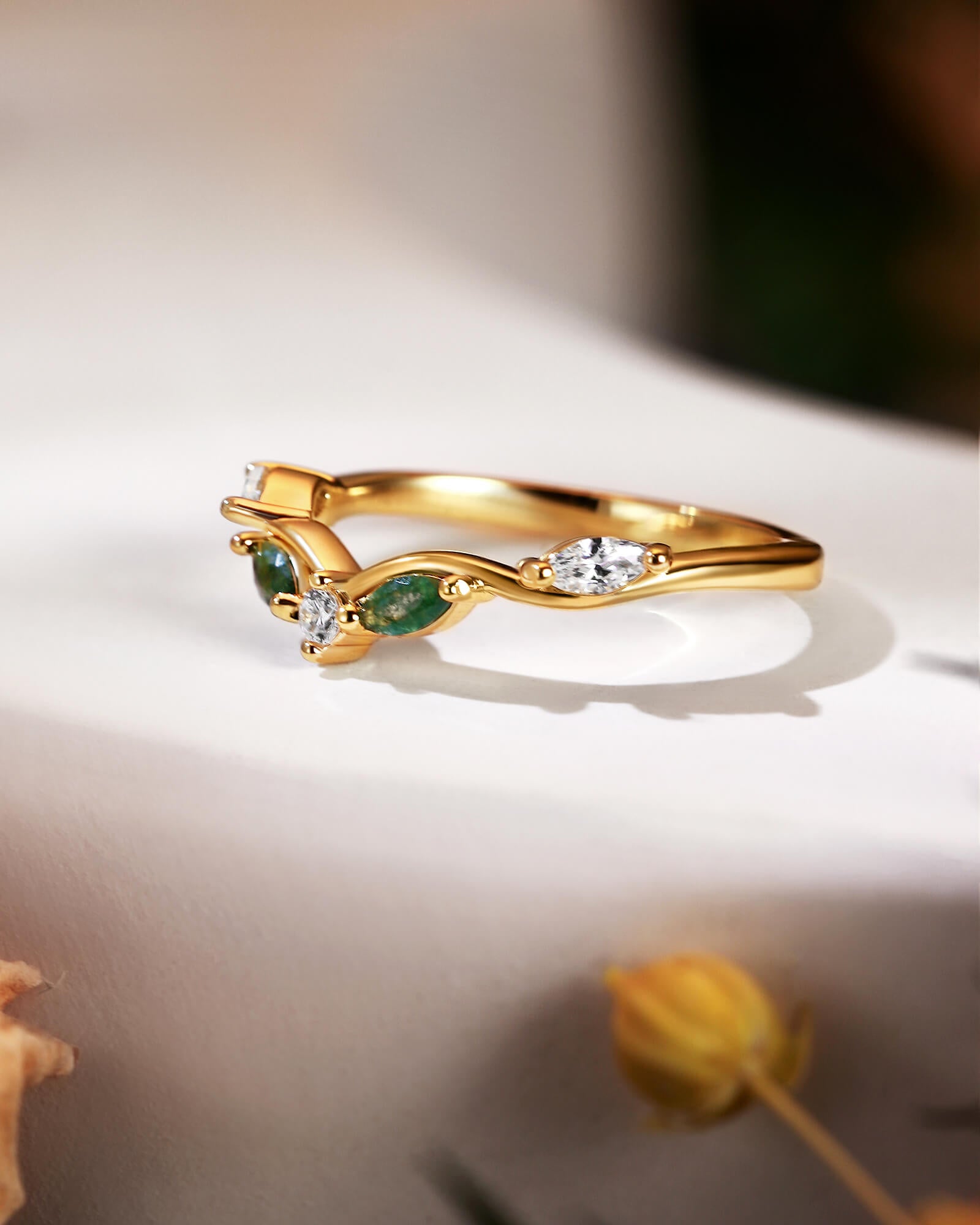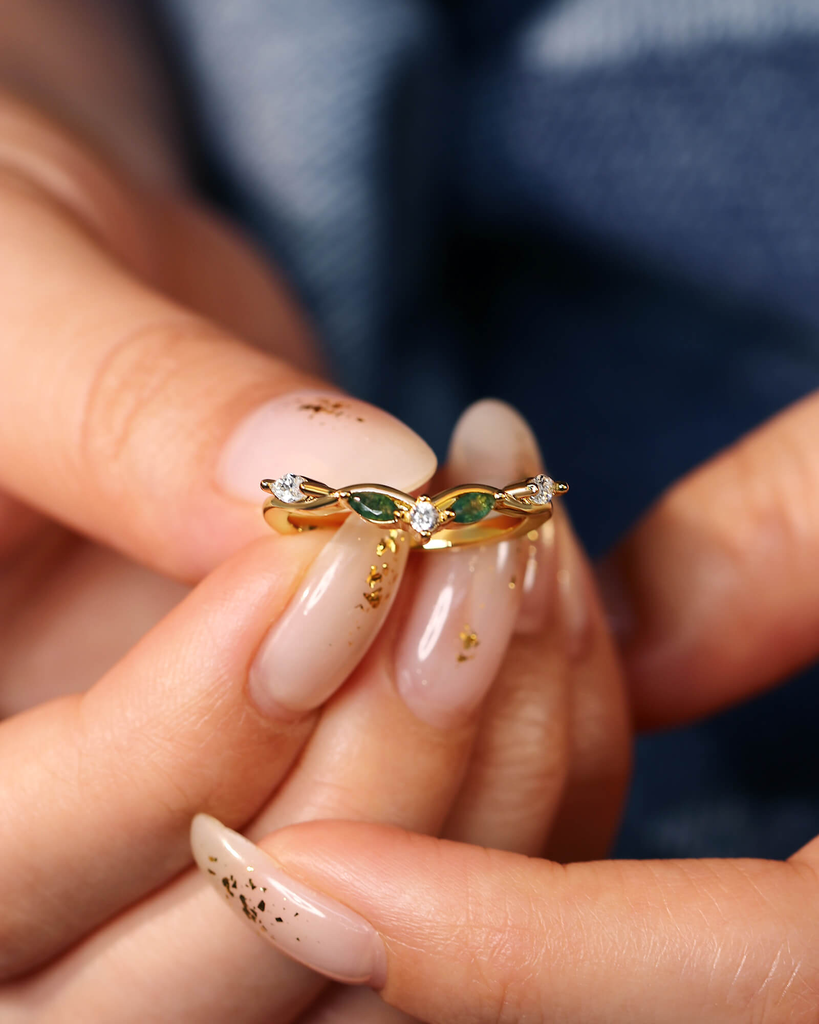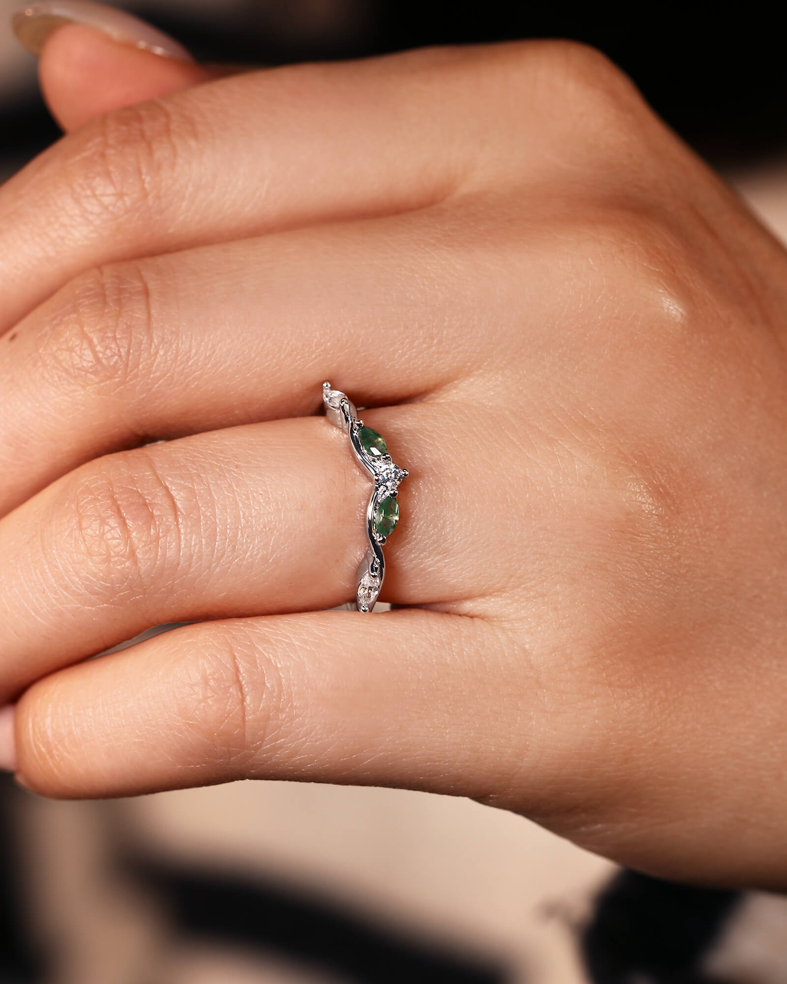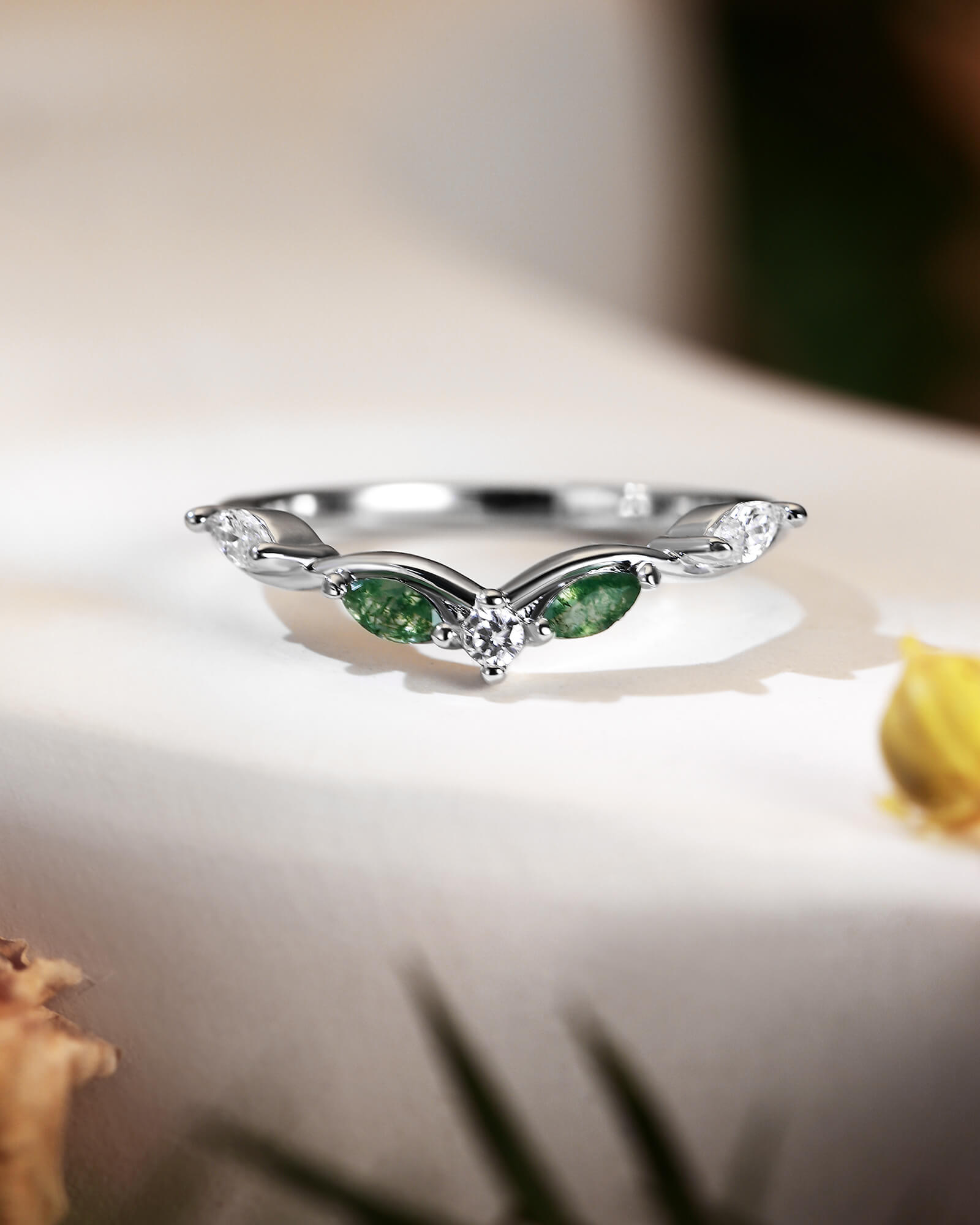 A delicate v-shape band, meticulously setting with brilliant round & marquise cut moissanite diamonds, and mixed two pieces of marquise cut moss agate. This ASH ring captures the promise of a love that shines brightly through every moment, designed to be worn alone or stacked for endless possibilities.