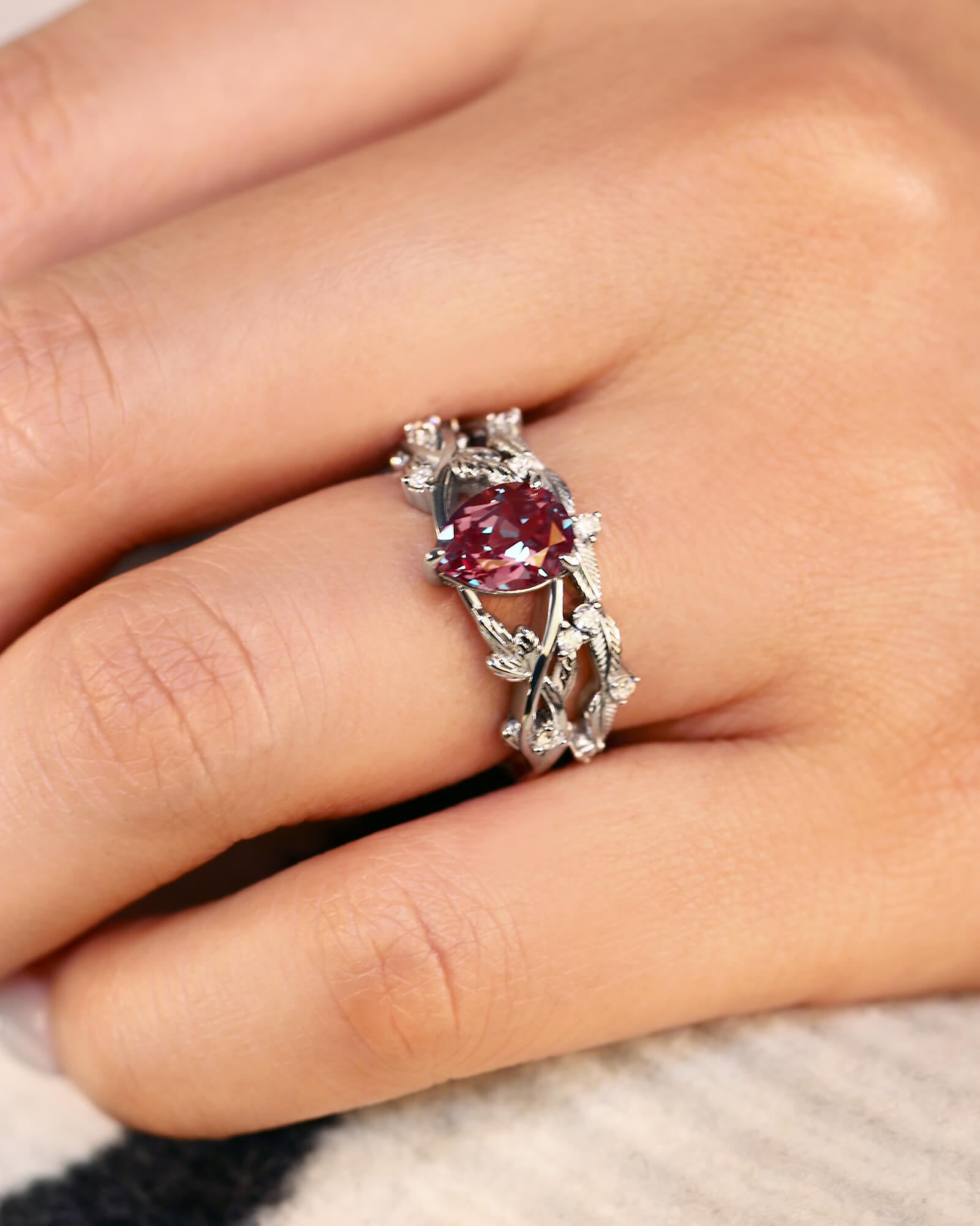 Pear Shaped Lab Alexandrite Leafy Ring Set 2pcs Wedding Ring Moissanite Side Stone Ring Leaf Band Nature Inspired Ring Promise Bridal Anniversary Gift For Her