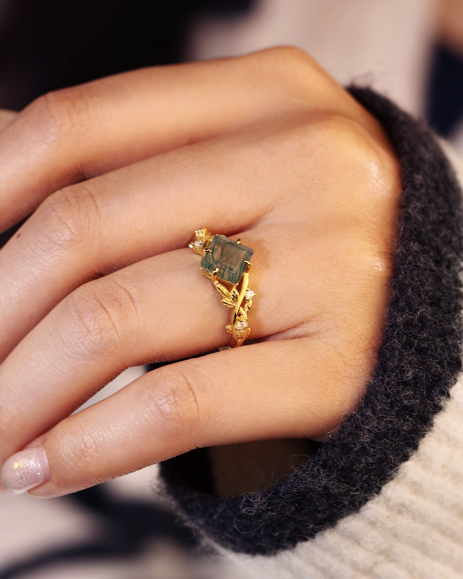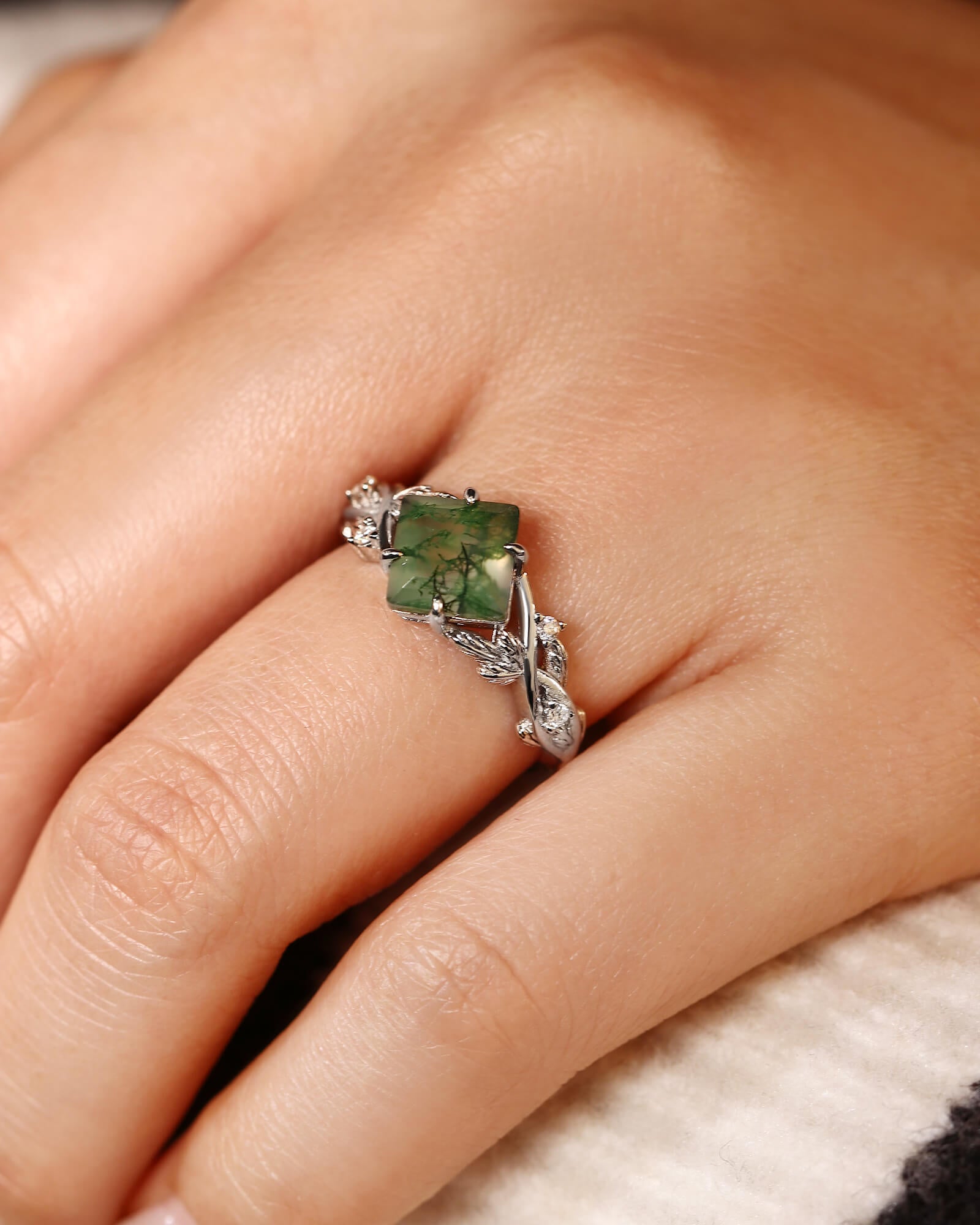Princess Cut Moss Agate Engagement Ring Moissanite Side Stone Ring Nature Inspired Crossed Leaf Split Shank Ring Promise Bridal Anniversary Gift For Her