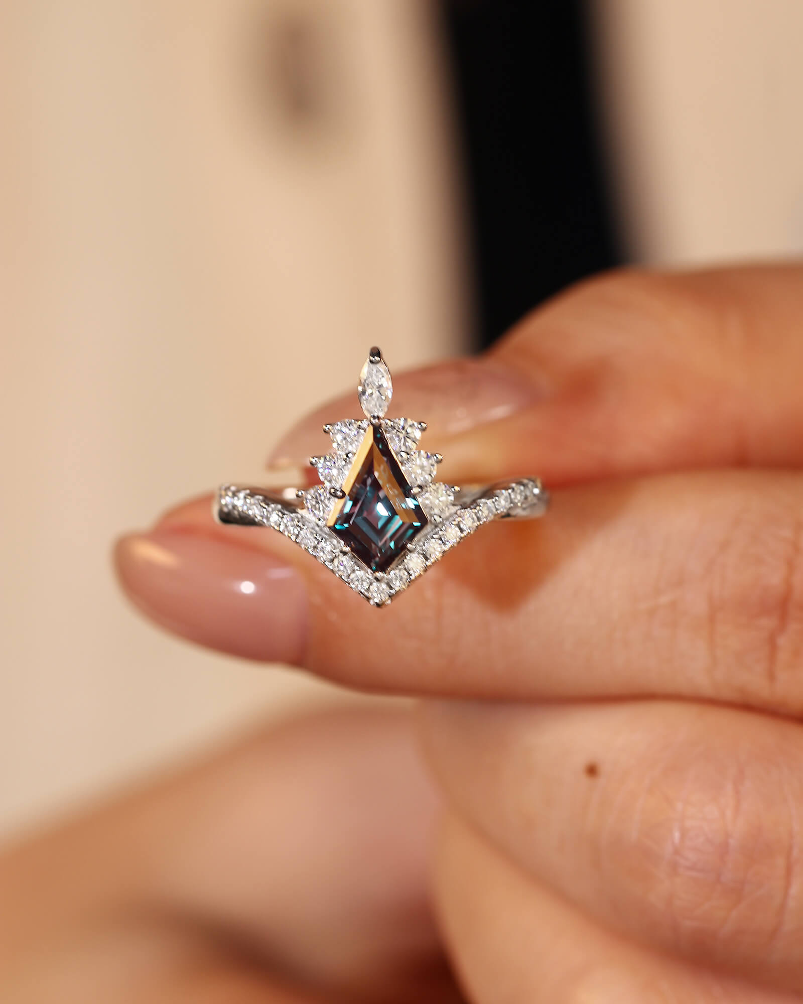 Unique Kite Shaped Alexandrite Engagement Ring Moissanite Art Deco Curved Halo Ring Color Change Promise Bridal Anniversary Gift For Her