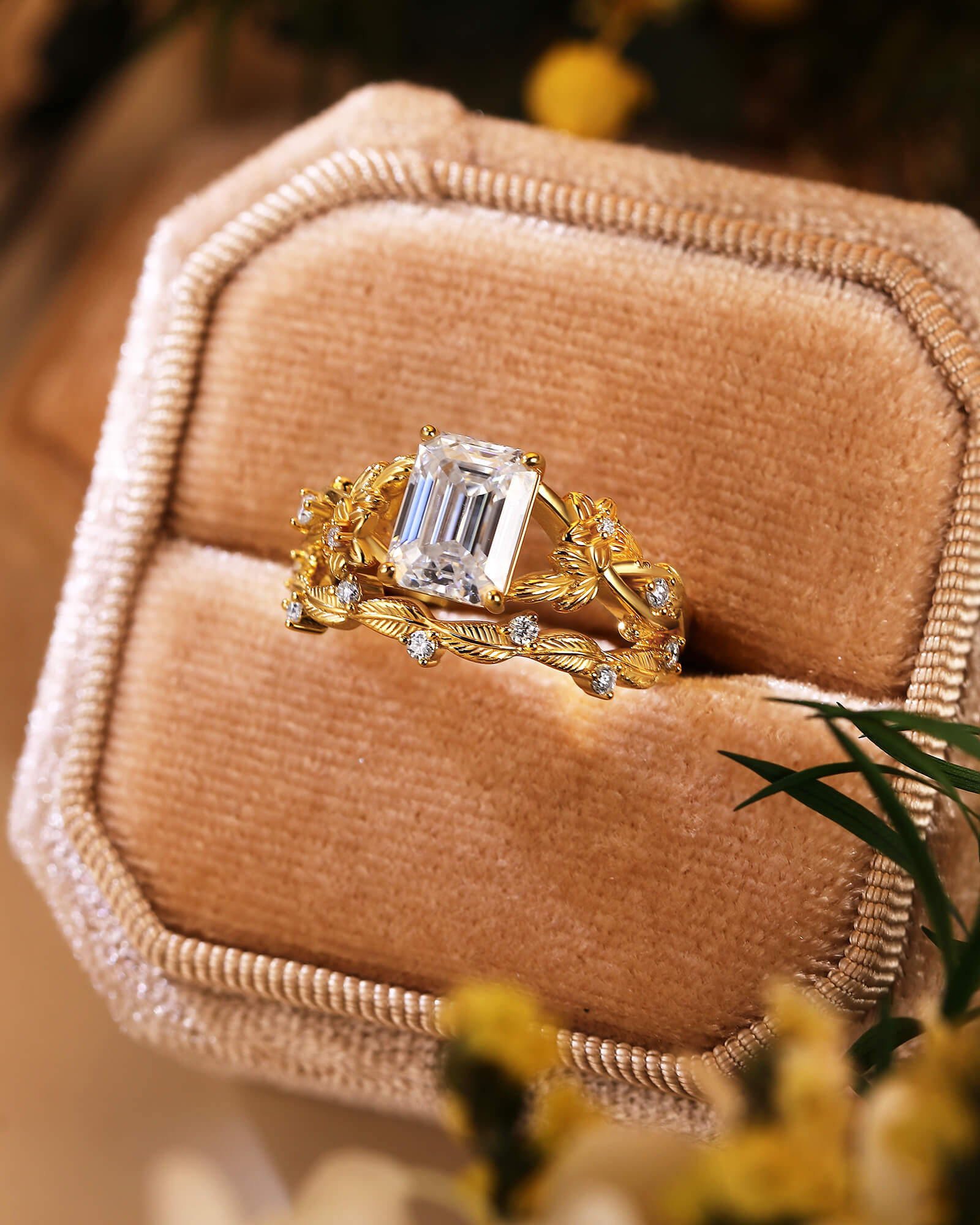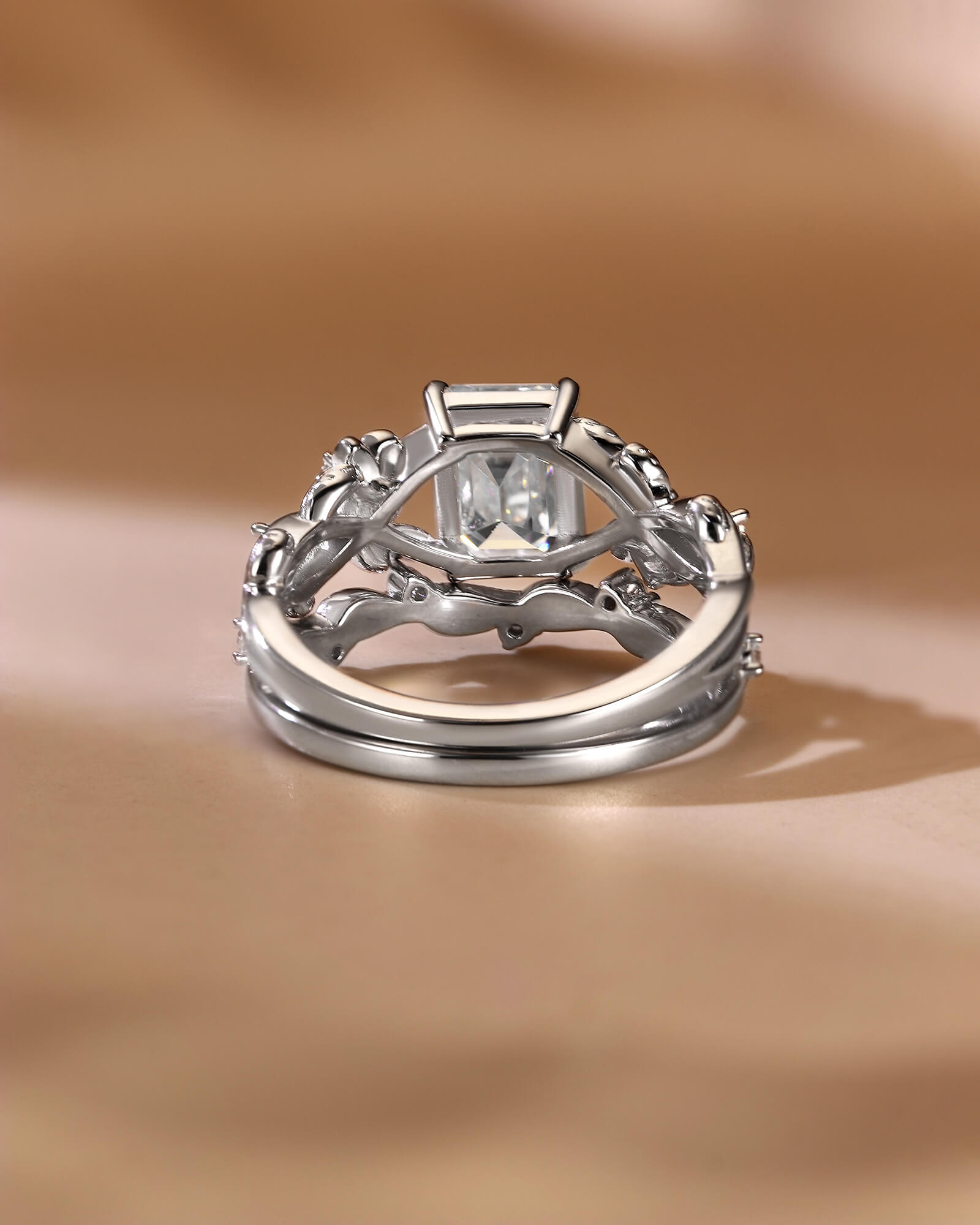 An emerald cut moissanite, cradled by a lush leaf and floral cluster, meets its perfect match—a delicate leaf-etched wedding band. This set is a complete botanical love story, from the heart of the woods to the encircling grove.