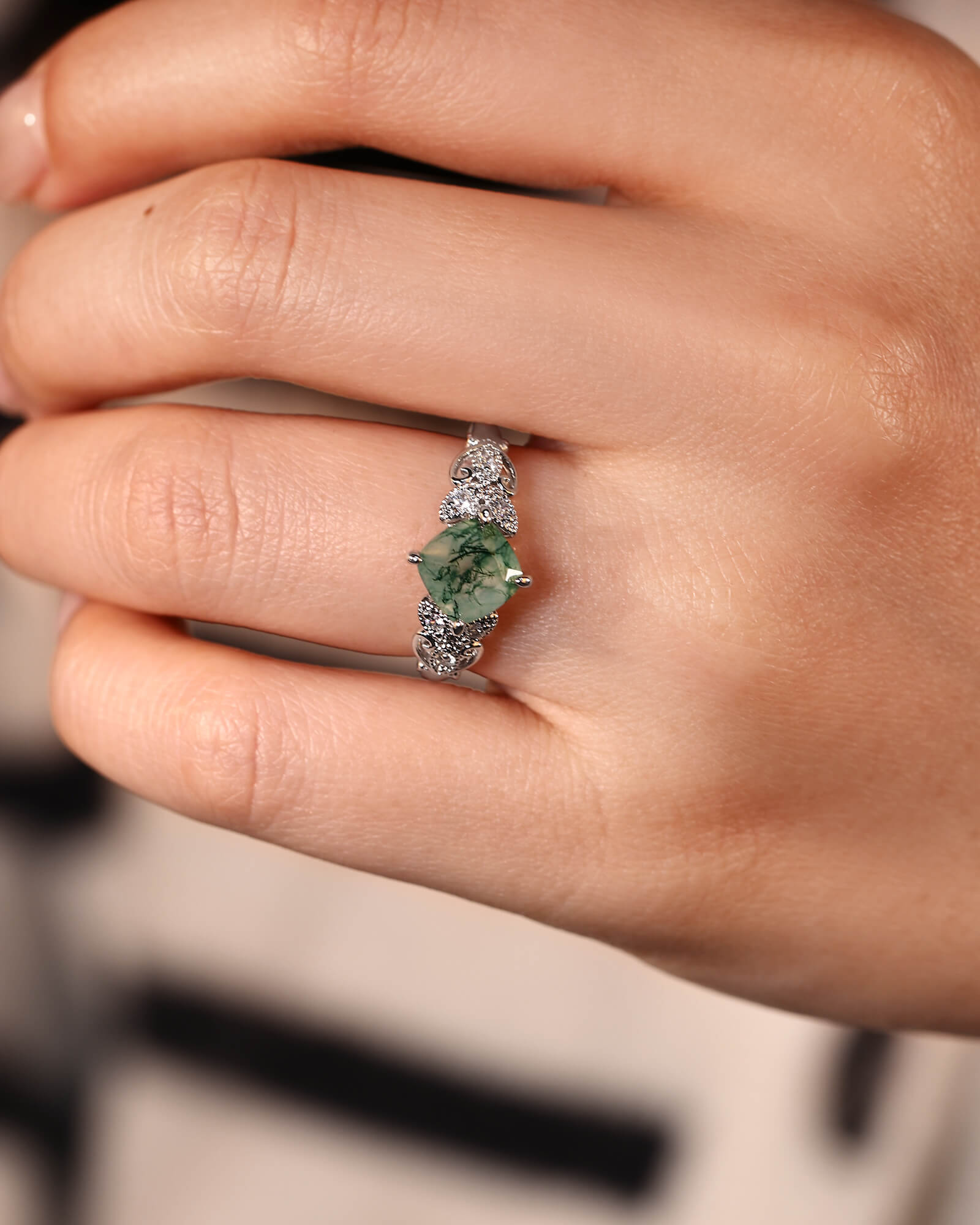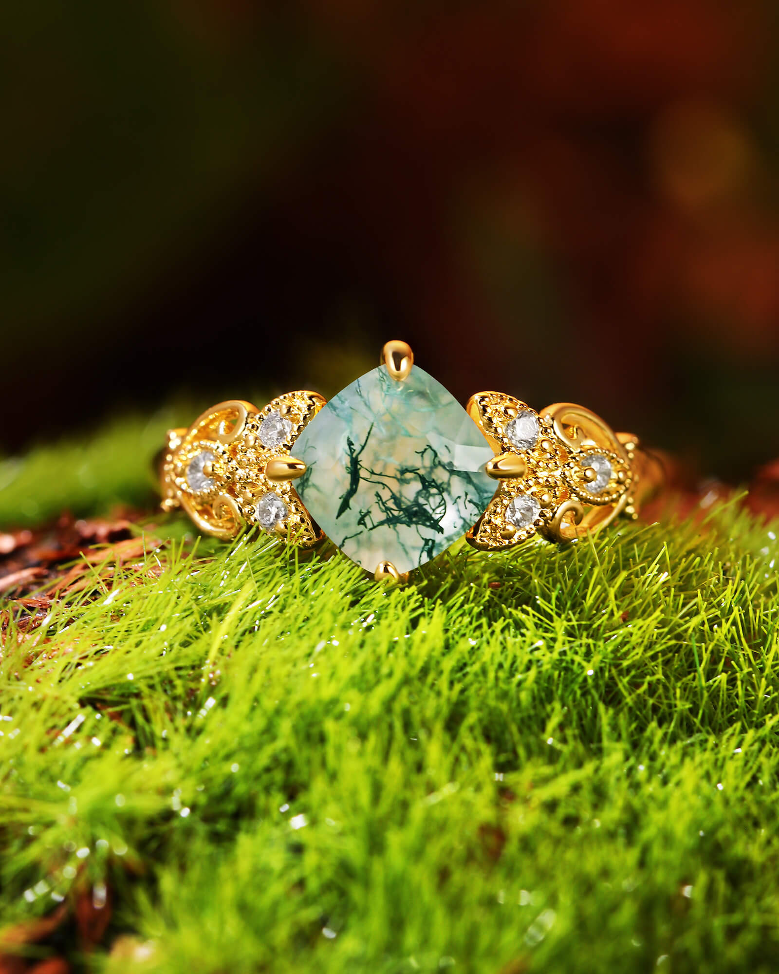 The cushion-cut moss agate rests at the center—a one-of-a-kind landscape of earthy greens and misty inclusions, soft and luminous. Its pillowed shape whispers of vintage romance, while its organic heart speaks to the wild.