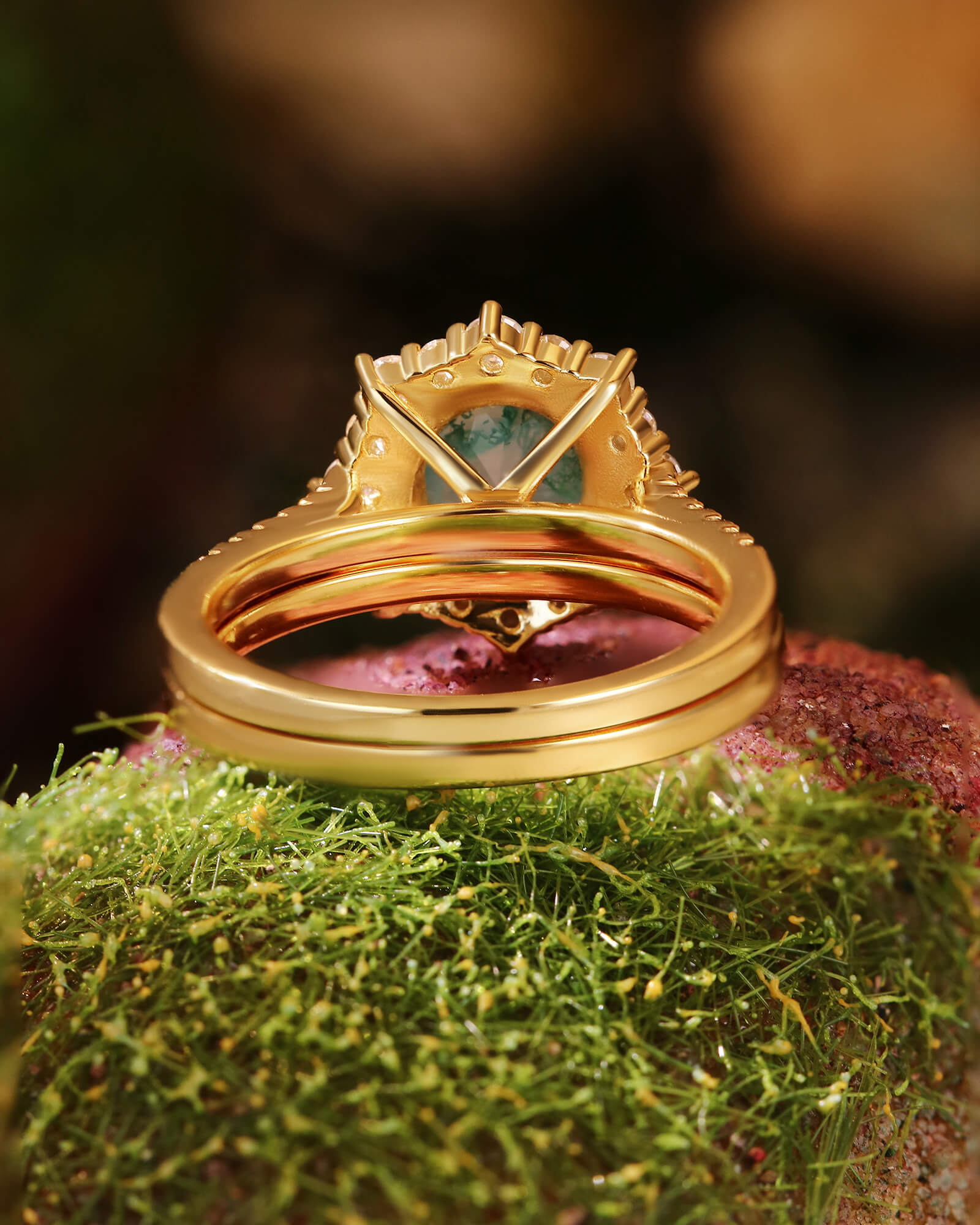 Unique Round Cut Moss Agate Ring Set 2pcs Wedding Ring Moissanite Half Paved Band Ring Nature Inspired Ring Promise Bridal Anniversary Gift For Her