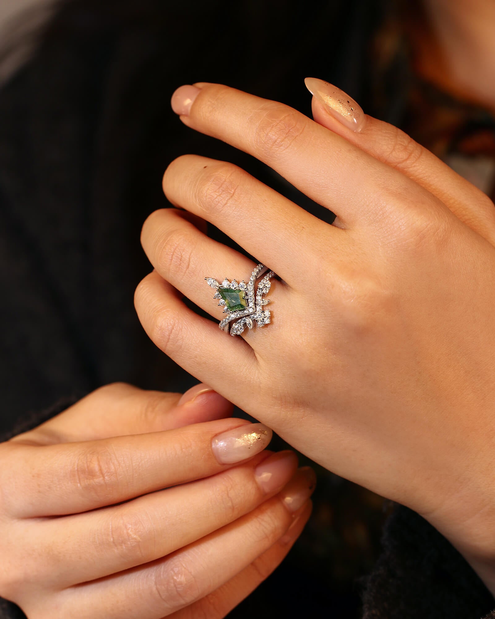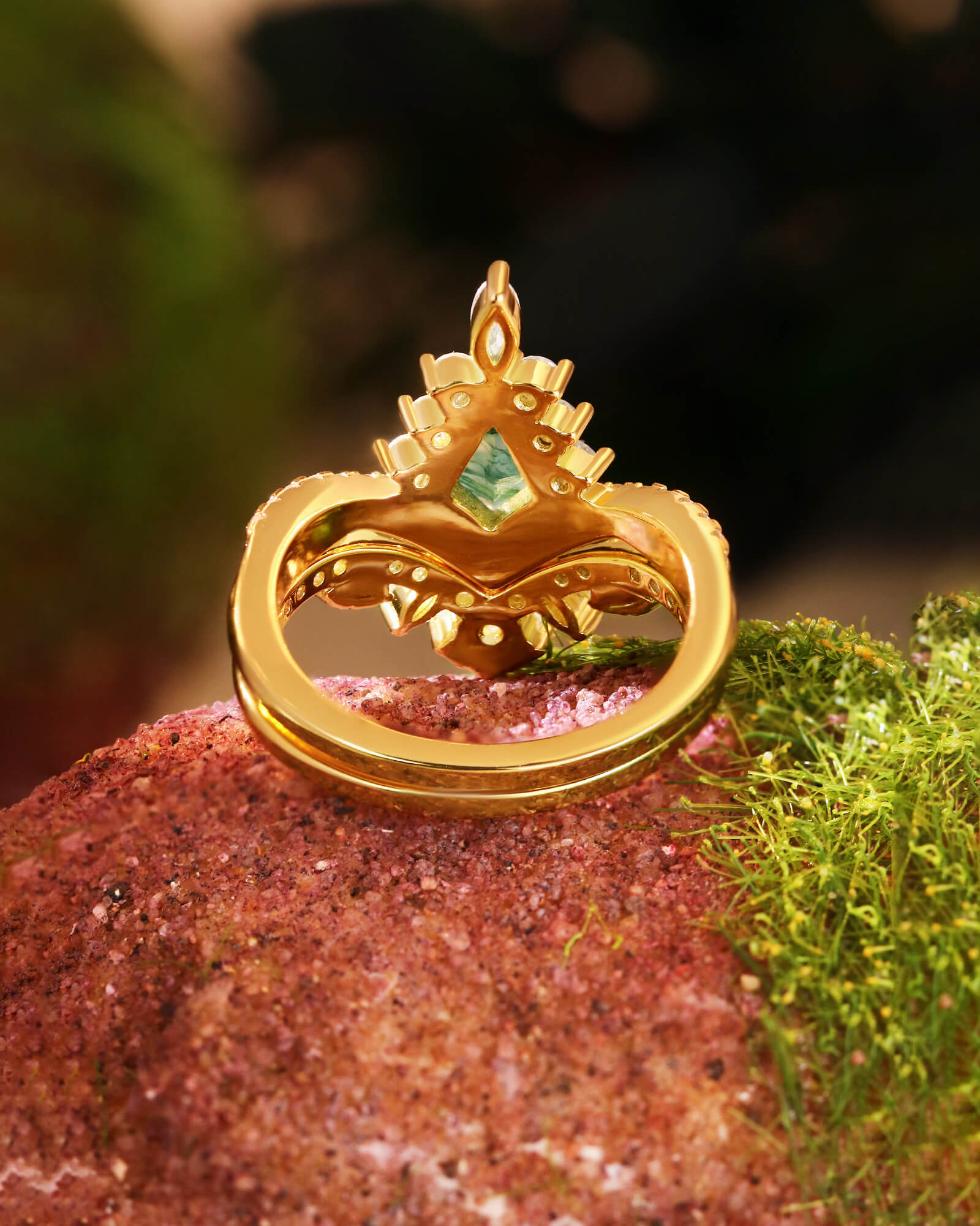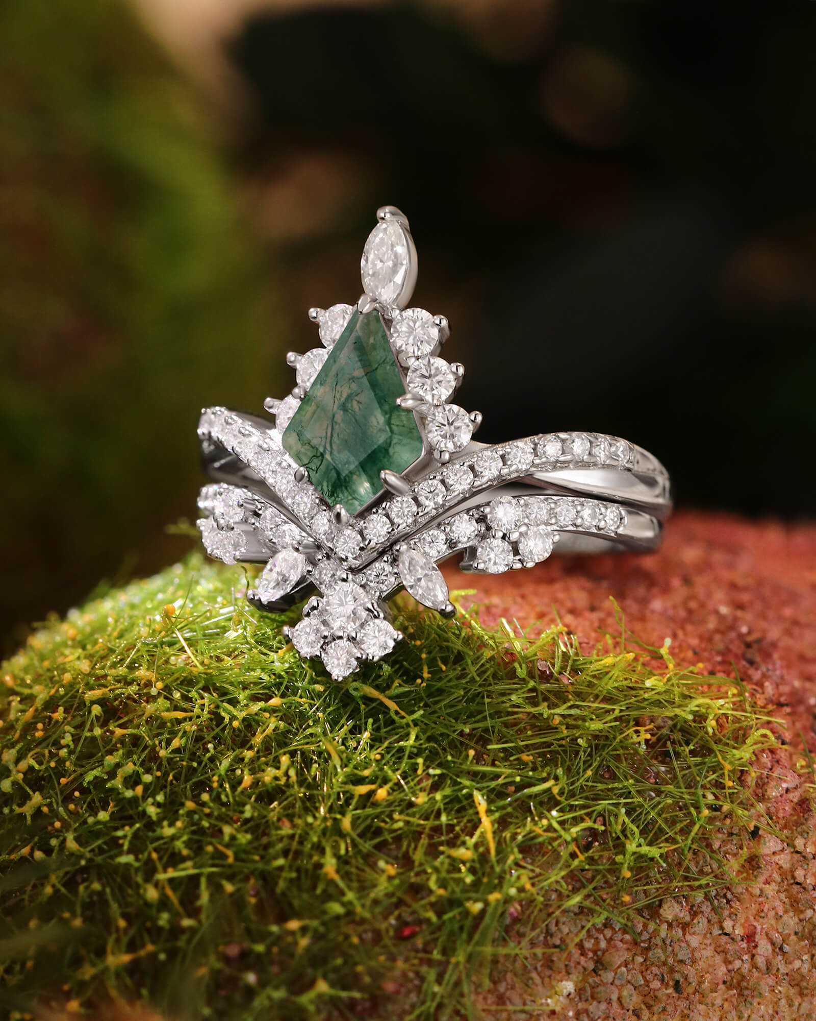 Unique Kite Cut Moss Agate Ring Set 2pcs Wedding Ring Moissanite Halo Art Deco Curved Band Ring Nature Inspired Ring Promise Bridal Anniversary Gift For Her
