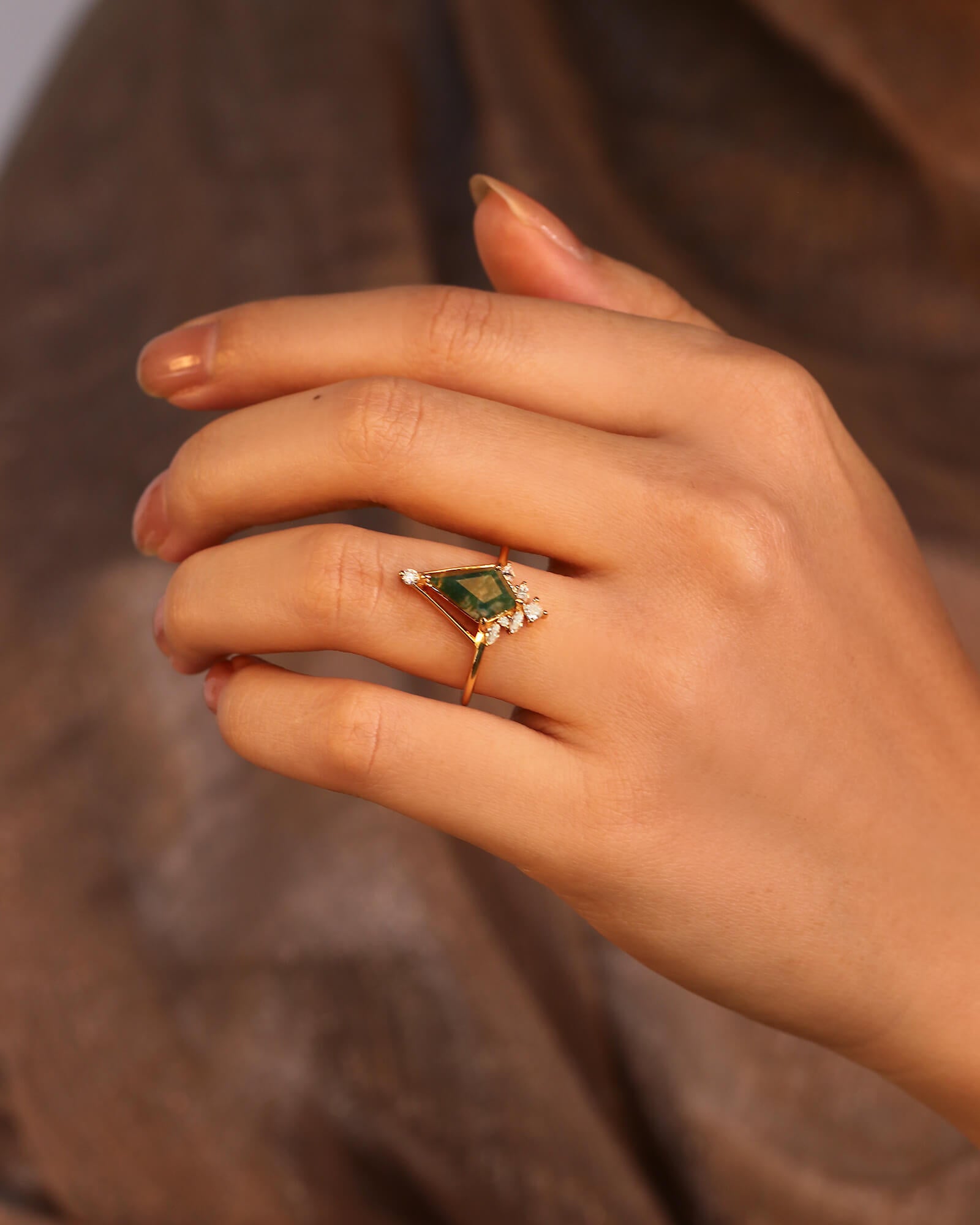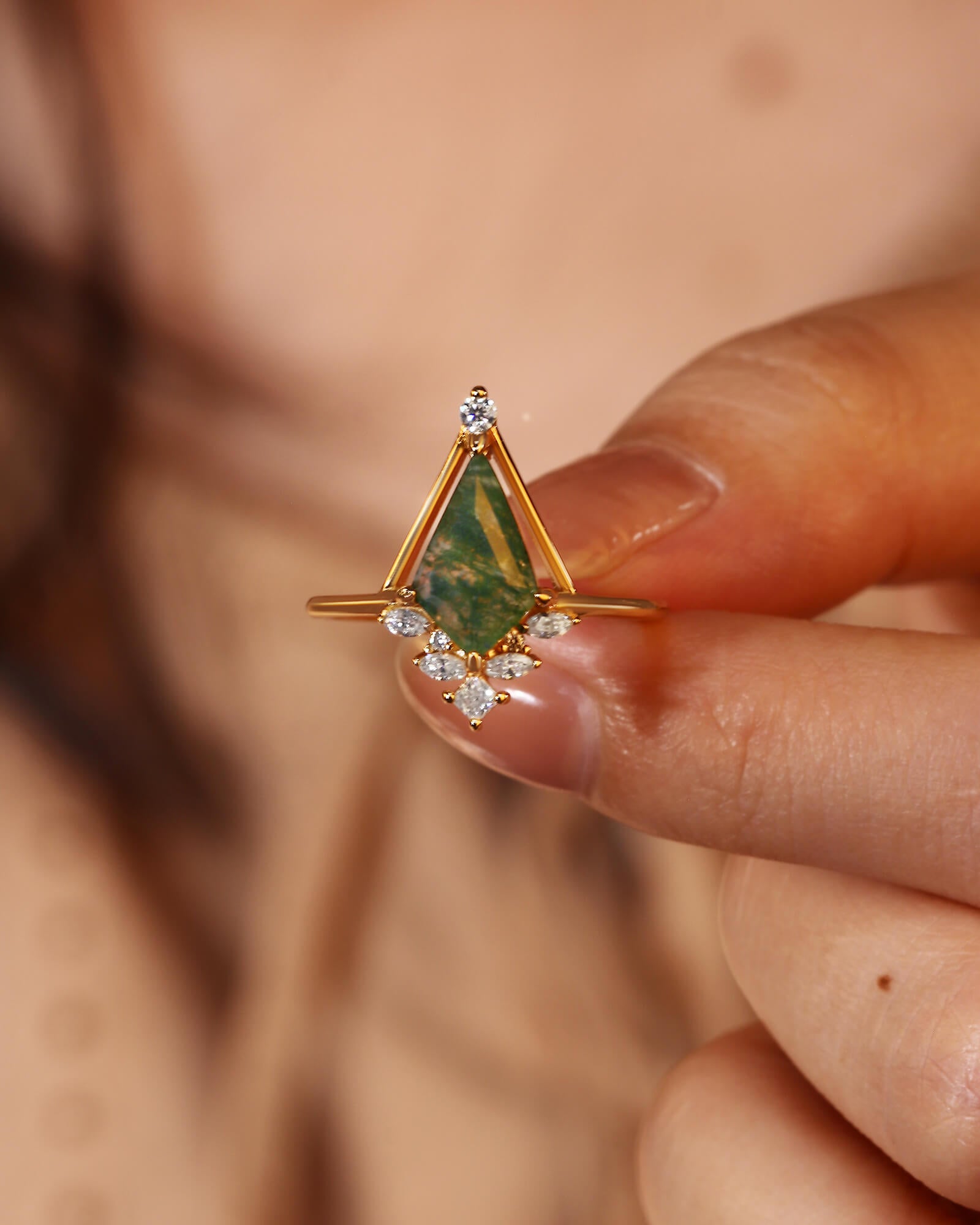 The CEDRUS Moss Agate Ring is a modern piece of jewelry that celebrates the beauty of nature. Its one-of-a-kind center stone is rejuvenating and fresh, providing a stylish yet natural diamond alternative. Blending both vintage and modern Art Deco influences, the CEDRUS ring makes a lovely choice as an engagement ring.