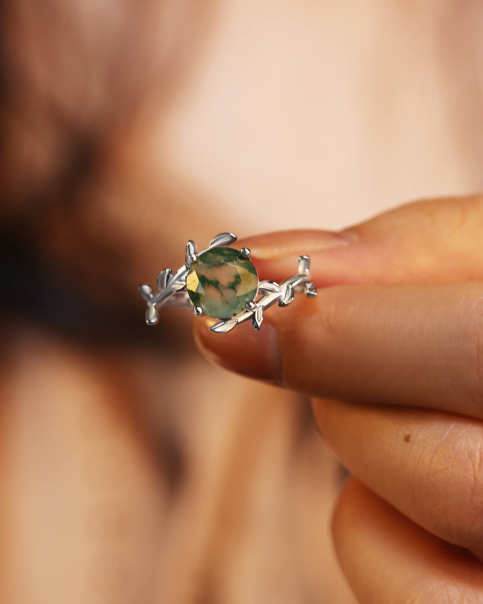 A perfect round moss agate, holding a universe of green within, is cradled by a band of delicate leaf vines. Wear a piece of the enchanted forest, forever in bloom on your hand.