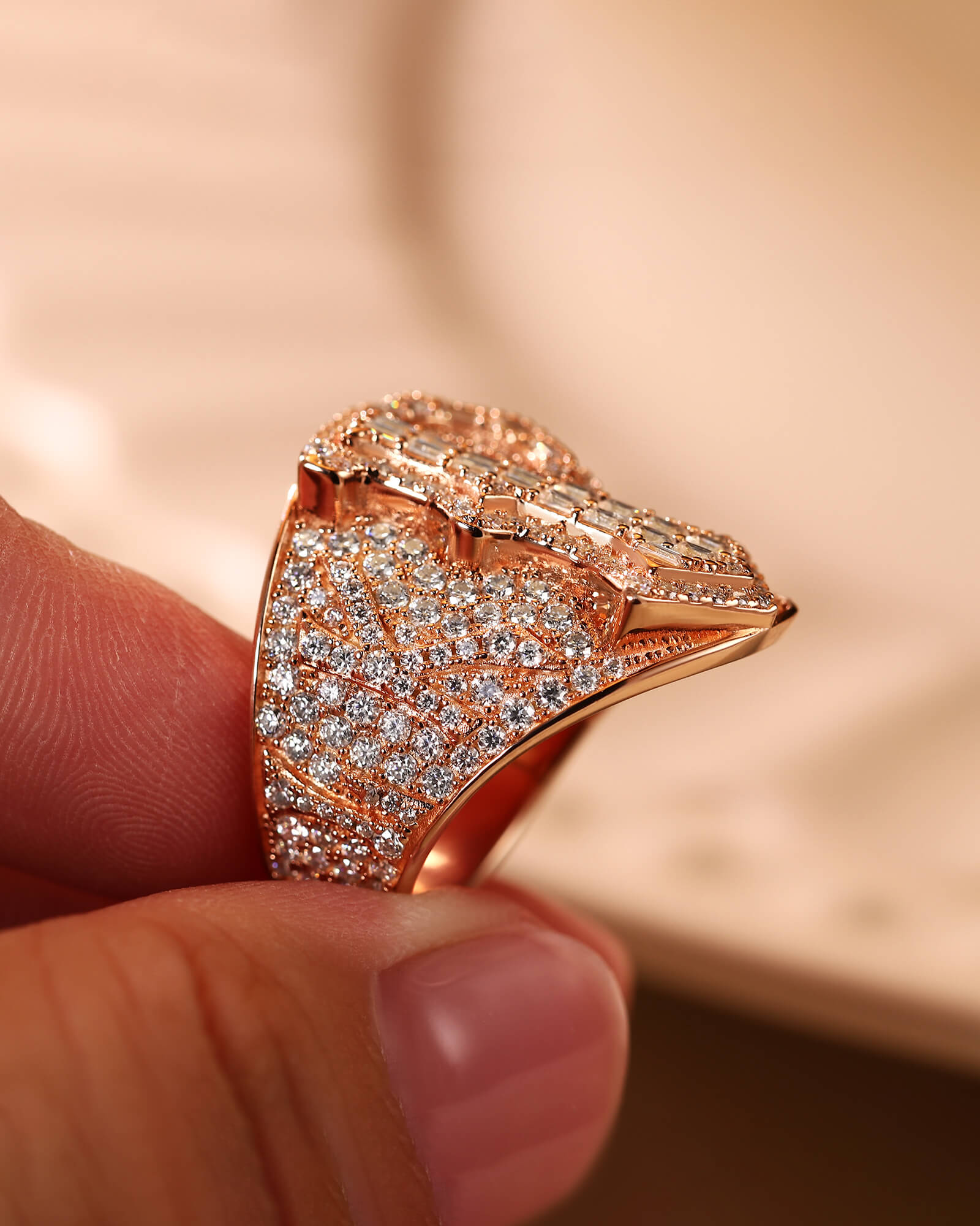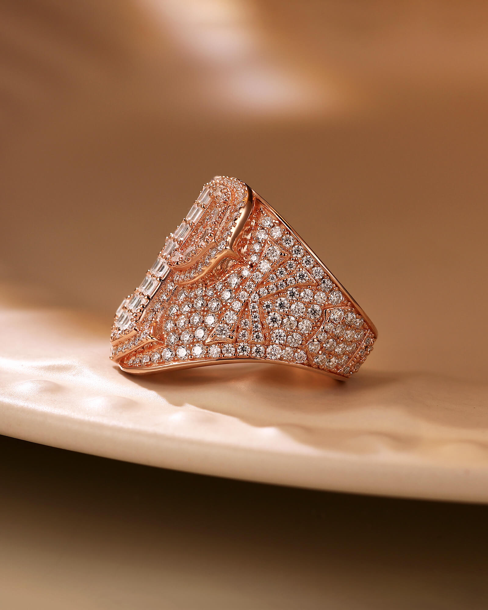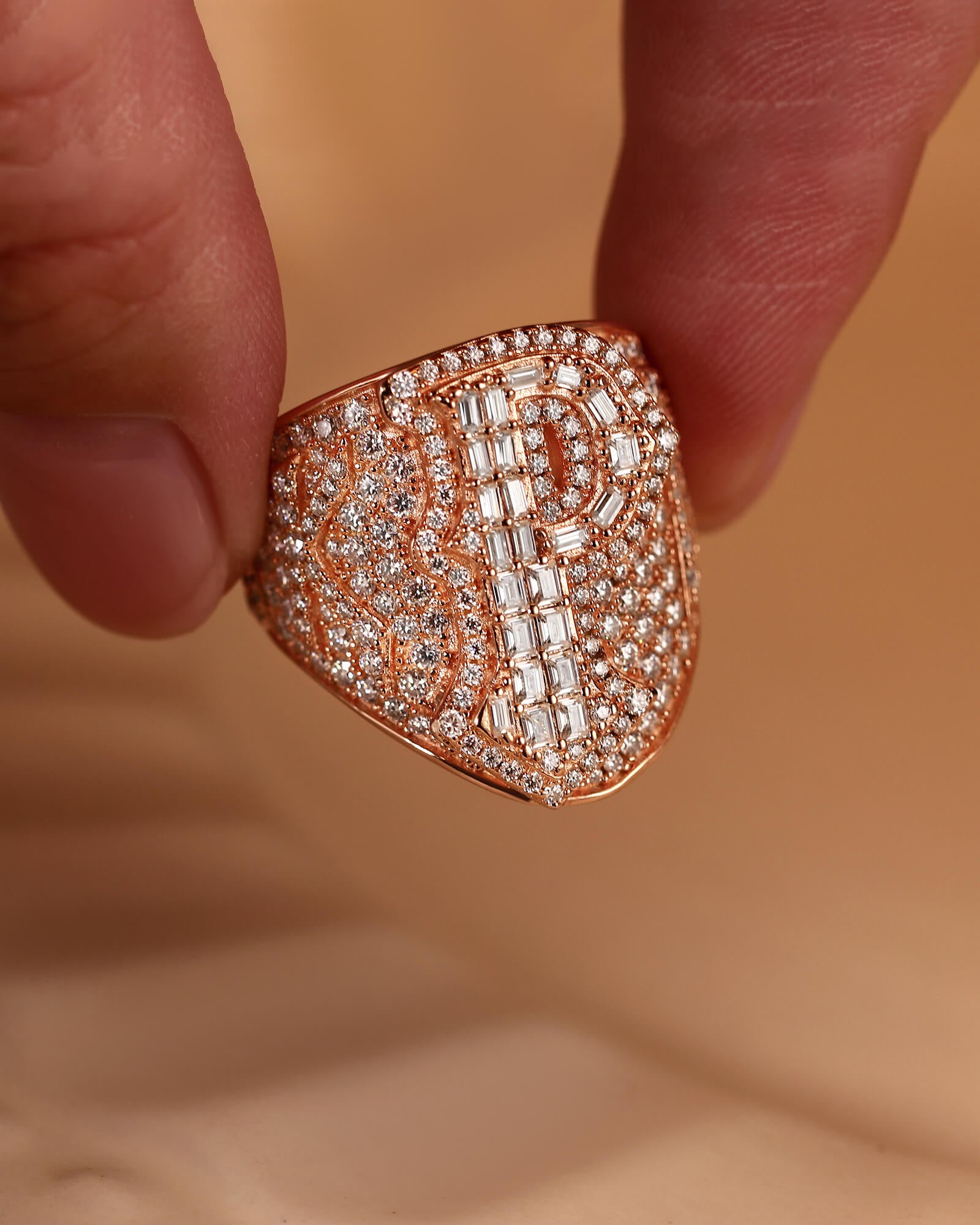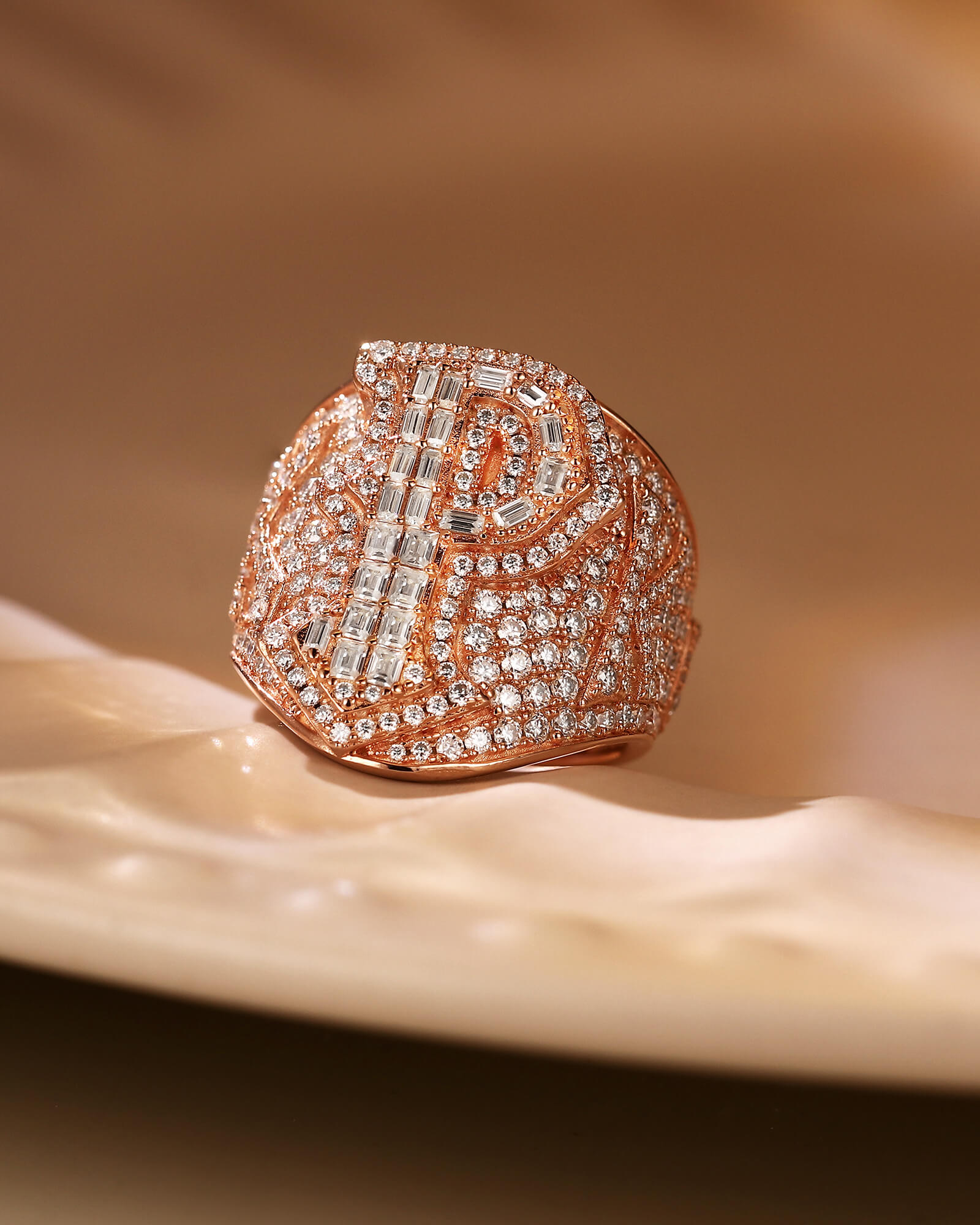 > For the king of your own world. This bold, custom hip-hop ring features a spectacular emerald-cut diamond "P" set in rose gold, surrounded by a blaze of full-cut rounds. Make a statement that's uniquely you.