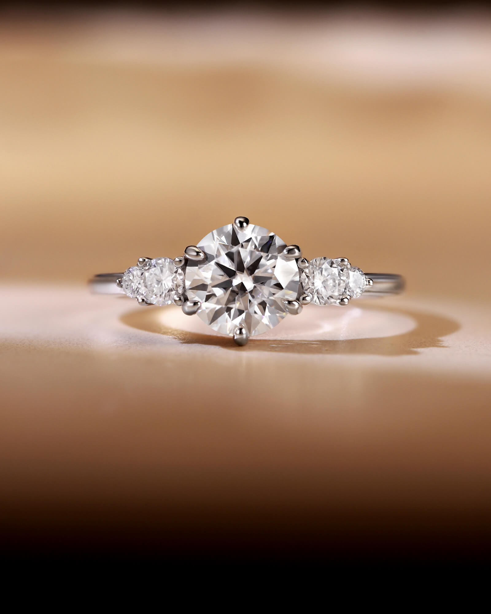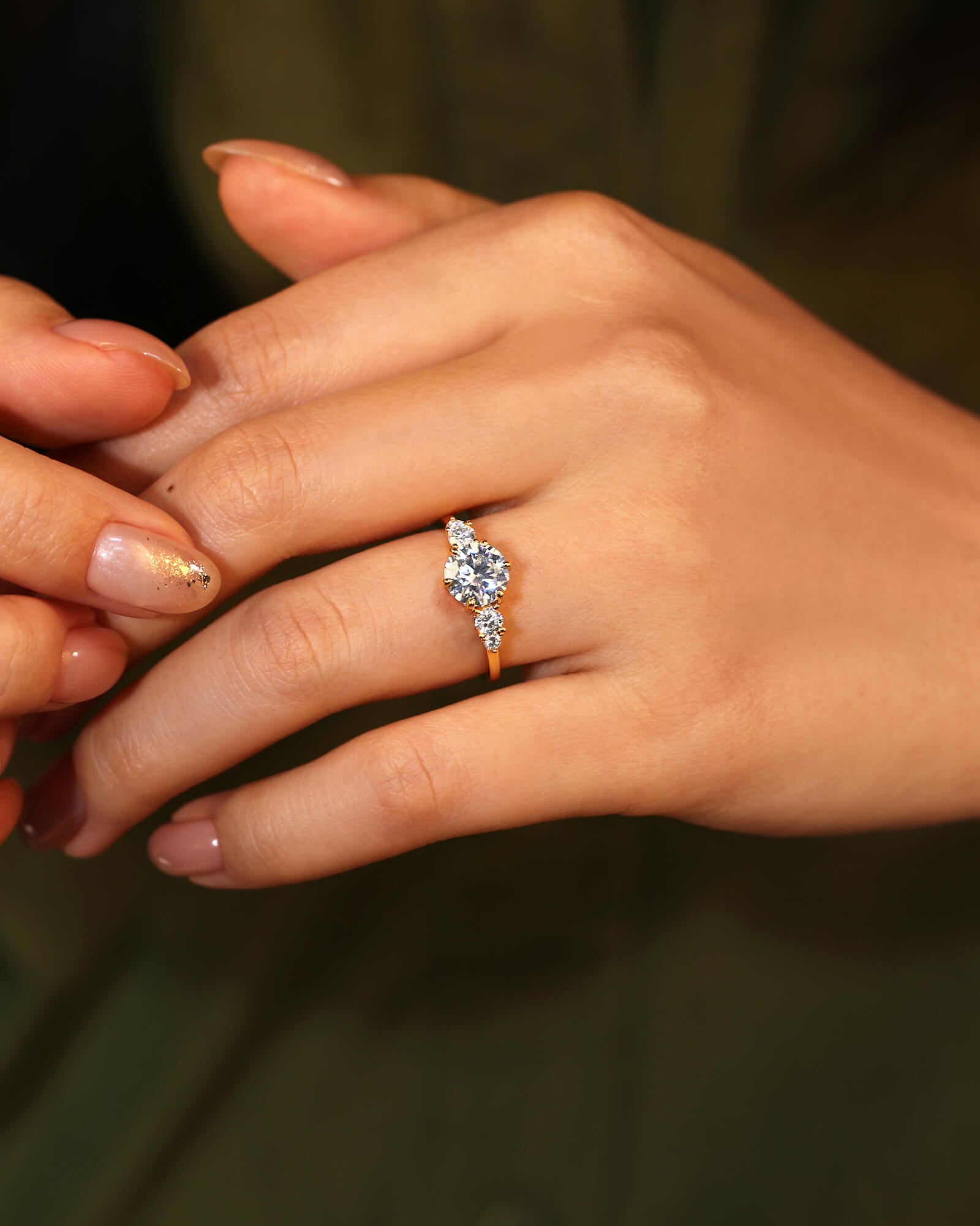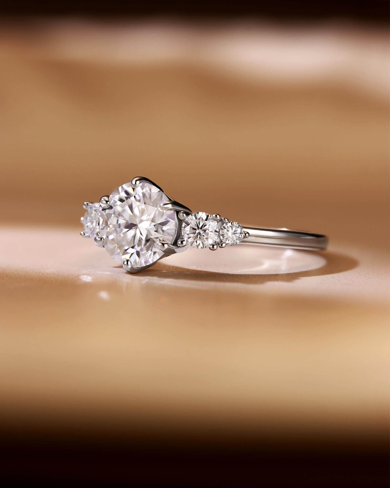 The CONNIE ring features a brilliant round moissanite, elevated by an artistic arrangement of graduated side stones. A fresh take on timeless elegance.