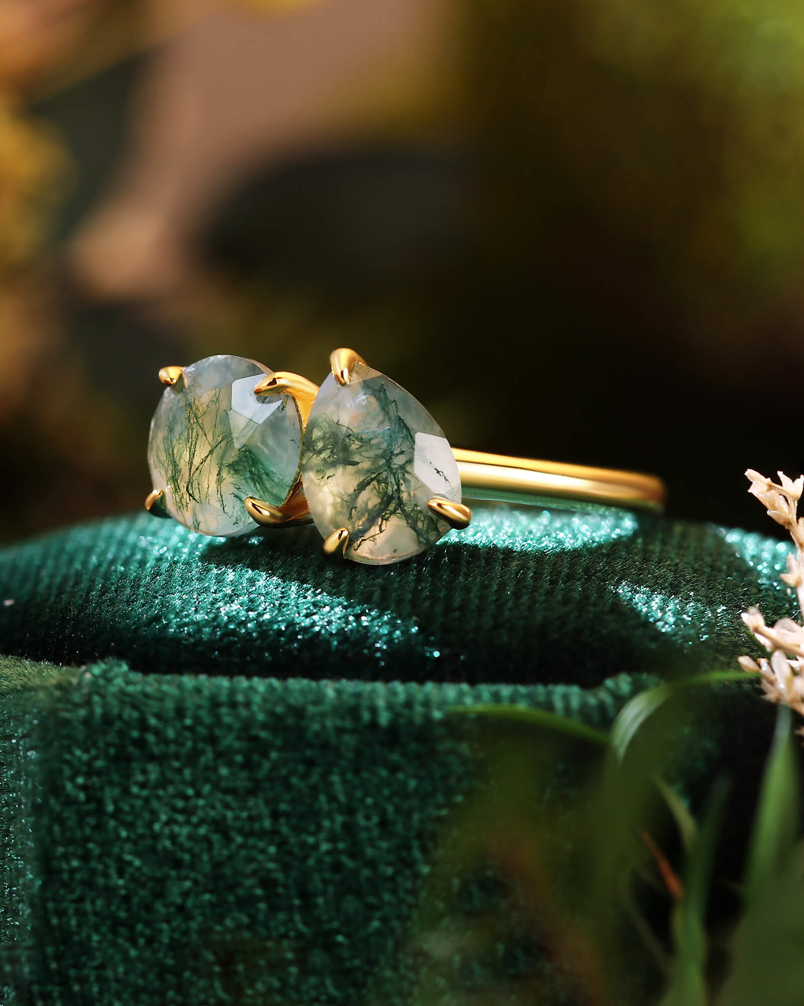 The ELRIAN ring presents a captivating dialogue between completeness and growth through the timeless Toi et Moi design. It features a round cut moss agate, a symbol of wholeness, eternity, and the cyclical nature of life, placed in perfect counterpoint with a pear cut moss agate, representing direction, growth, and the beautiful journey forward. Each stone showcases unique moss-like inclusions, making every ring a one-of-a-kind masterpiece.