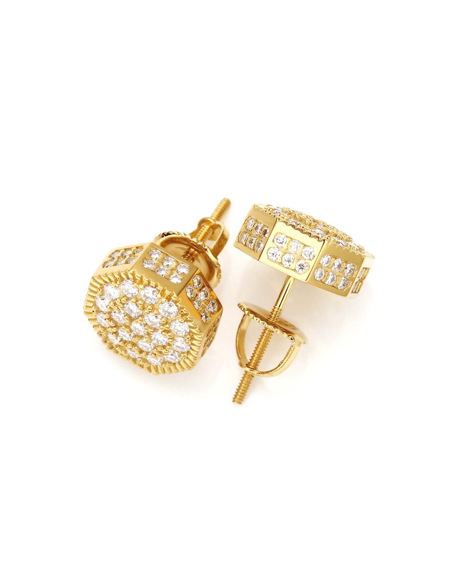 The ESTHER earrings are a masterful synthesis of architectural strength and radiant detail. Presented as a substantial 10mm octagon, the design is immediately defined by a precise 1.5mm grooved metal frame that adds a clean, contemporary edge and captivating depth. The entire central area within this frame is meticulously paved with brilliant round cut diamonds, creating a continuous surface of scintillating light.