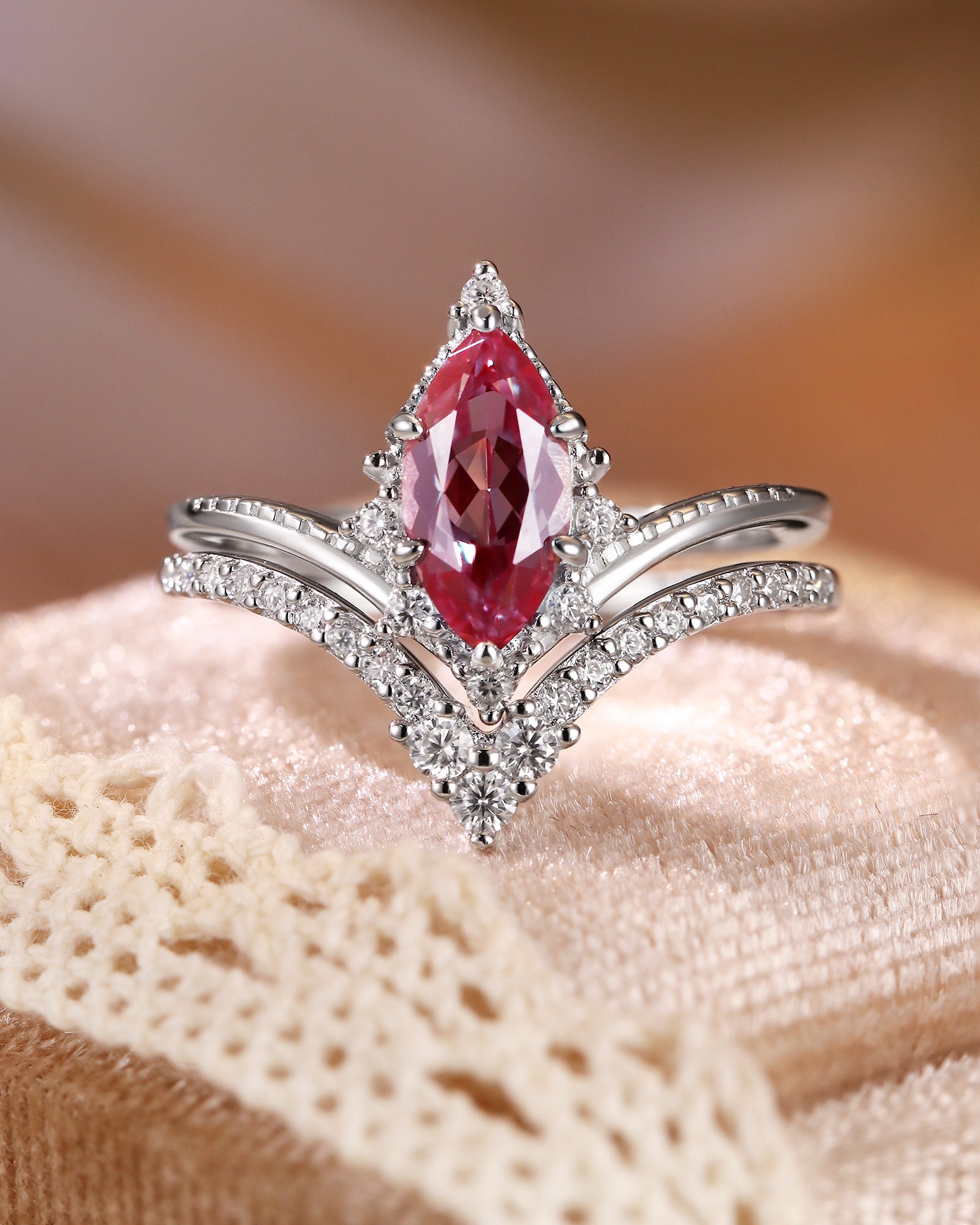 Art Deco Marquise Cut Alexandrite Ring Set 2pcs Wedding Ring Moissanite Curved Band Ring Color Change Ring Promise Bridal Anniversary Gift For Her
