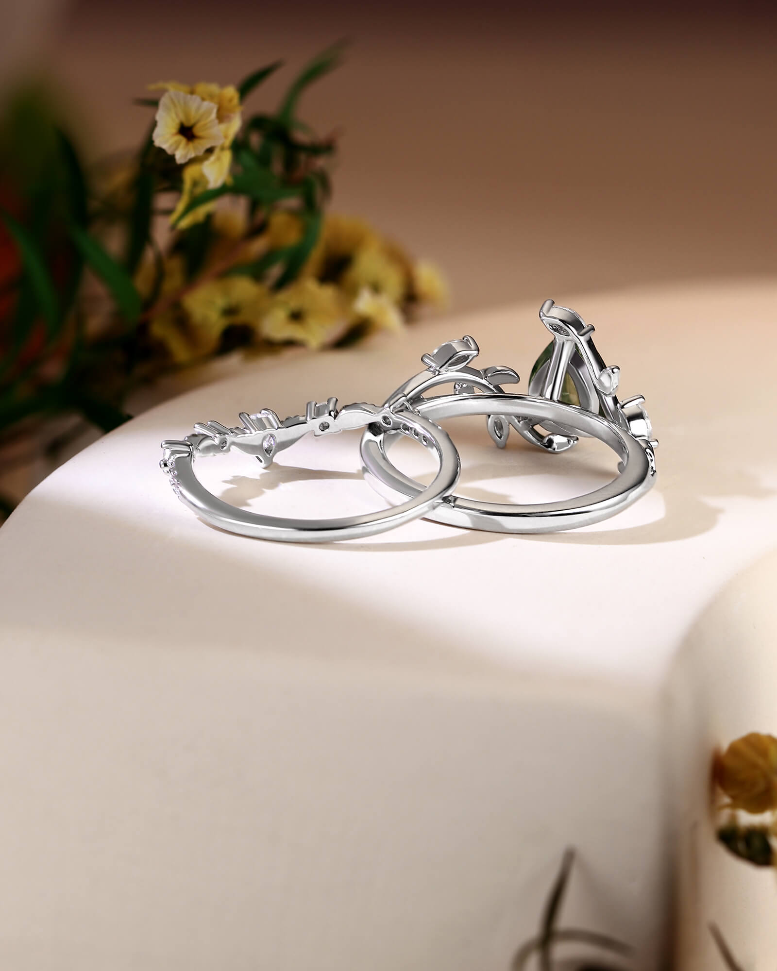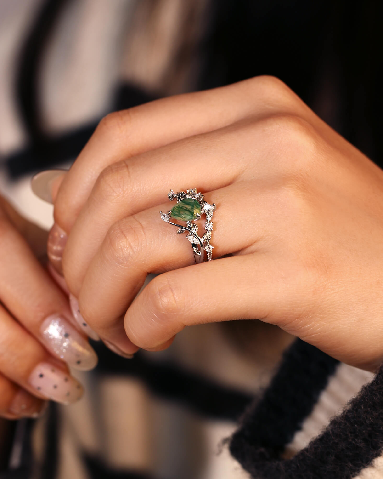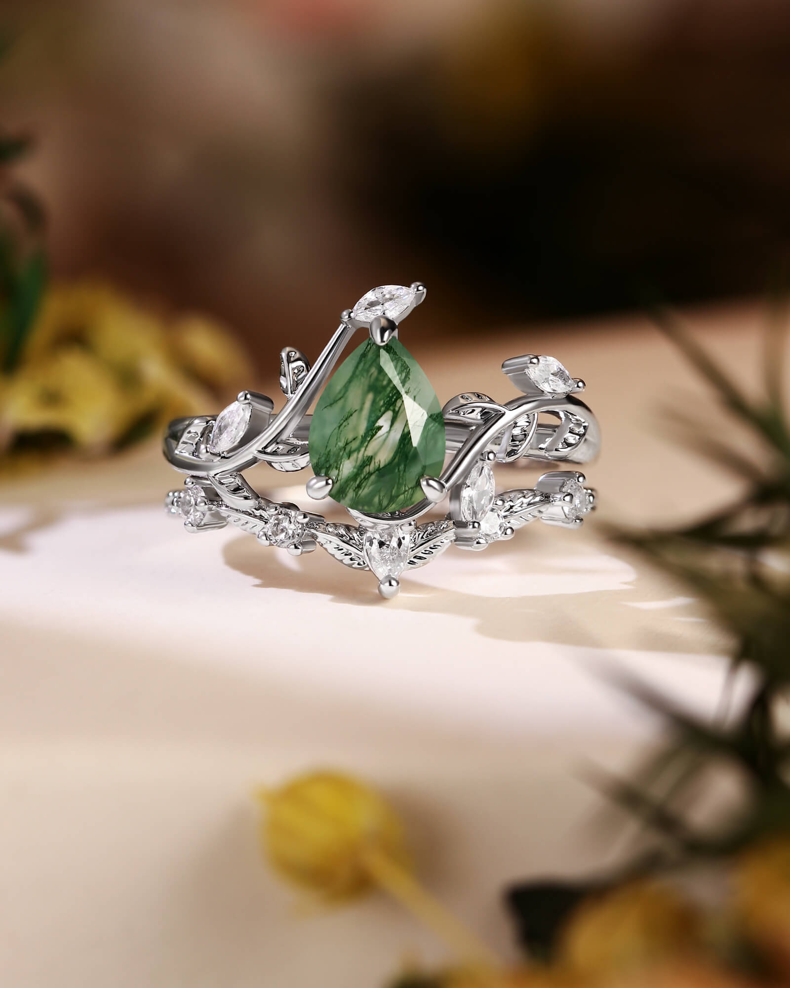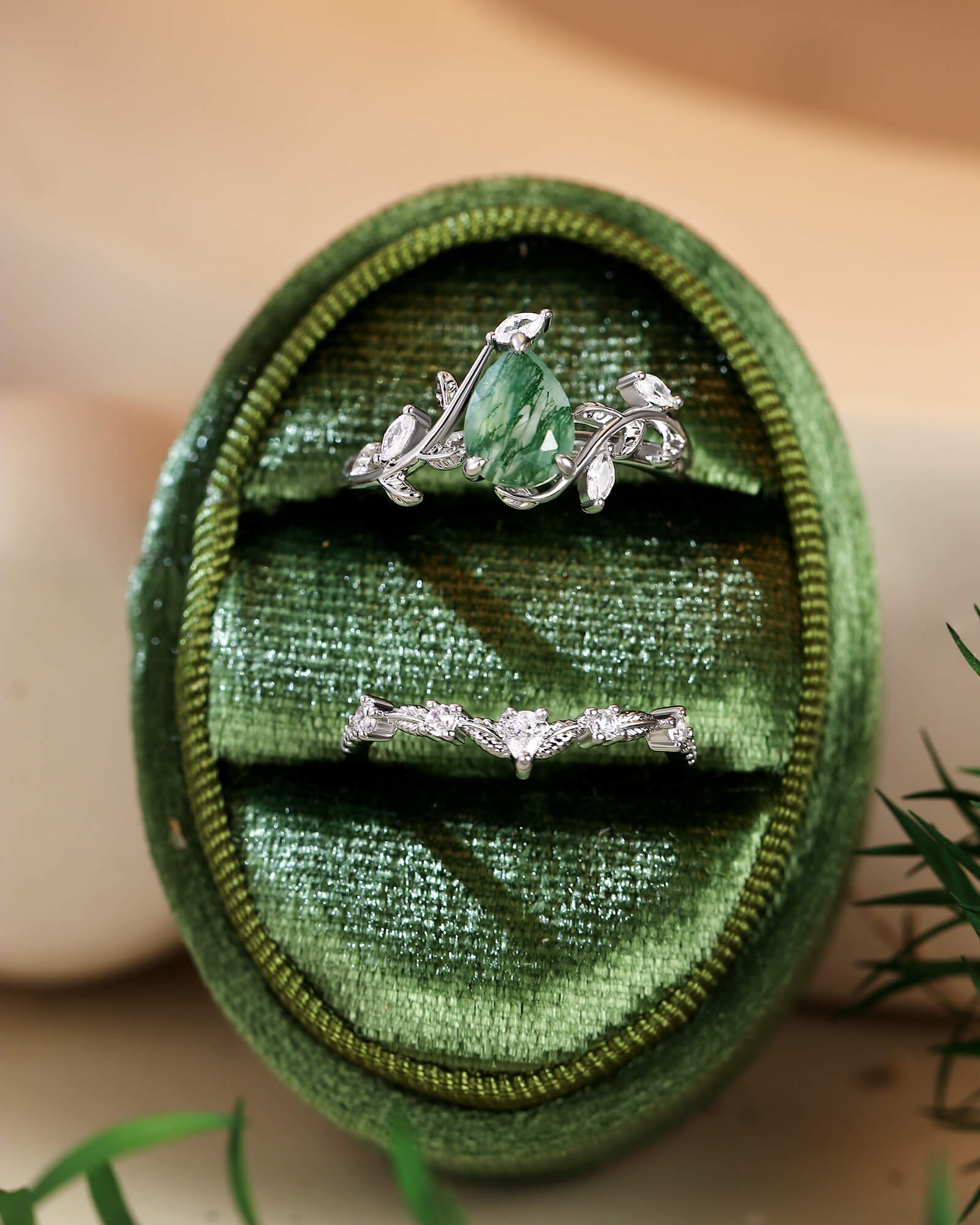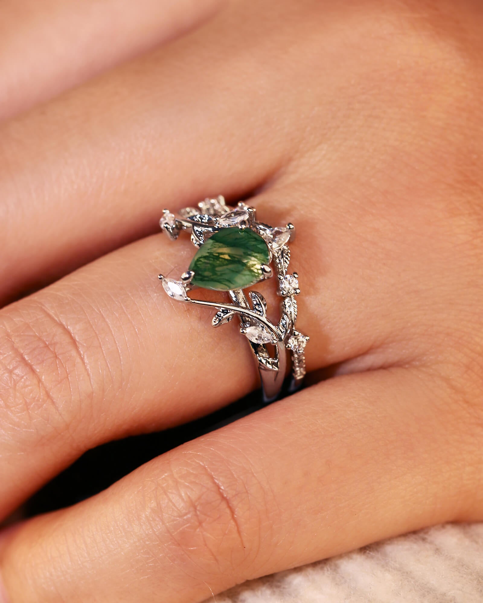 A pear cut moss agate, like a teardrop from the forest, is cradled by sculpted vines. Paired with a textured leaf band, this set captures the full cycle of growth—from a single, precious beginning to a lifetime of intertwined beauty.