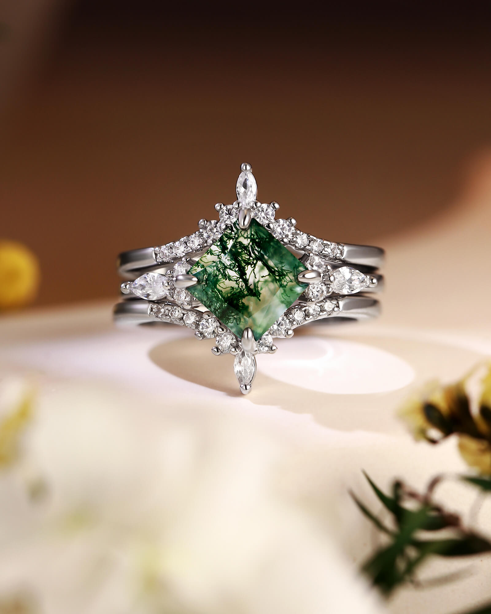 A serene green moss agate, cut with royal precision, is embraced by two curved rivers of diamond light. This three-piece set is a complete woodland sonata for your finger—rooted, radiant, and beautifully layered.