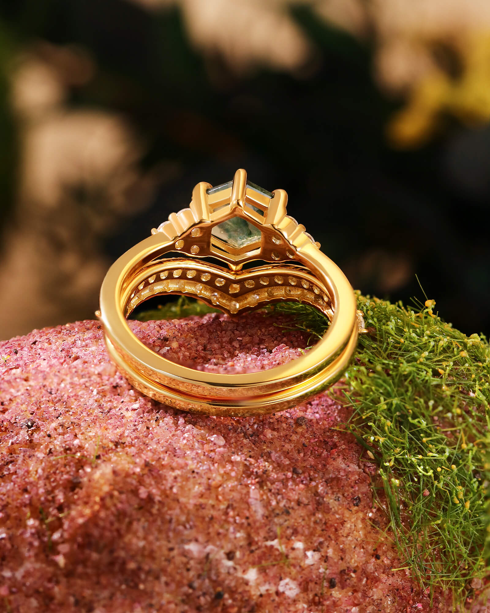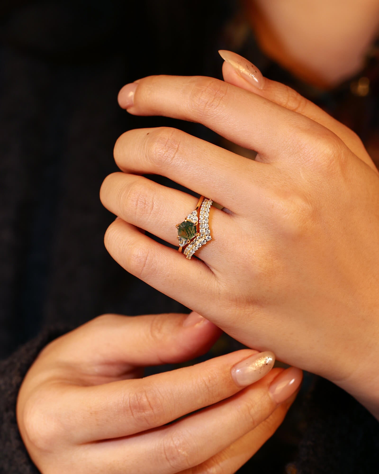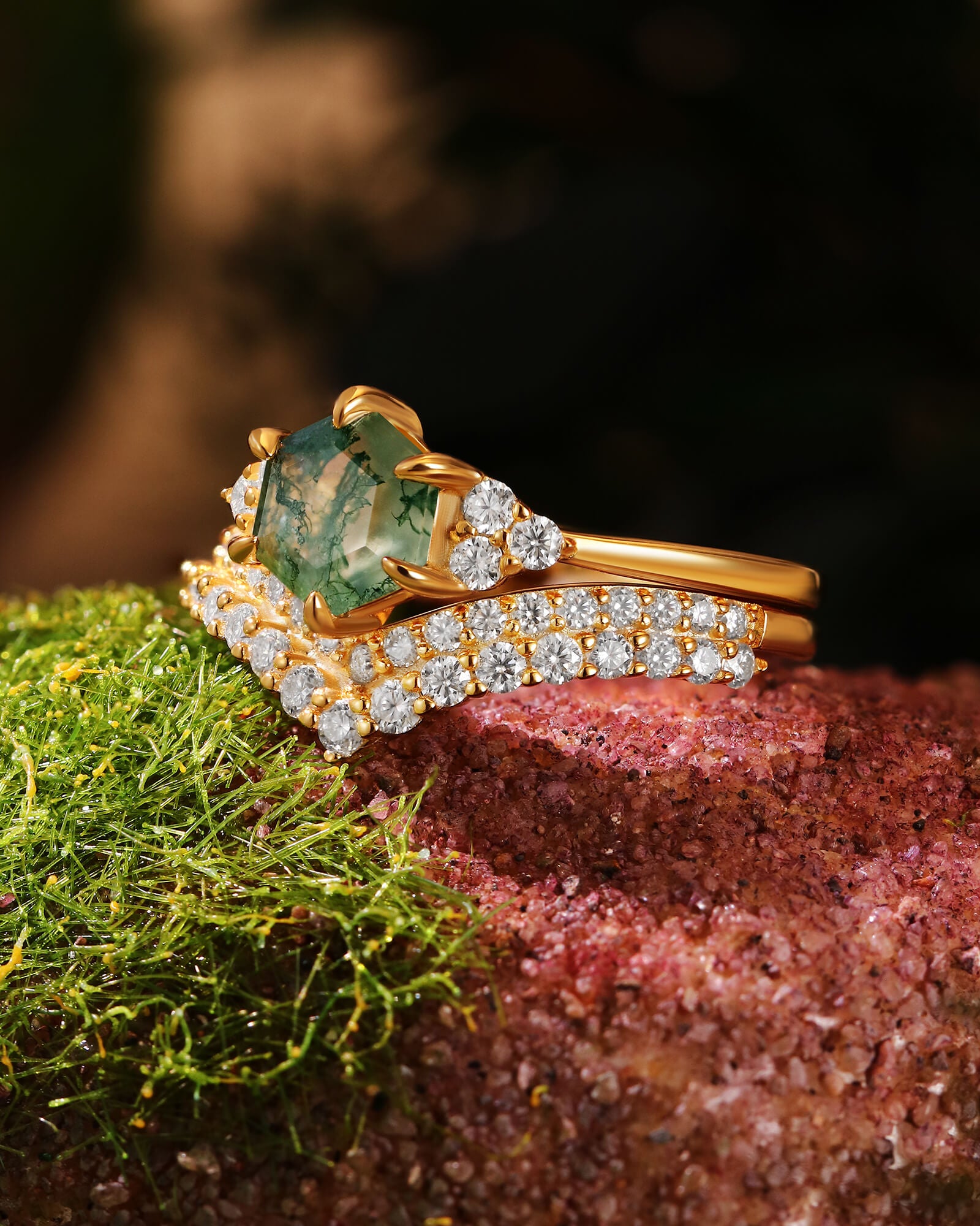 Unique Hexagon Cut Moss Agate Ring Set 2pcs Wedding Ring Moissanite Double Curved Band Ring Nature Inspired Ring Promise Bridal Anniversary Gift For Her
