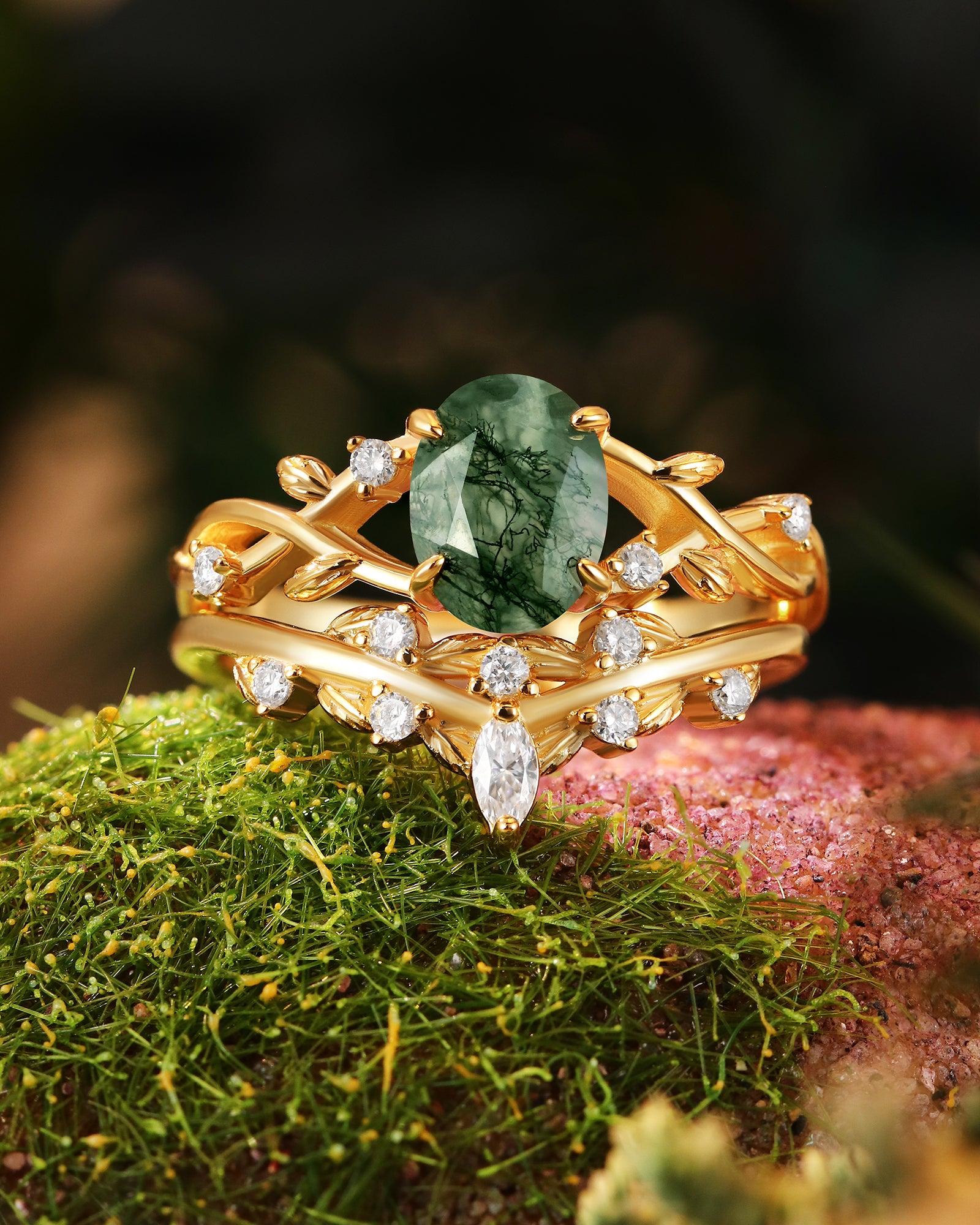 Unique Oval Cut Moss Agate Ring Set 2pcs Wedding Ring Moissanite Leaves Curved Band Ring Nature Inspired Ring Promise Bridal Anniversary Gift For Her