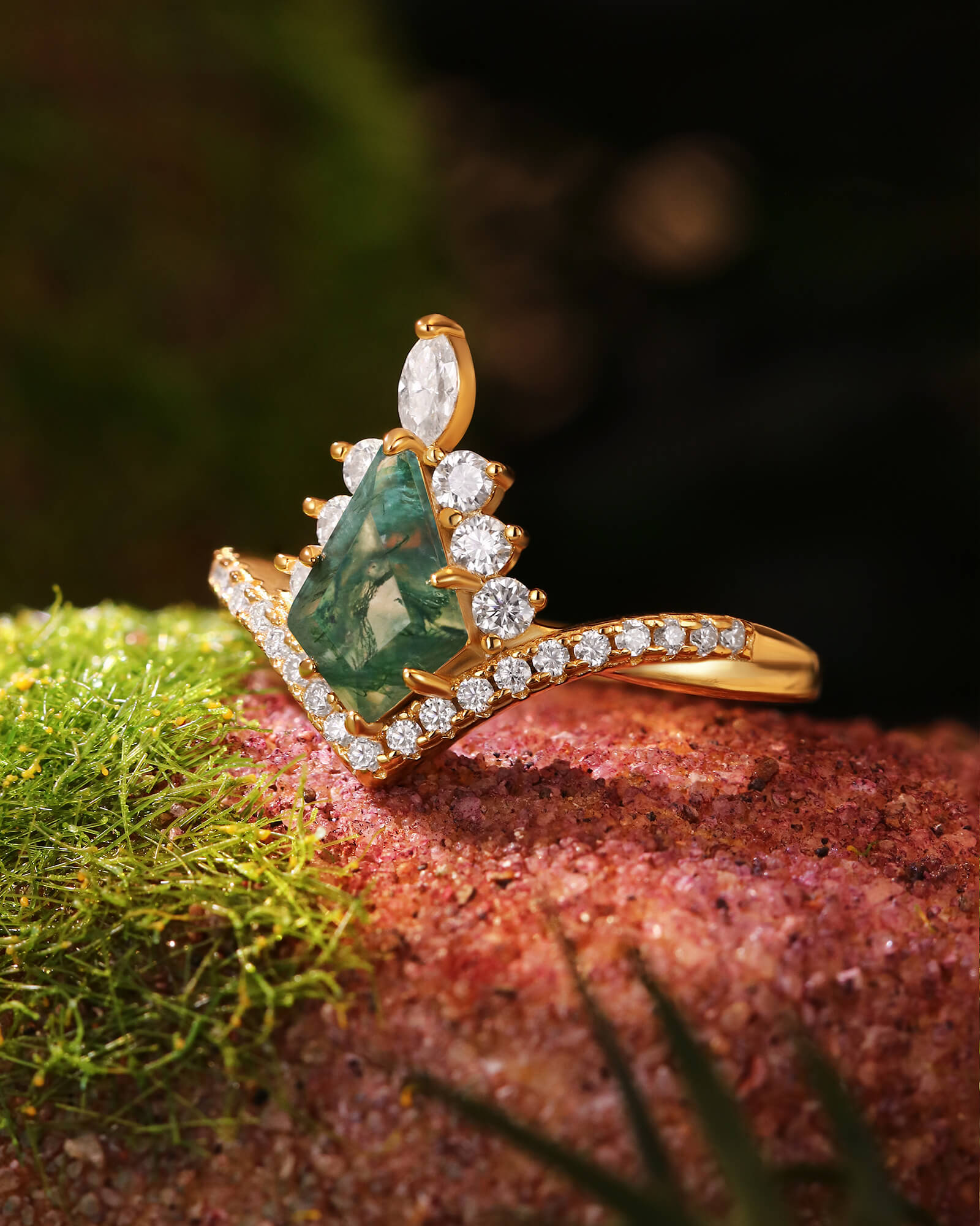 Unique Kite Shaped Moss Agate Engagement Ring Moissanite Art Deco Curved Halo Ring Nature Inspired Promise Bridal Anniversary Gift For Her