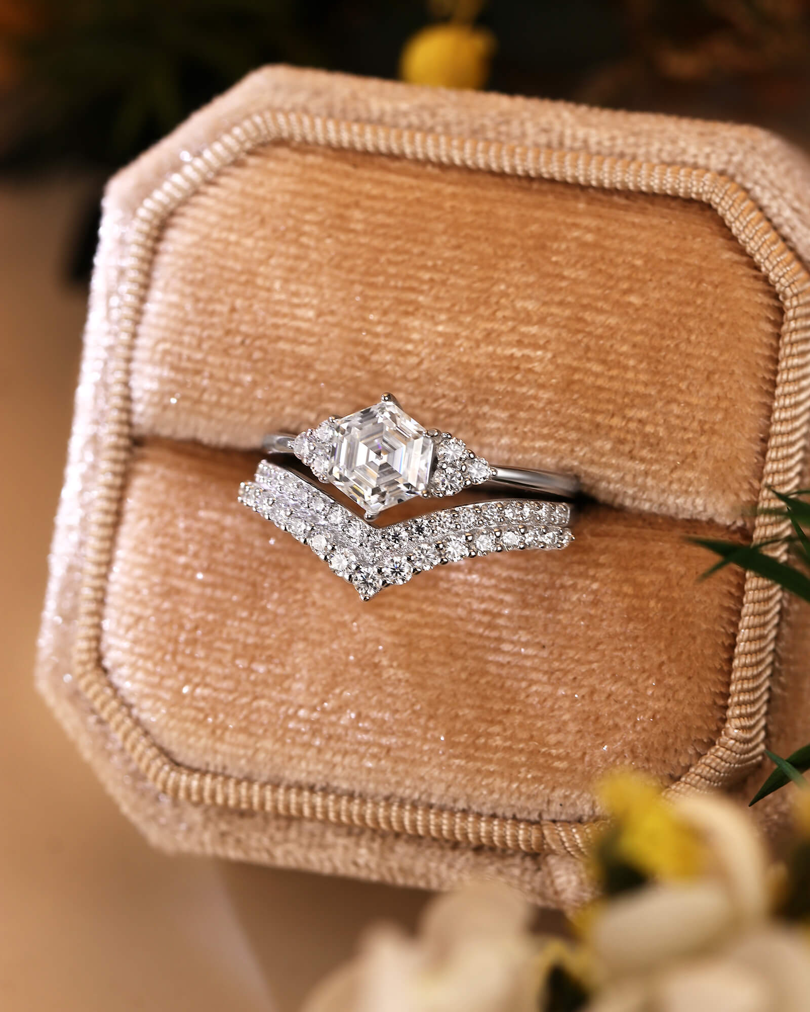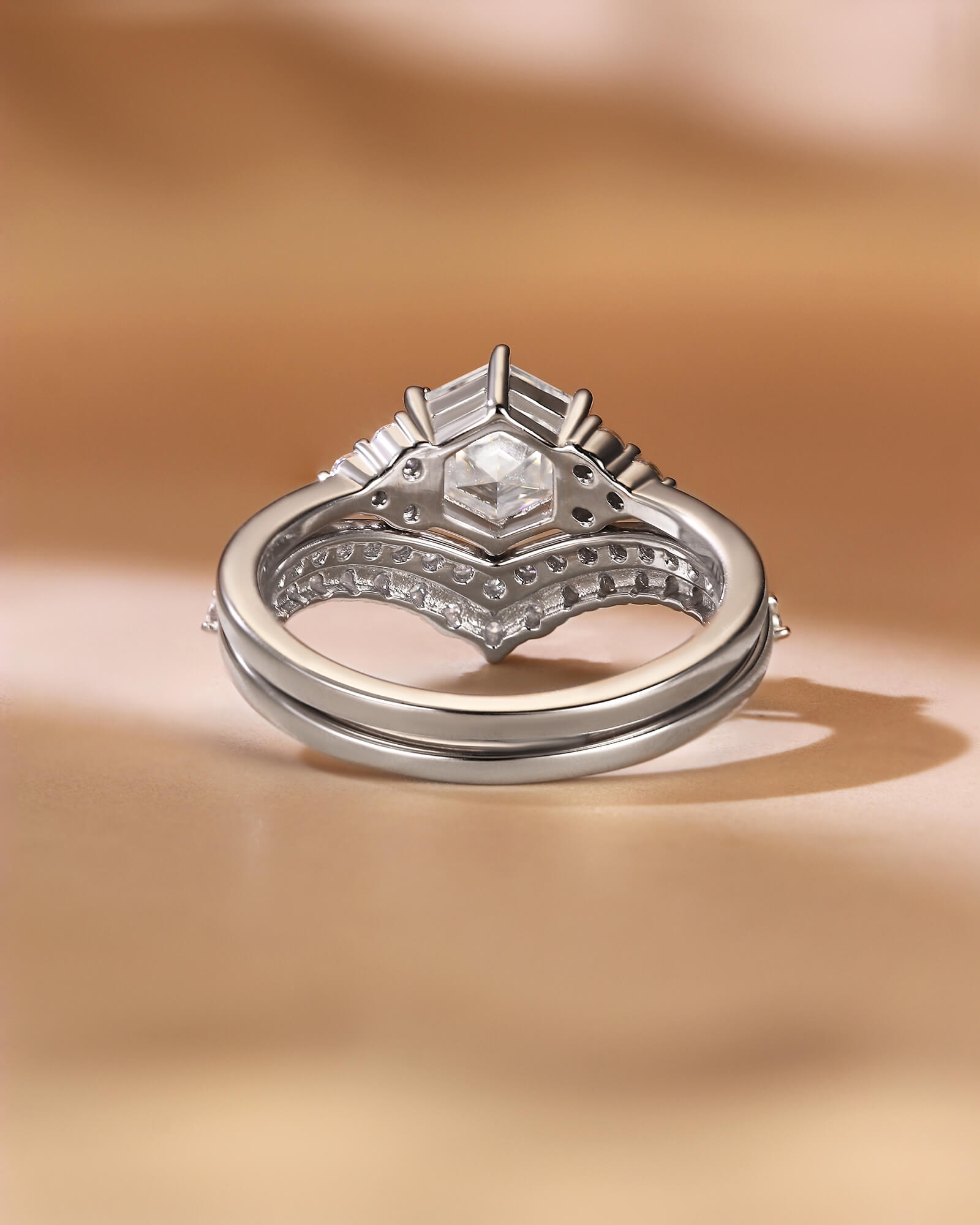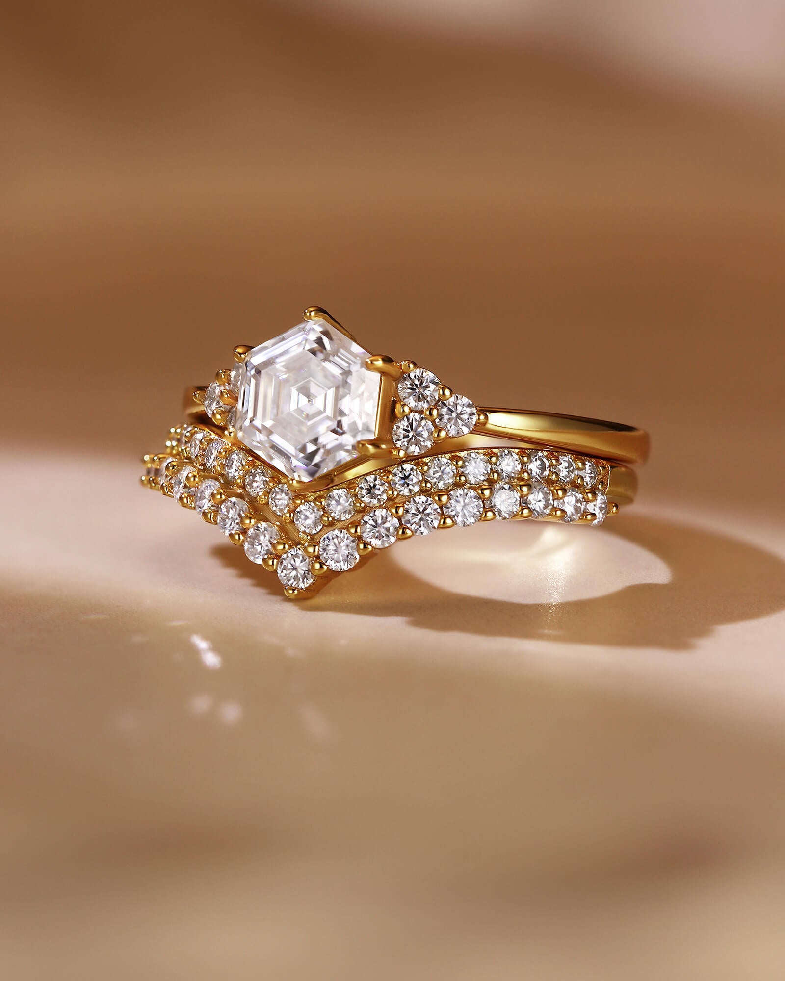 A striking hexagon-cut moissanite takes center stage, embraced by two gracefully curved bands paved with diamonds. This set is a modern symphony of angles and arcs, structure and flow.