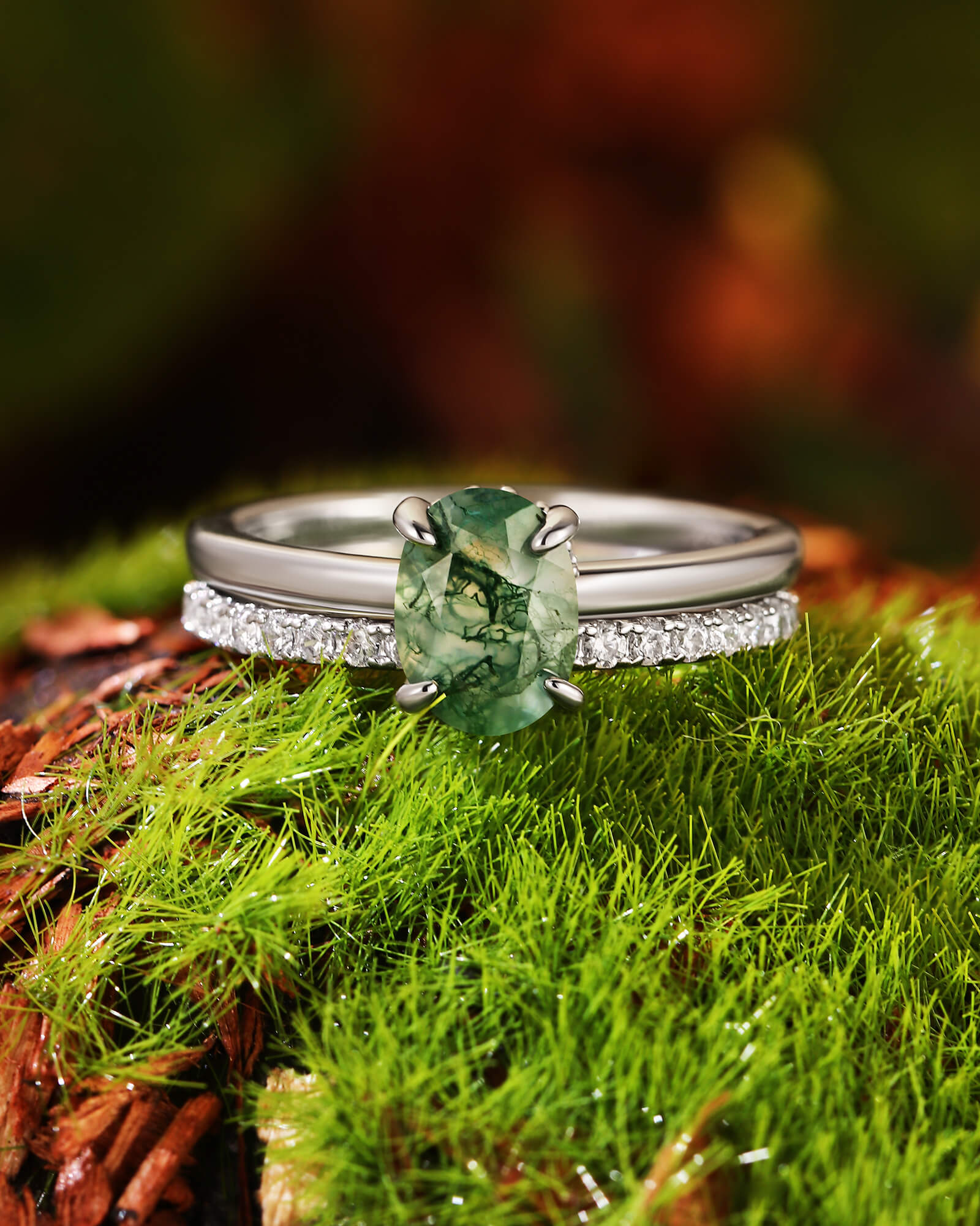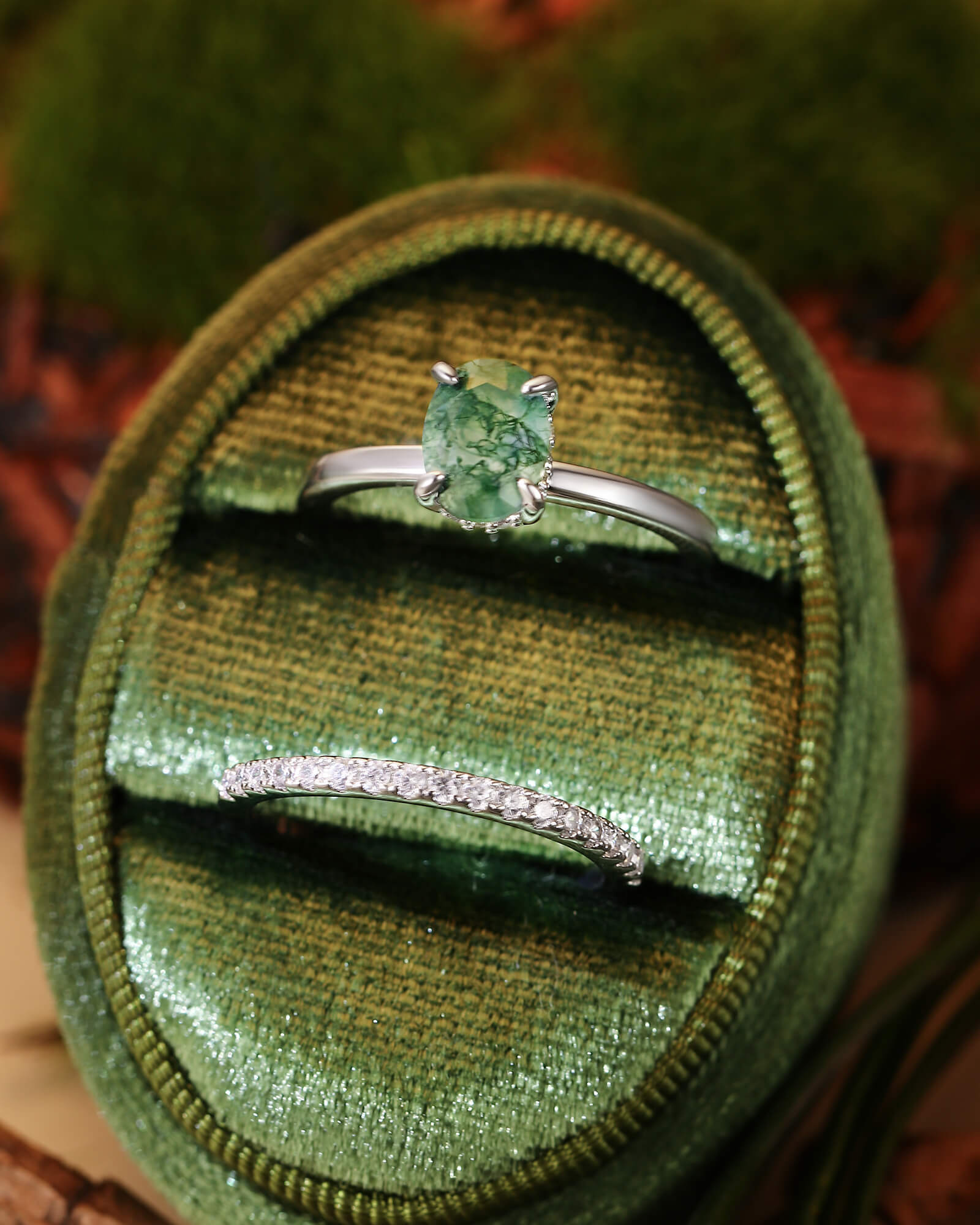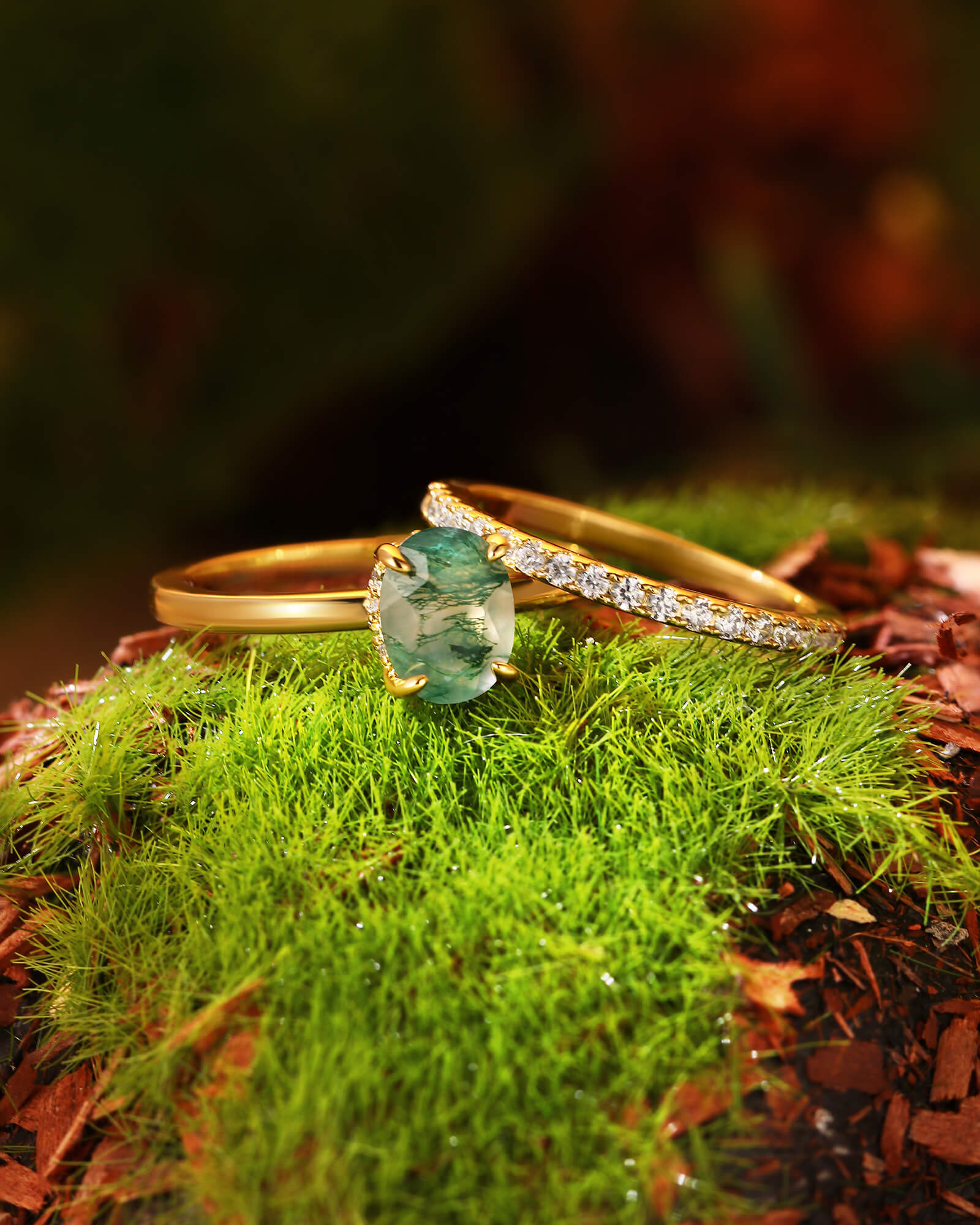 GOLDIE is a bridal set built on harmony—an oval moss agate holding ancient forests, a hidden basket of diamonds glowing from below, and a half-pavé band that catches light with every movement.
