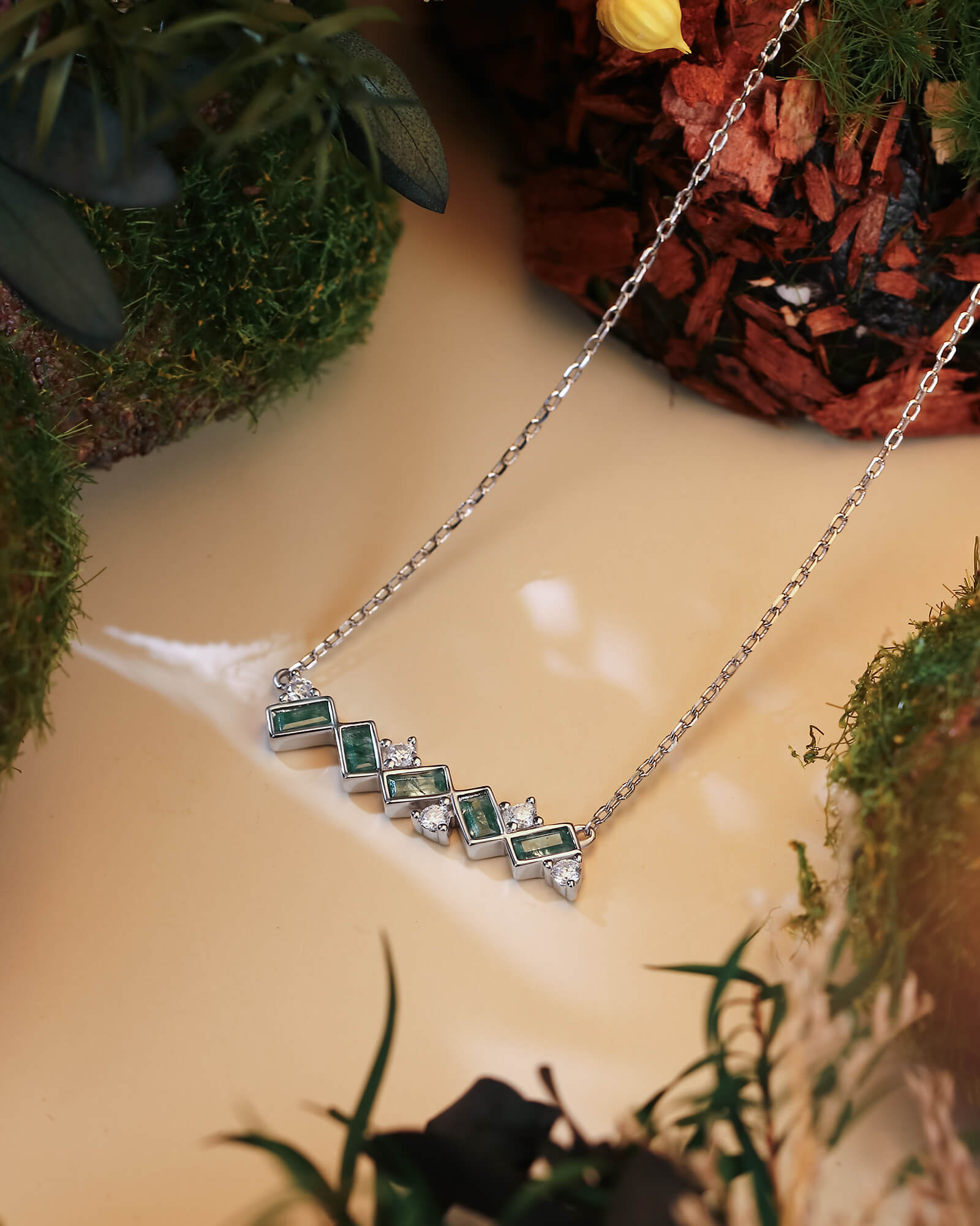 The ILEAN necklace is a wearable ode to fluidity and organic beauty. At its heart, five carefully selected moss agates are set horizontally in a gentle, undulating wave, each stone showcasing its own unique landscape of mossy green inclusions. This seamless flow evokes the quiet rhythm of a meandering stream or rolling hills at dusk.