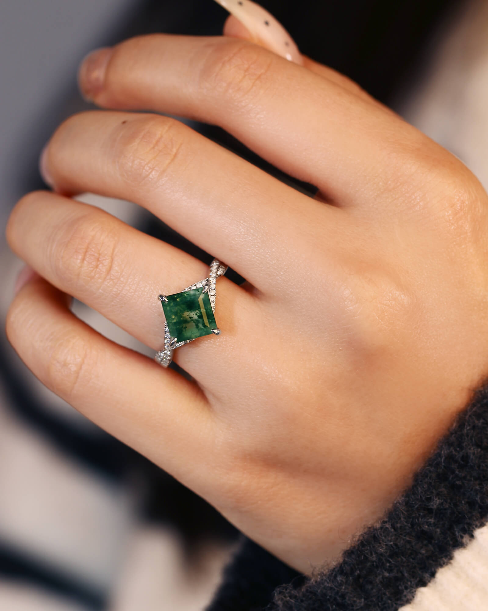 Square Shaped Moss Agate Engagement Ring Moissanite Pave Crossover Shank Ring Nature Inspired Ring Promise Bridal Anniversary Gift For Her