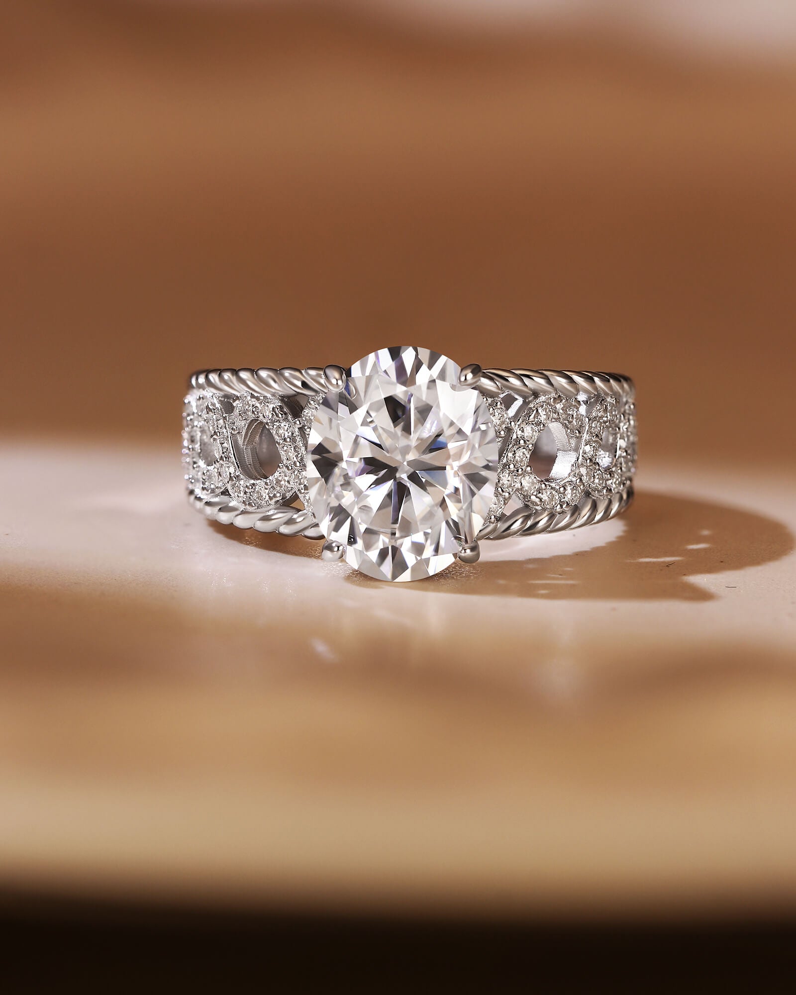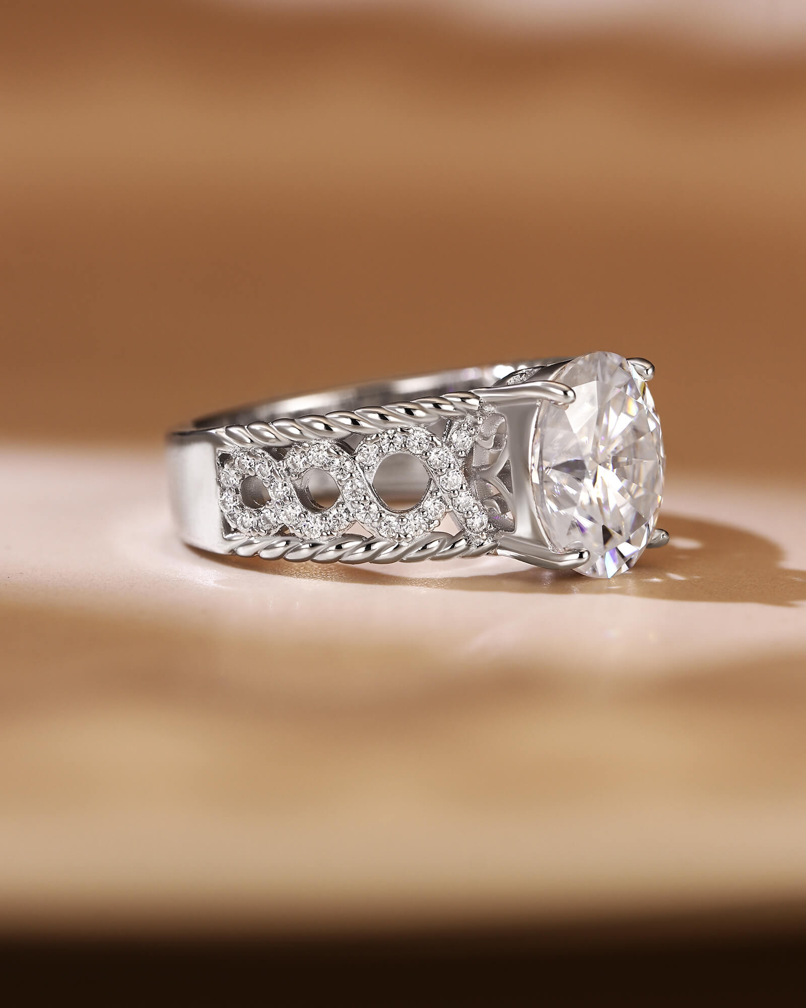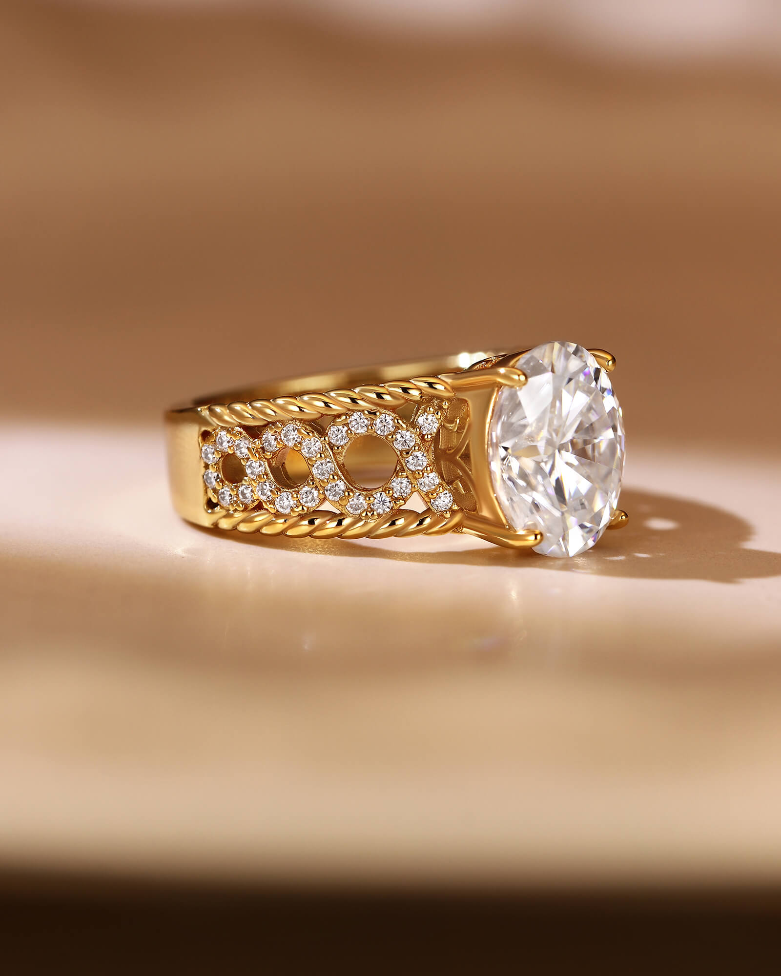 A statement-wide band, engraved with the timeless infinity symbol, cradles a serene oval moissanite. This ring merges architectural strength with eternal symbolism for a love that is both powerful and infinite.