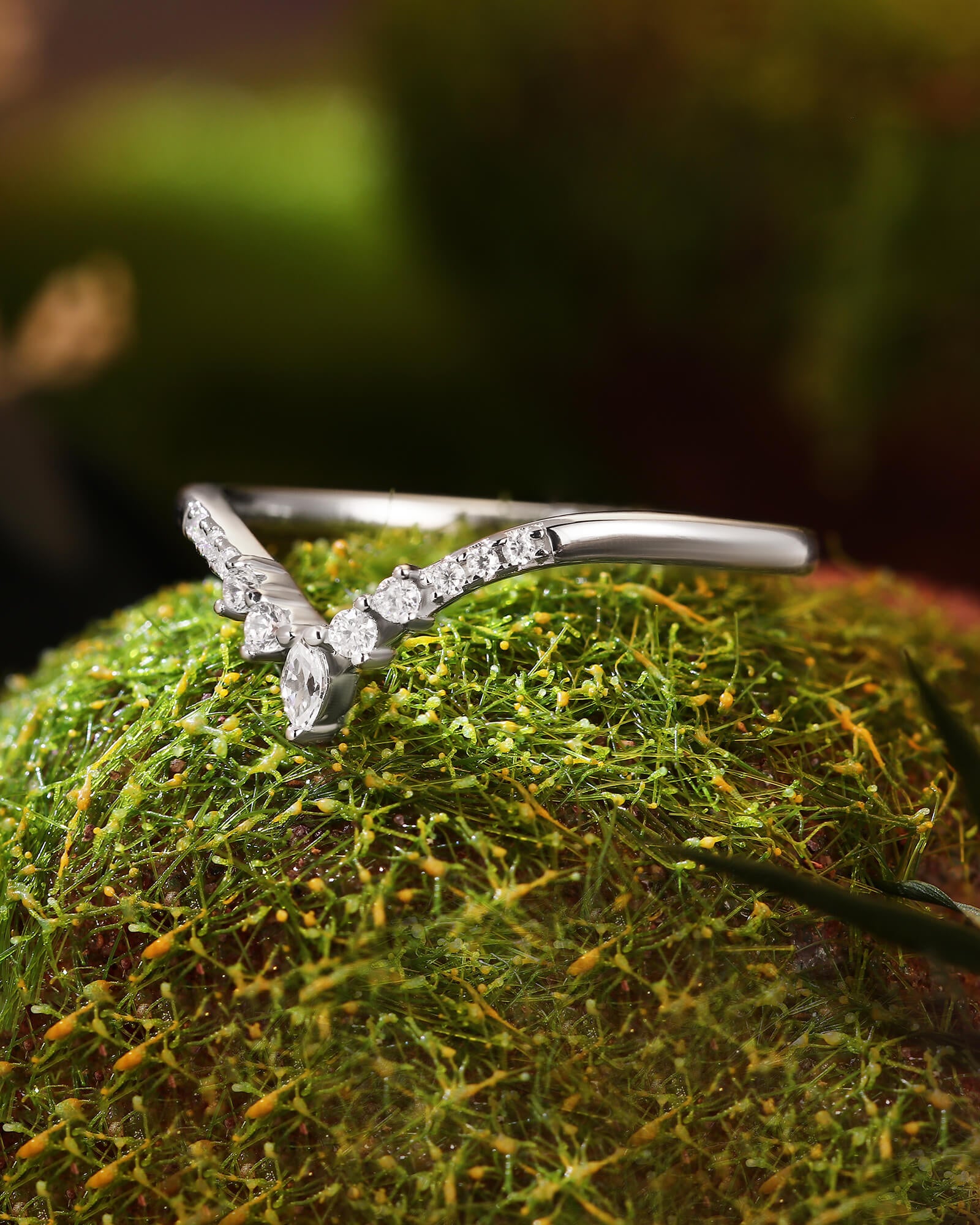 A delicate v-shape band, meticulously paved with brilliant round moissanite diamonds, and the top is a piece of marquise cut moissanite. This JOLIE ring captures the promise of a love that shines brightly through every moment, designed to be worn alone or stacked for endless possibilities.