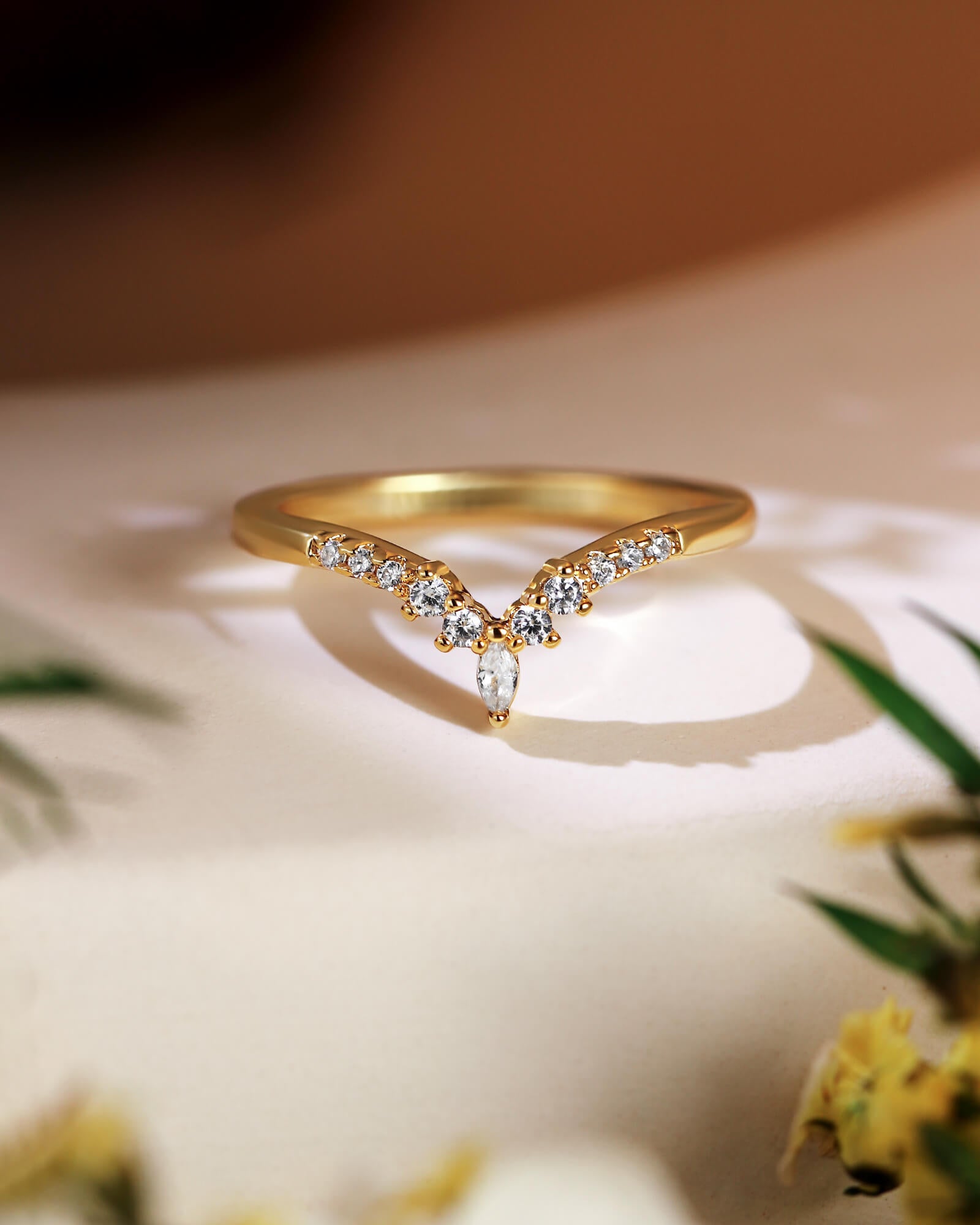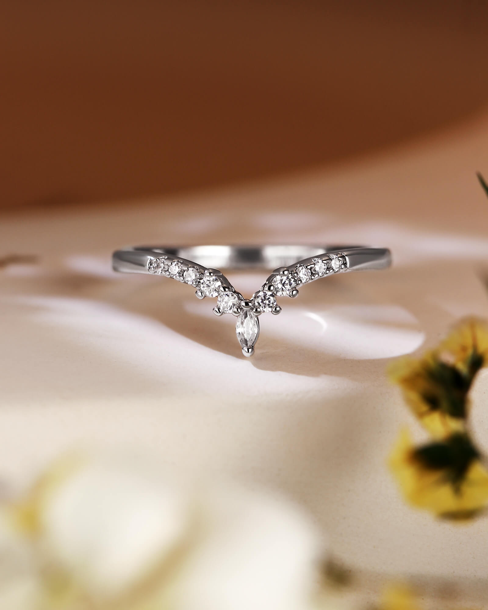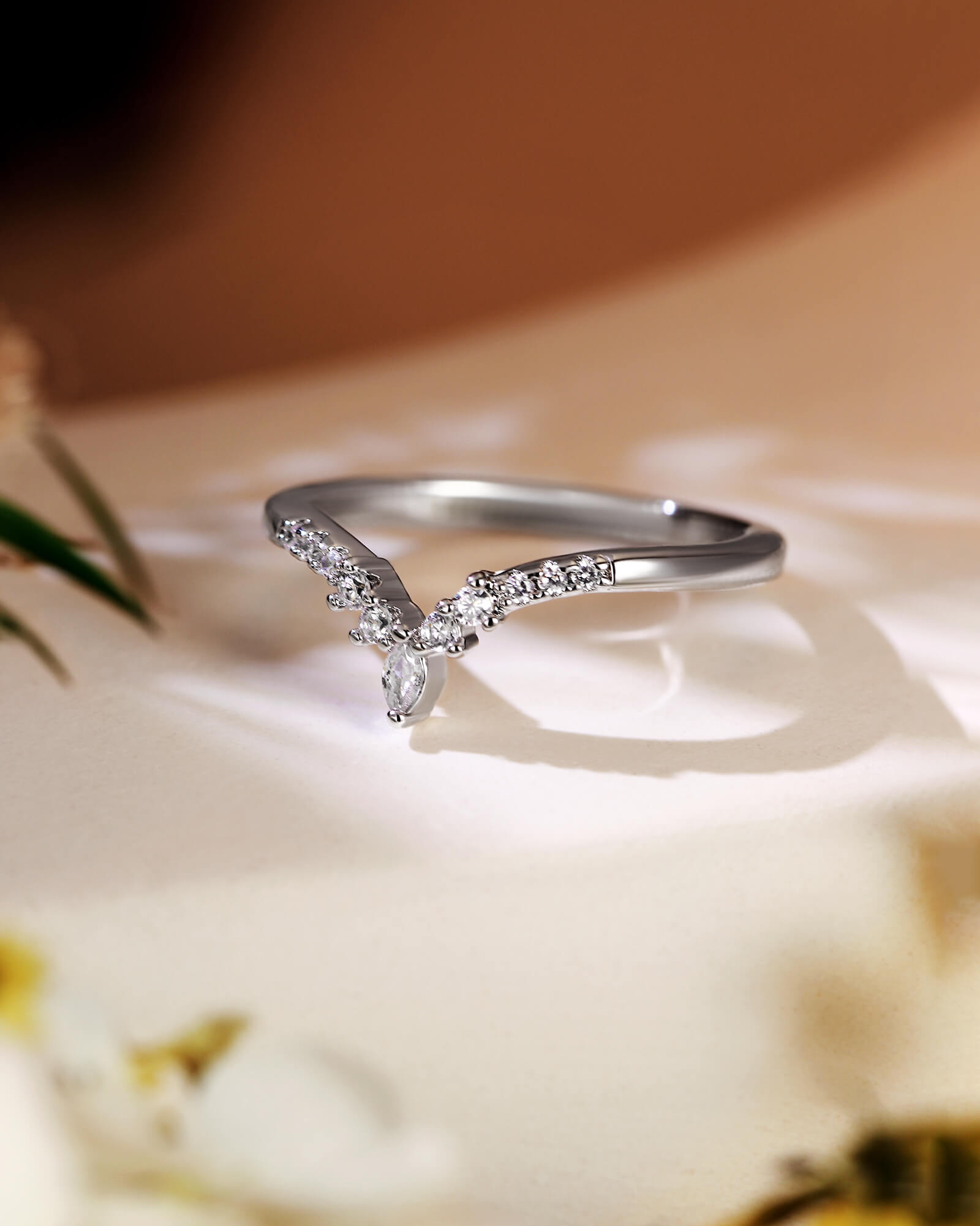 A delicate v-shape band, meticulously paved with brilliant round moissanite diamonds, and the top is a piece of marquise cut moissanite. This JOSELYN ring captures the promise of a love that shines brightly through every moment, designed to be worn alone or stacked for endless possibilities.