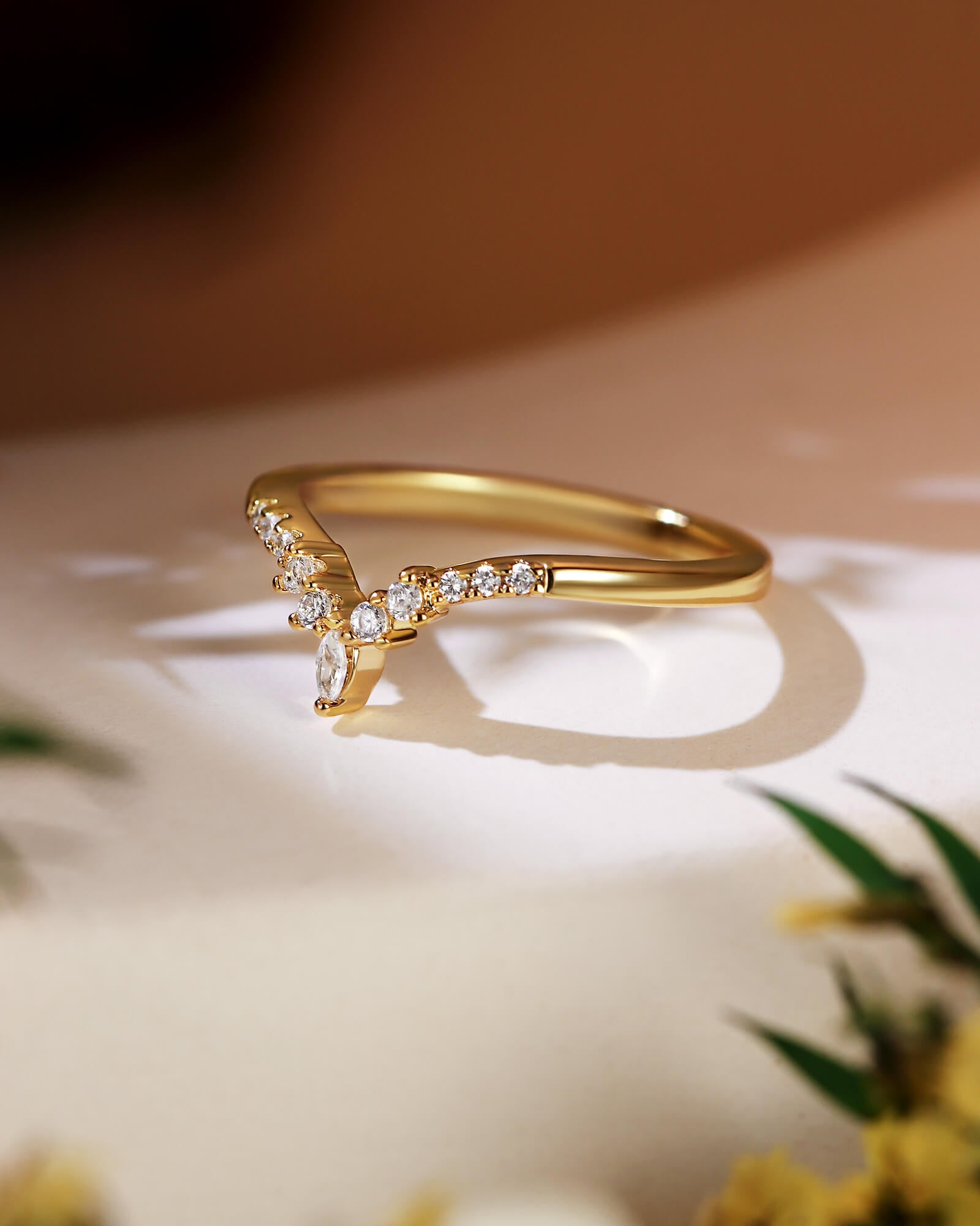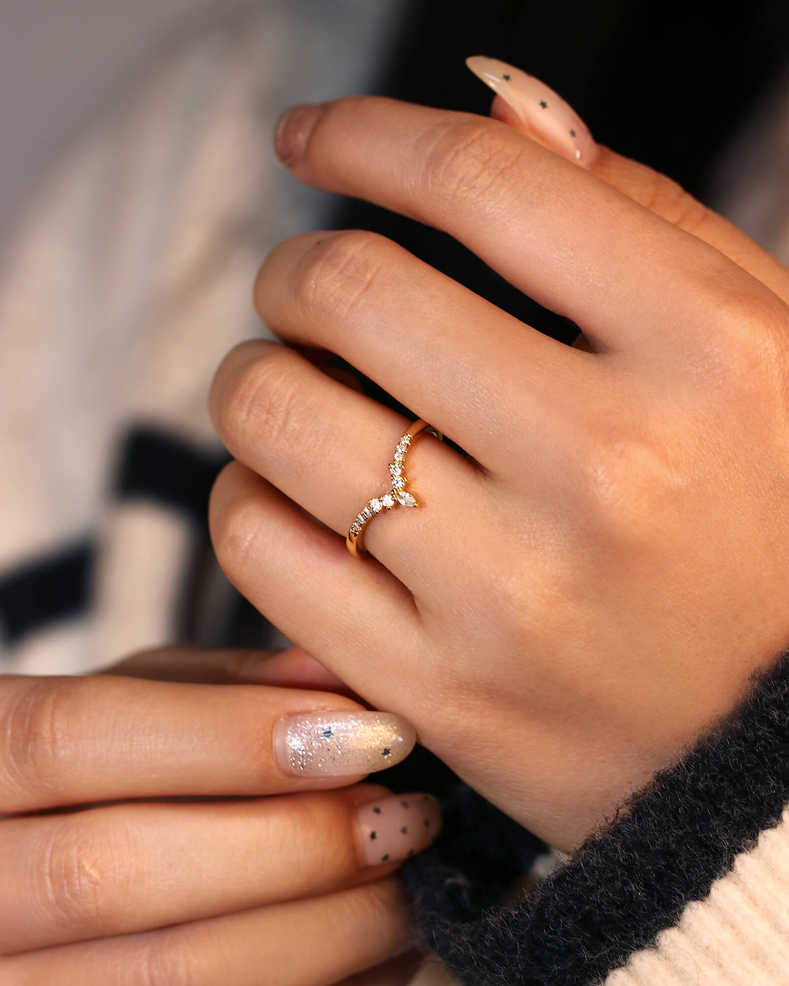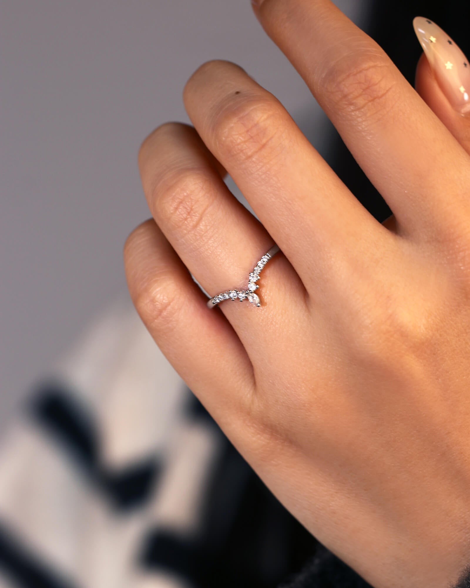 A delicate v-shape band, meticulously paved with brilliant round moissanite diamonds, and the top is a piece of marquise cut moissanite. This JOSELYN ring captures the promise of a love that shines brightly through every moment, designed to be worn alone or stacked for endless possibilities.