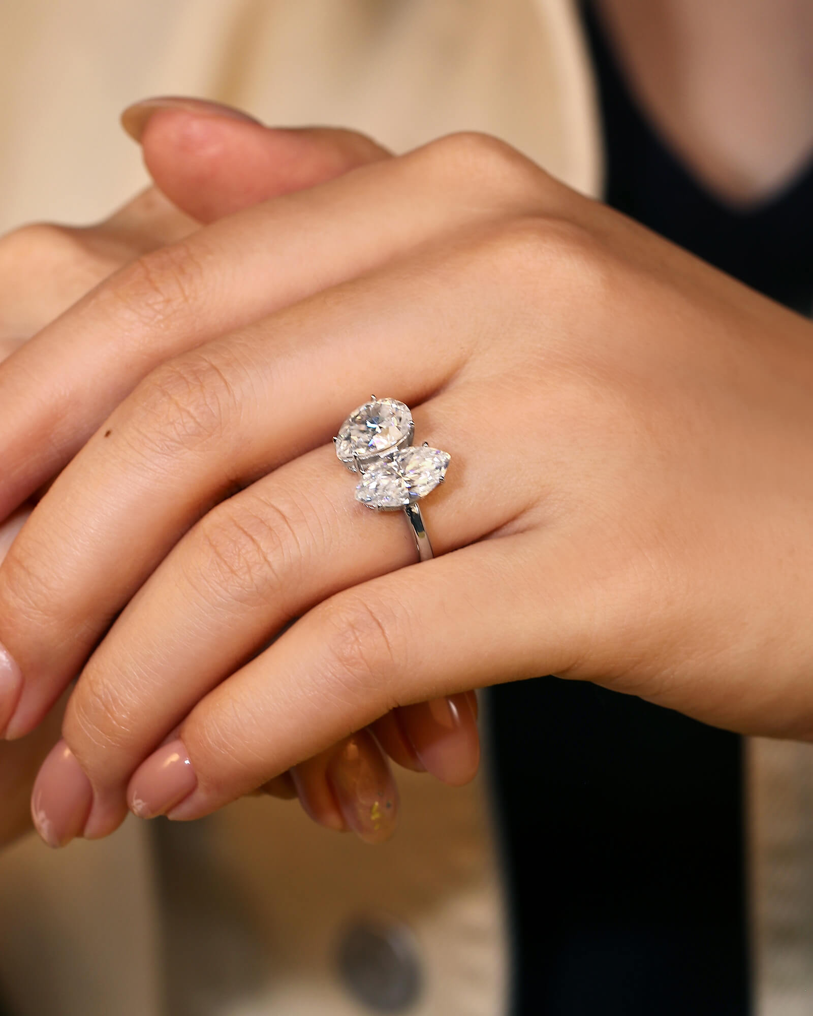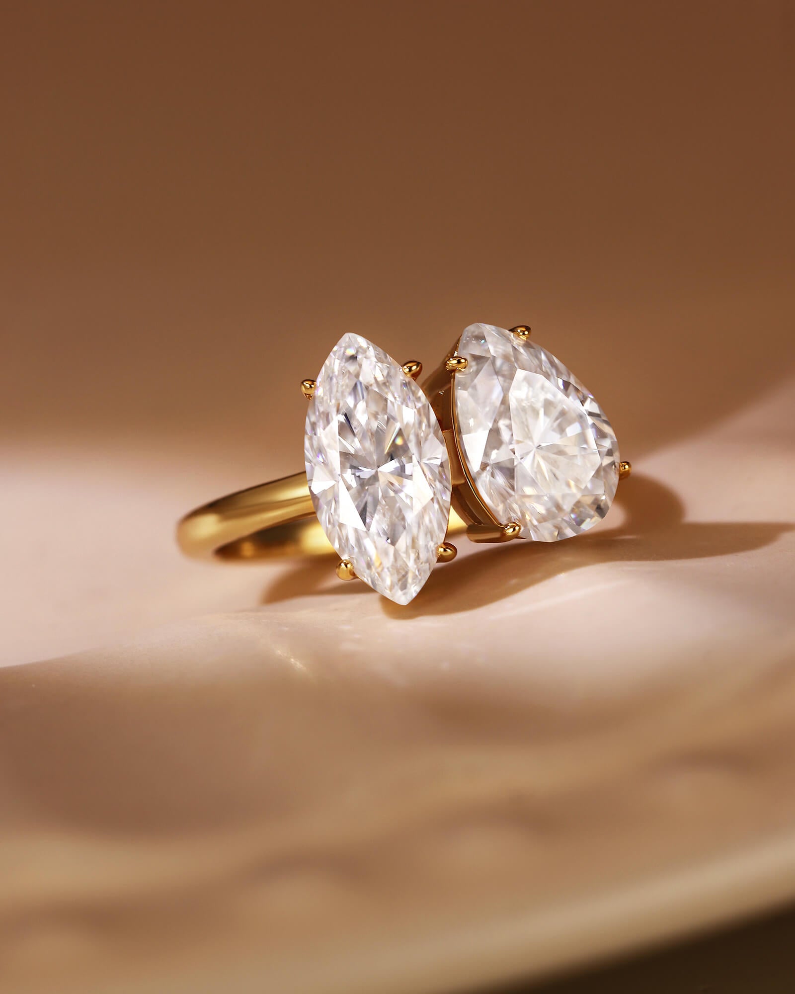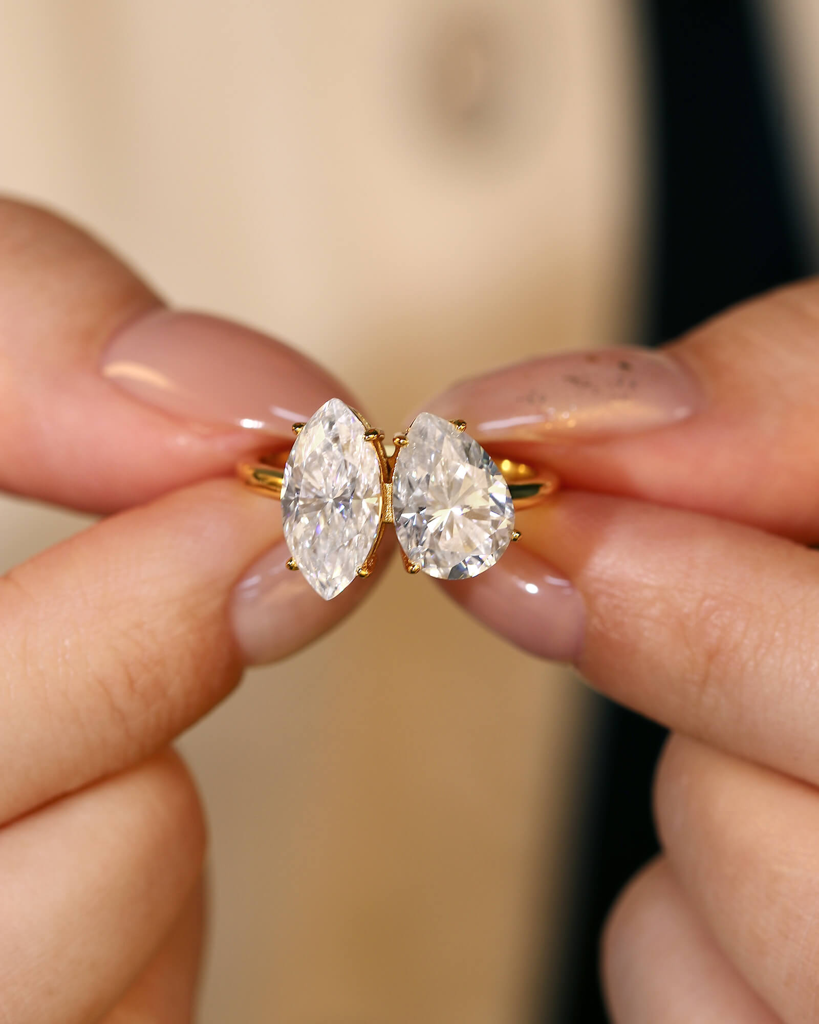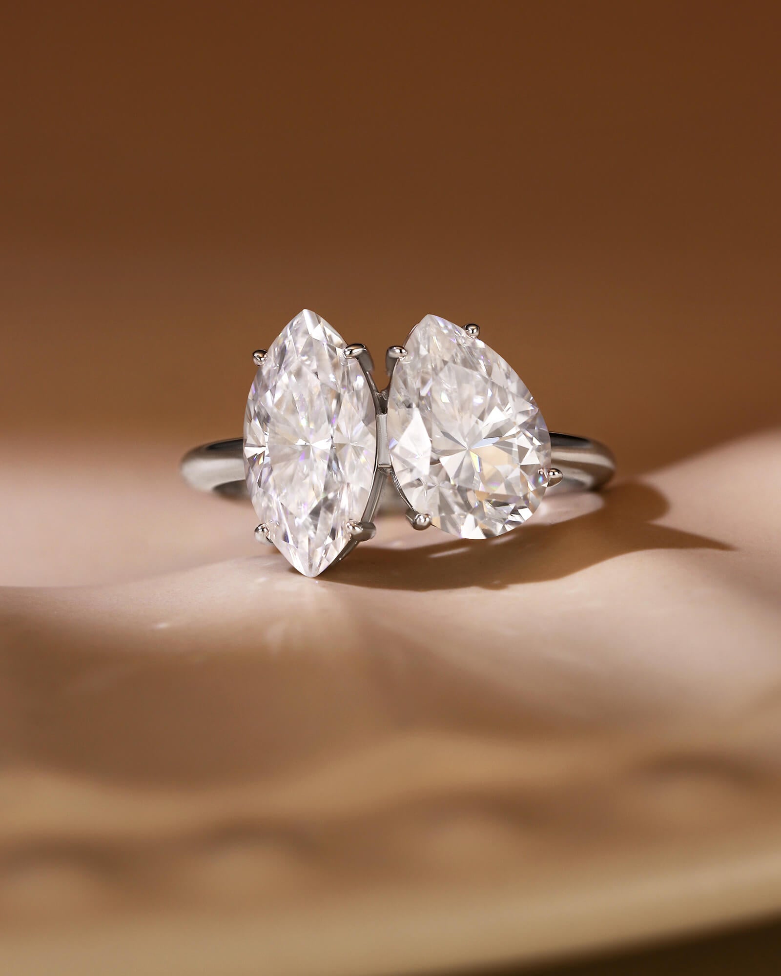 Set side-by-side in a sleek, open setting, both stones share pointed ends that create a sense of shared direction and visual synergy. Their elongated forms mirror and amplify each other, creating a dynamic, sweeping silhouette that seems to be in motion even when still. This design is a beautiful metaphor for a relationship built on mutual momentum—a partnership where joy is found not in standing still, but in moving forward together, each person's unique light guiding and complementing the other's.