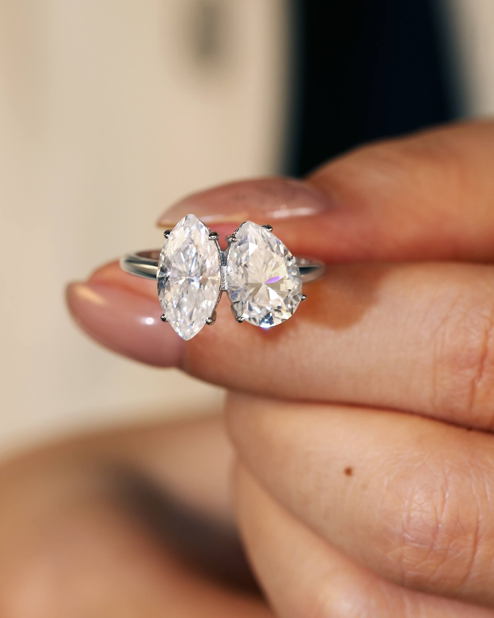 The JOY engagement ring is a radiant celebration of partnership, where two distinct personalities converge to create a single, joyful expression of love. This captivating Toi et Moi design pairs two brilliant moissanite stones in a composition that feels both playful and profound. The pear cut moissanite brings a sense of gentle, flowing grace and forward momentum, like a happy tear or a blossoming bud. Its partner, the marquise cut moissanite, adds a touch of celestial drama and elongated brilliance, reminiscent of a smiling crescent moon or a beam of light.