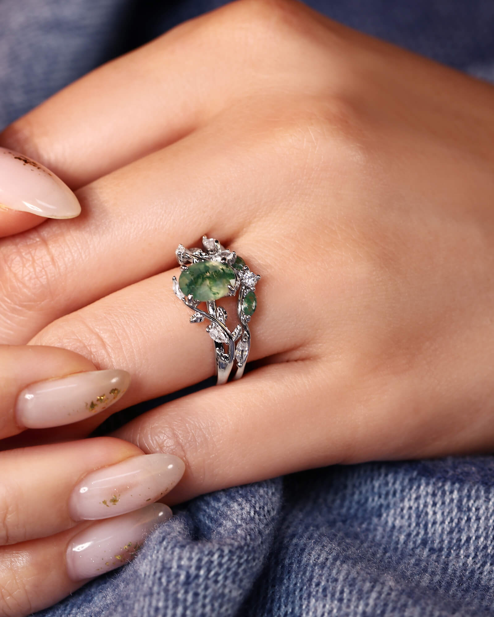 The engagement ring: An oval moss agate, each stone a unique world of forest greens and earthy whispers. The vine leaves climb along the band, cradling the stone in organic grace.