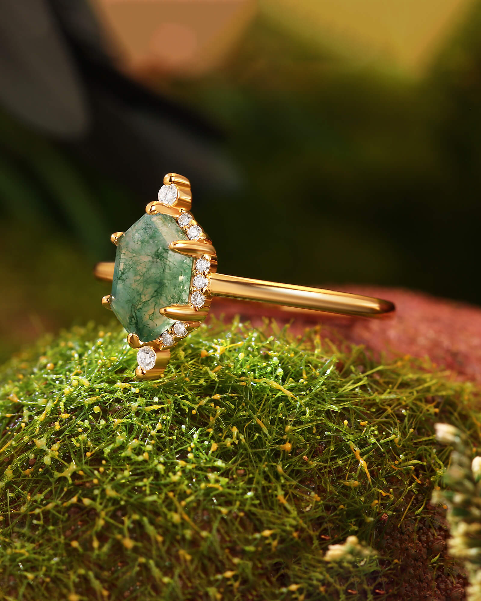 The LILAC ring is a captivating conversation between the past and the present. It begins with a hexagon-cut natural moss agate, a stone that captures an entire miniature ecosystem within its clean, geometric lines. This "garden" is encased in a vintage-inspired halo of moissanite diamonds, whose fiery brilliance and intricate setting evoke the craftsmanship of a bygone era, creating a mesmerizing frame that enhances both the stone's color and its unique inclusions.
