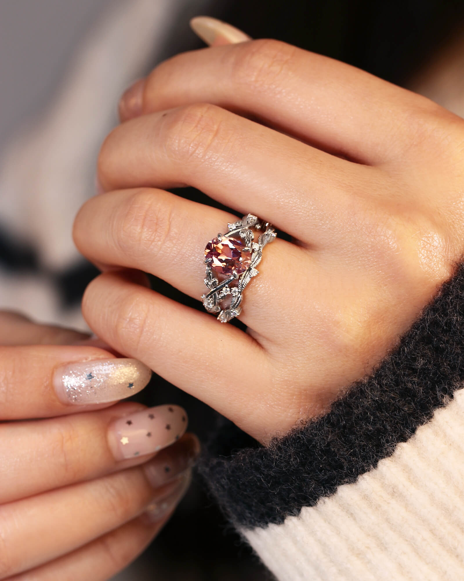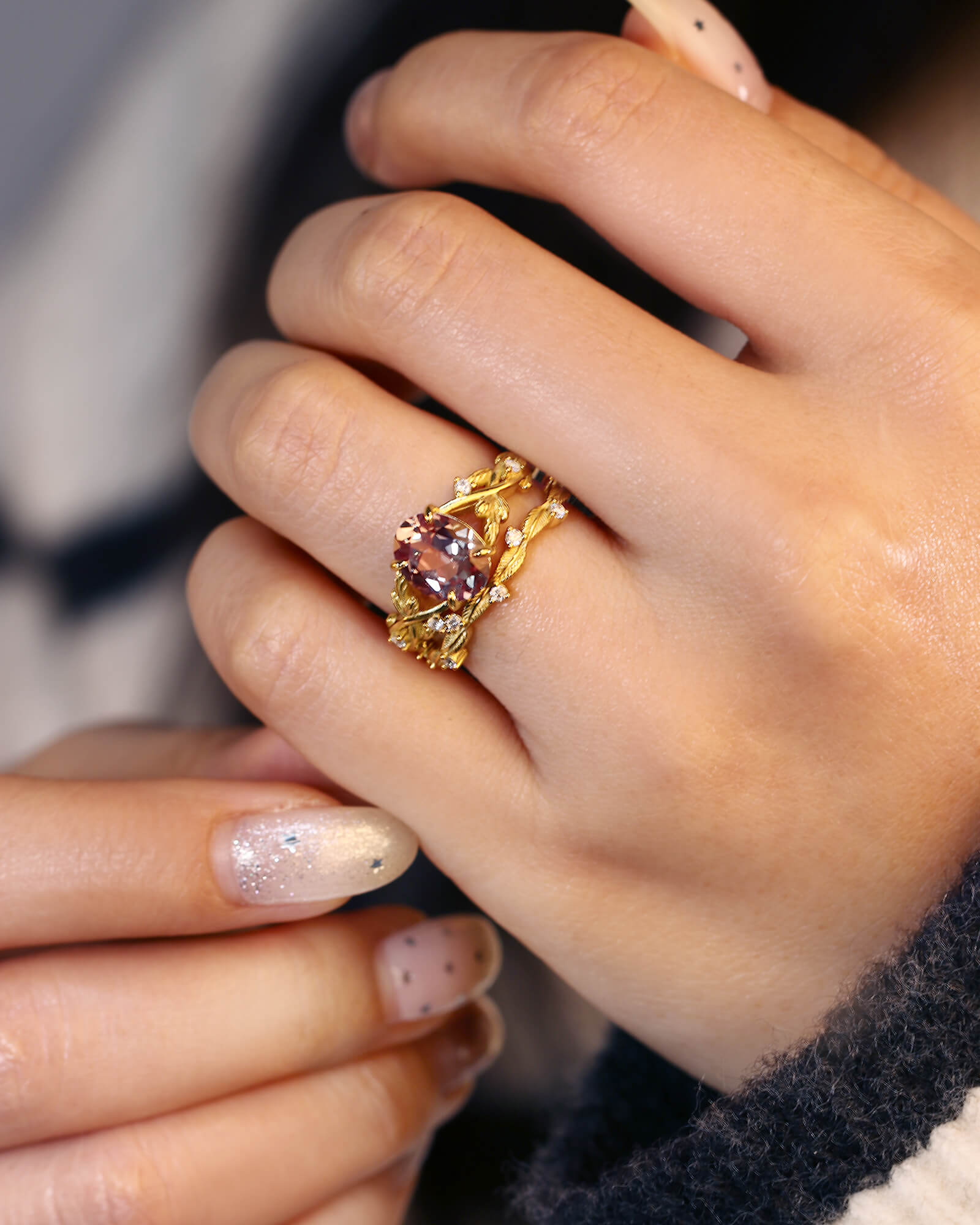 Oval Shaped Lab Alexandrite Leaf Ring Set 2pcs Wedding Ring Moissanite Side Stone Ring Leaf Band Nature Inspired Ring Promise Bridal Anniversary Gift For Her