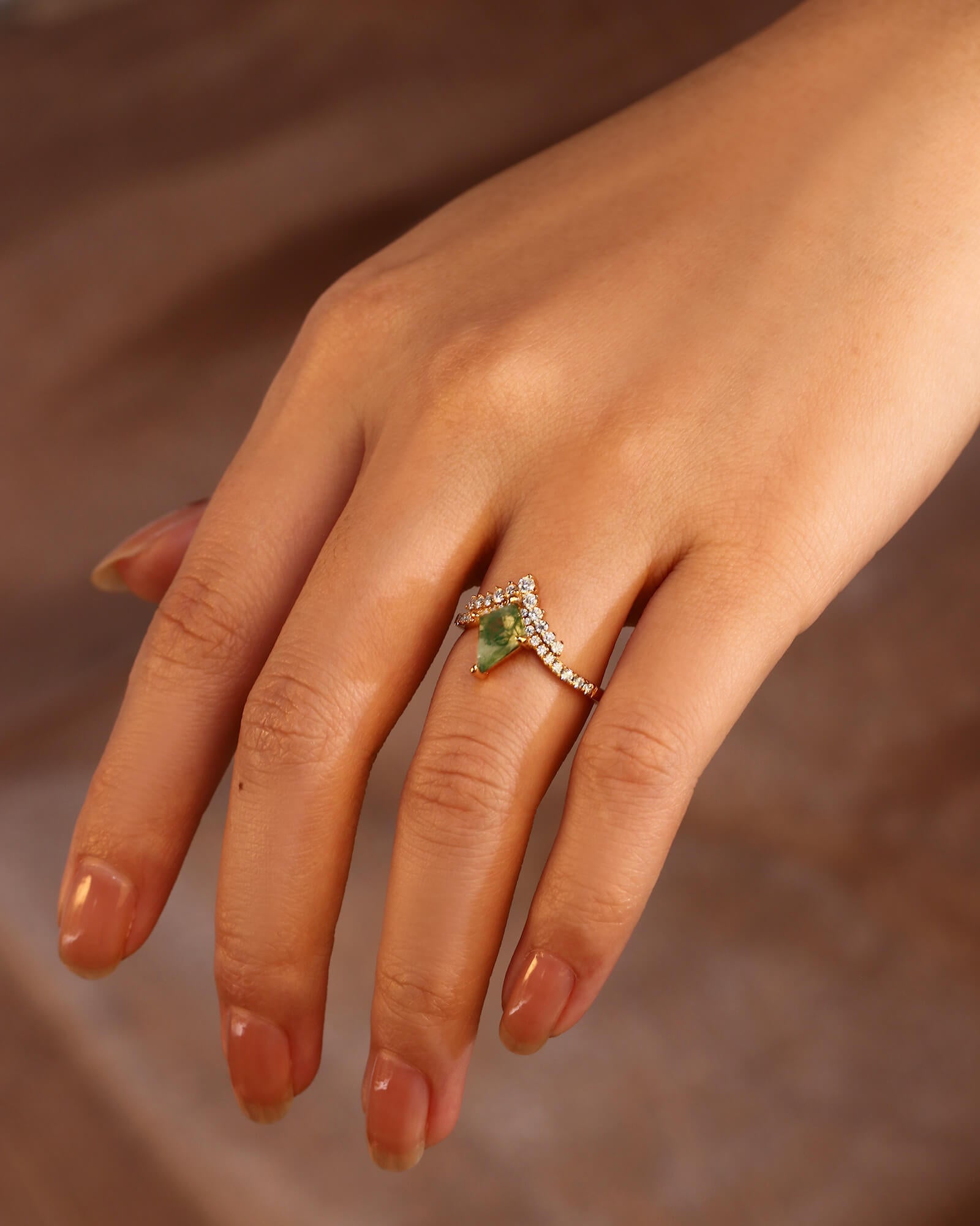The LINDELISE ring is a wearable sonnet of form and light. Its soul is a kite-shaped natural moss agate, a stone cut to suggest flight and freedom, revealing a miniature world of mossy forests within. This singular centerpiece is cradled not by a traditional band, but by two elegantly curved lines of pavé moissanite diamonds that sweep around the finger like a gentle embrace or a flowing stream.
