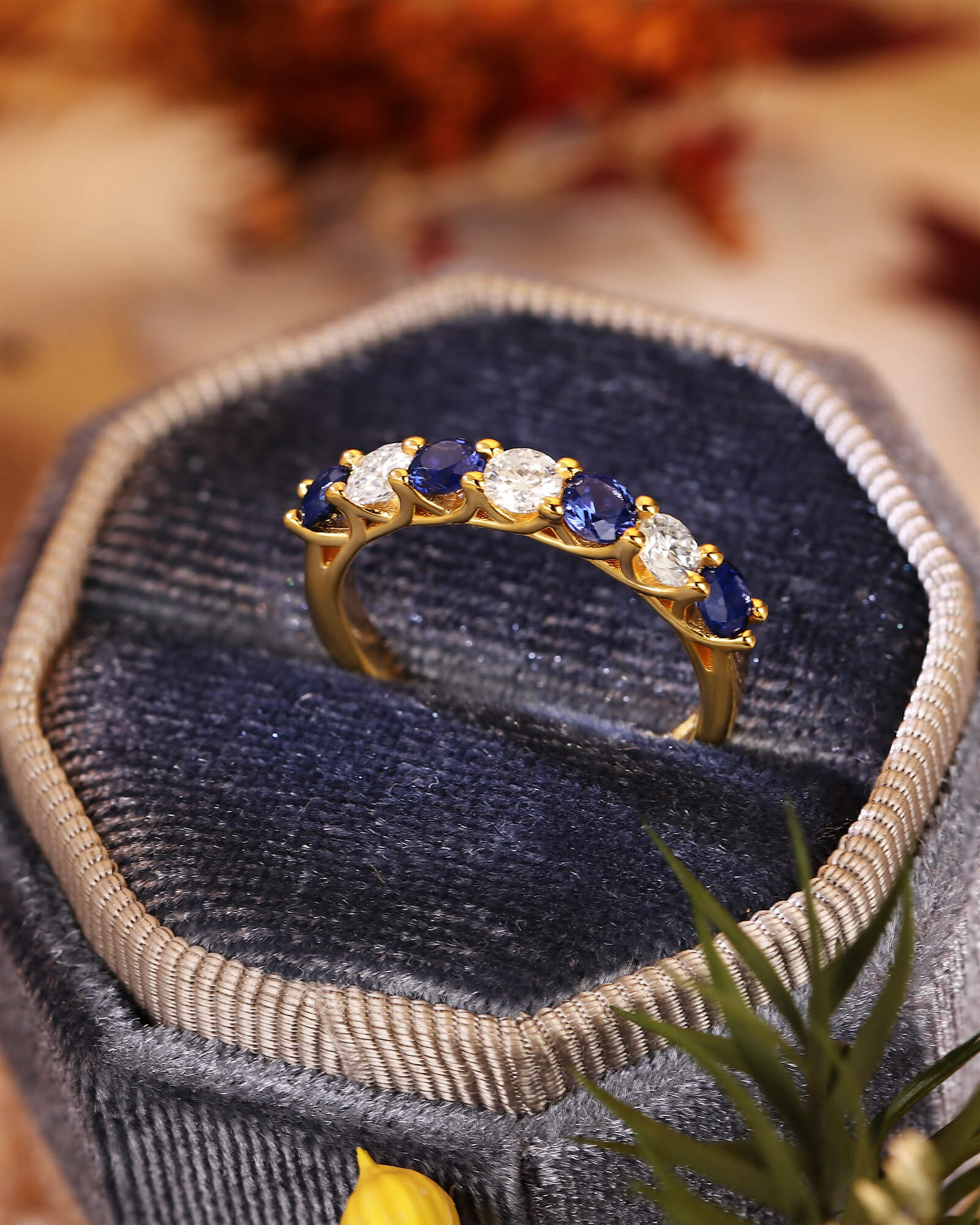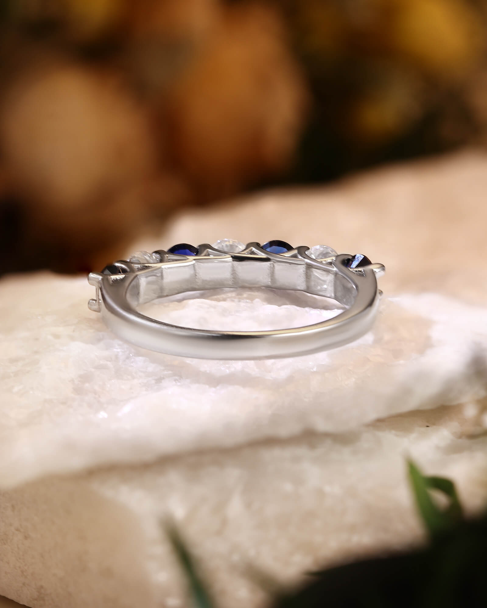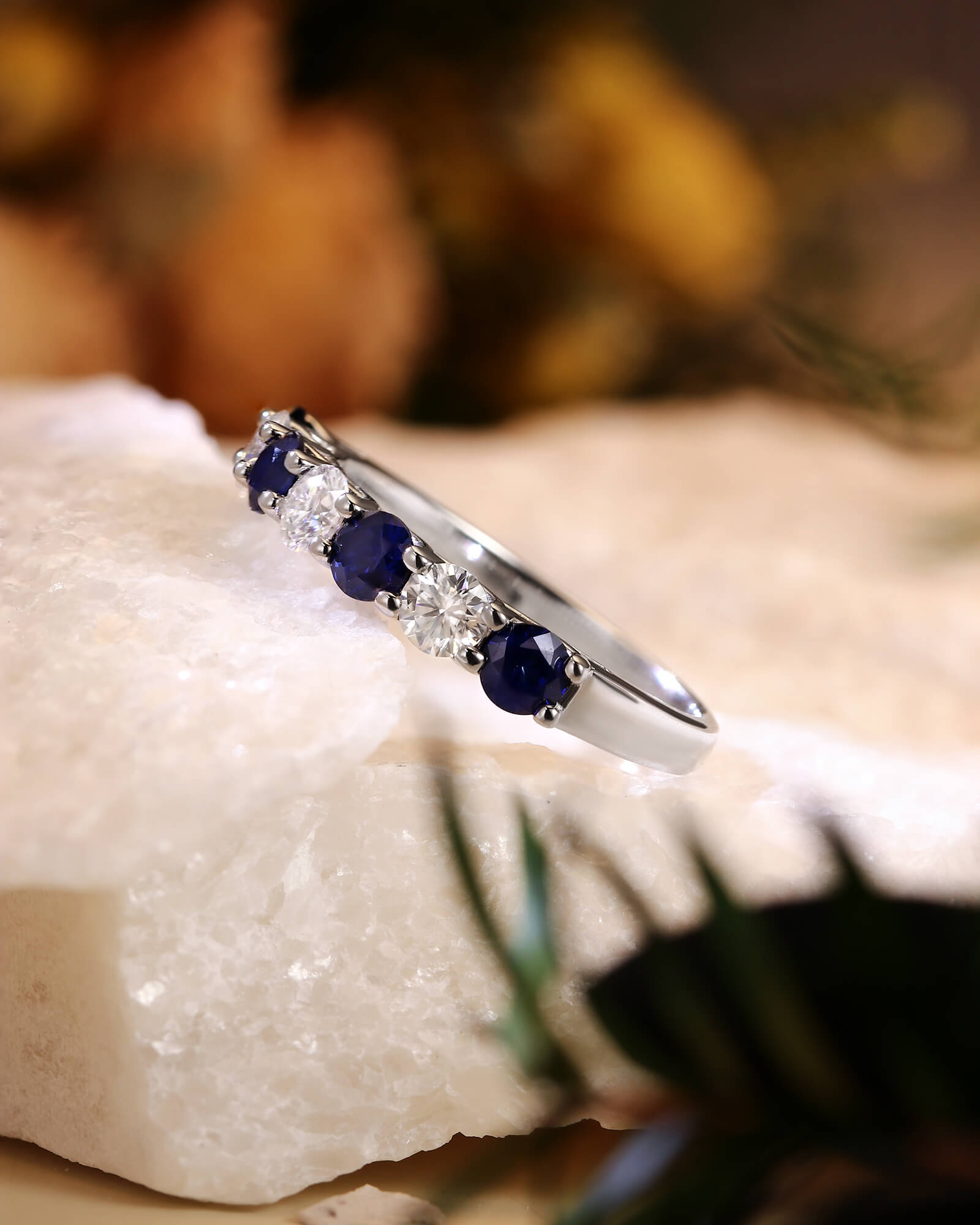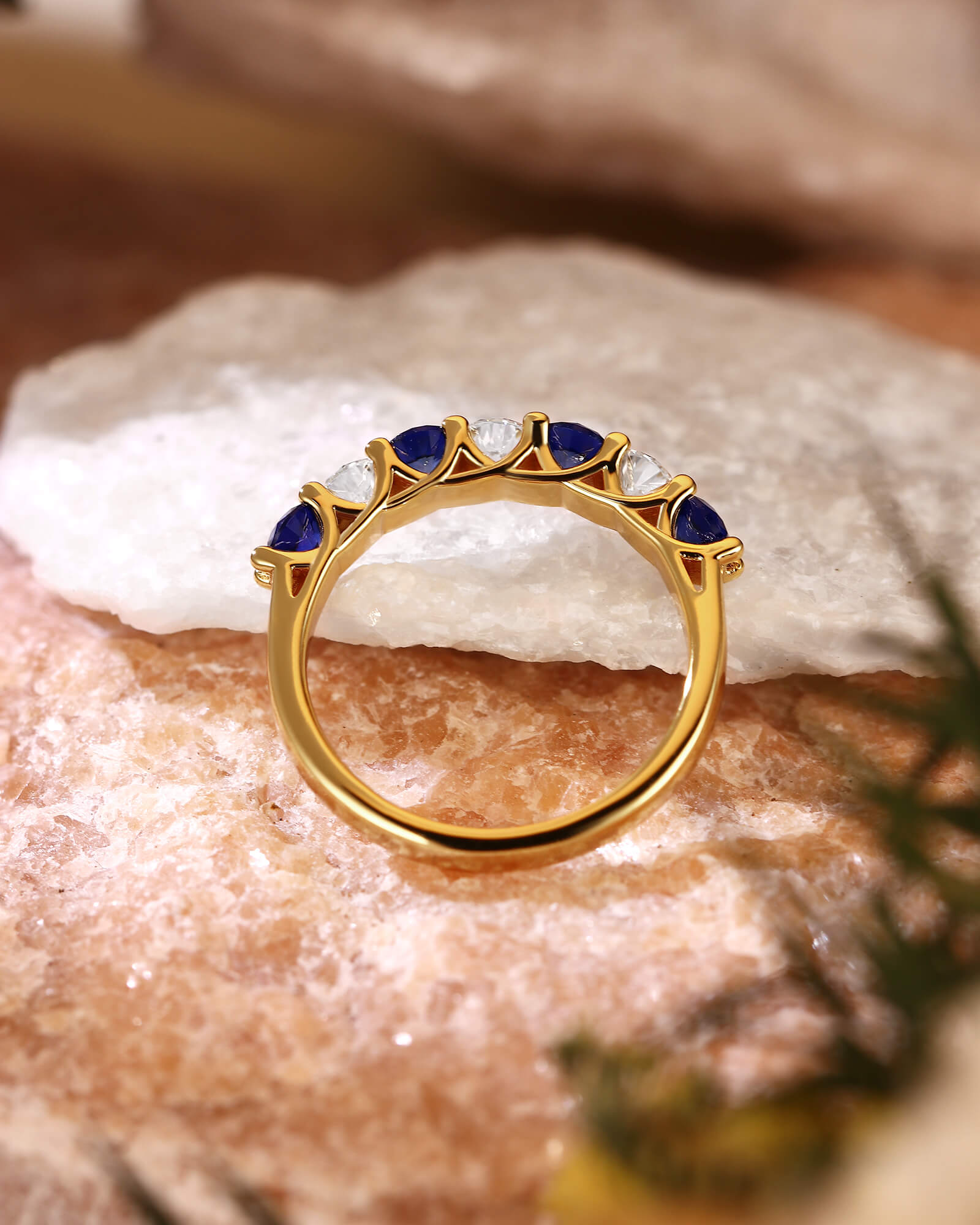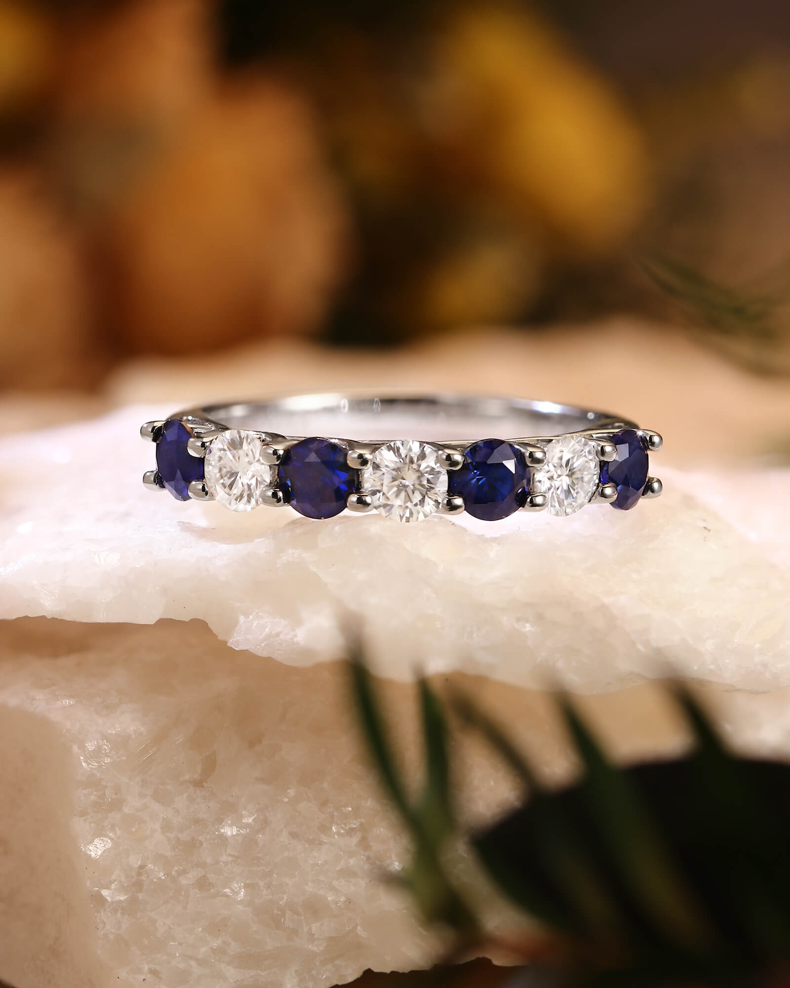 Deep blue sapphires and brilliant white moissanites alternate in perfect harmony. This seven-stone ring is a modern tribute to timeless elegance, where celestial sparkle meets earthly depth.
