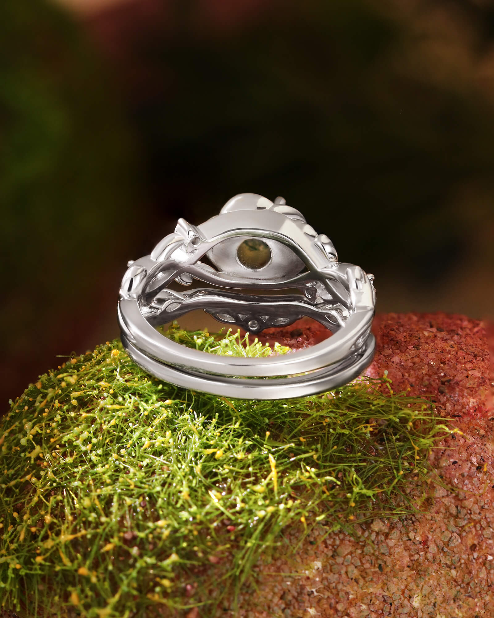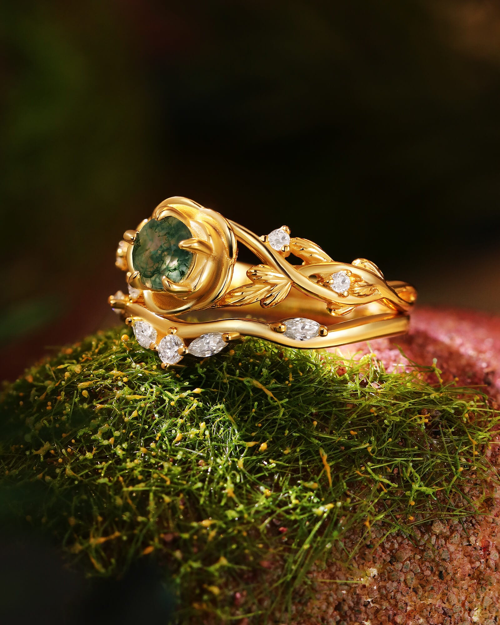Rose Blossom Round Cut Moss Agate Ring Set 2pcs Wedding Ring Moissanite Side Stones Curved Band Ring Nature Inspired Ring Promise Bridal Anniversary Gift For Her