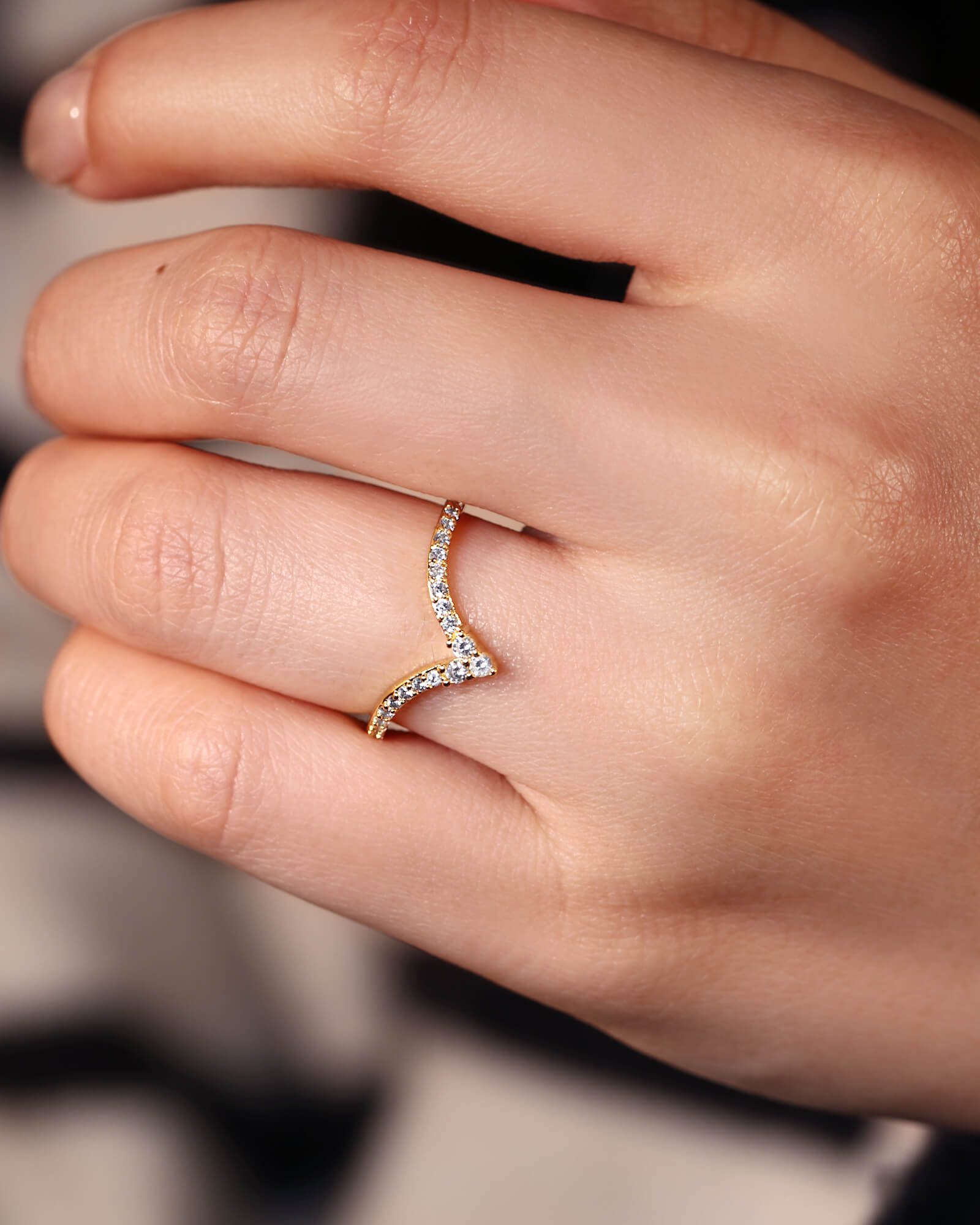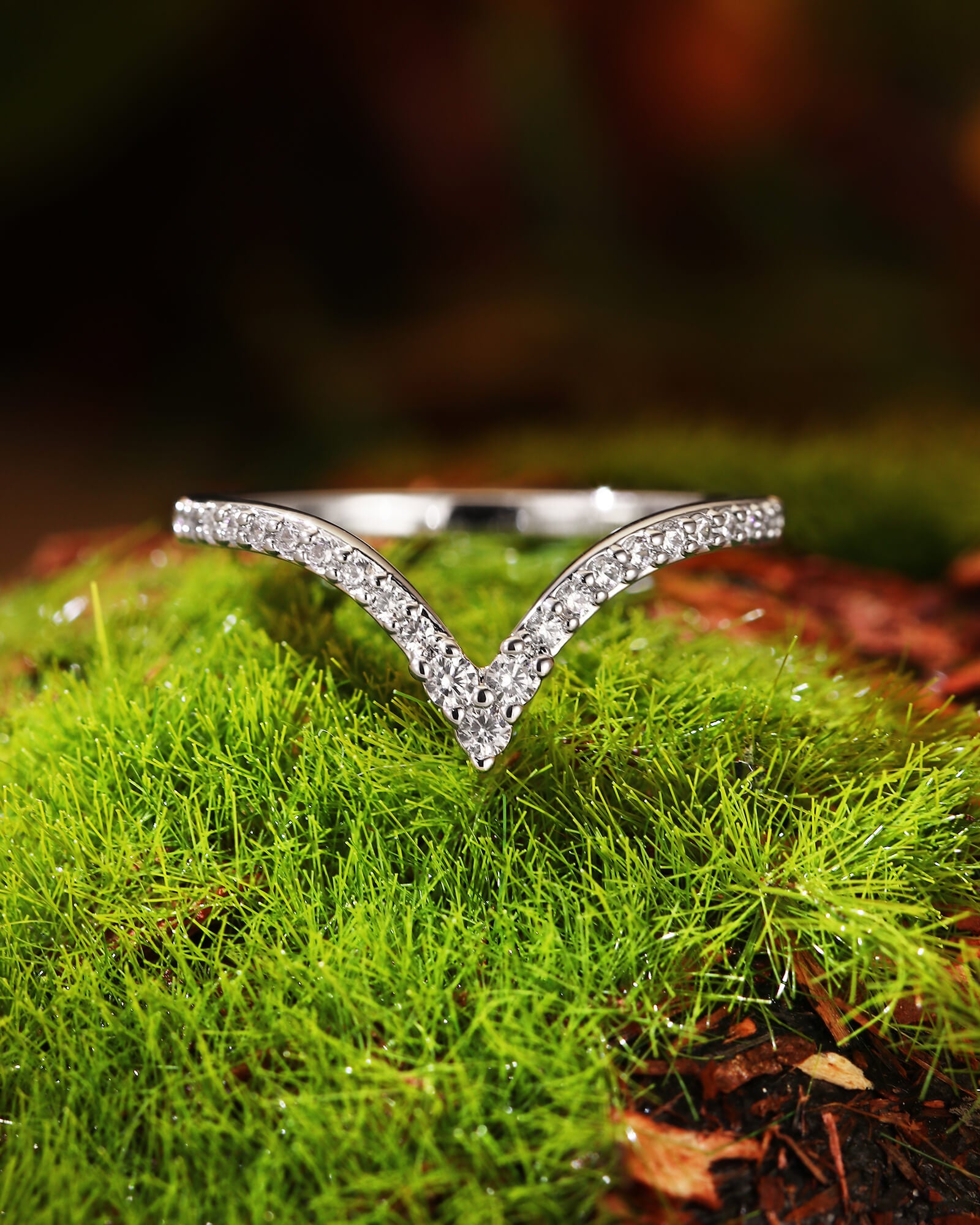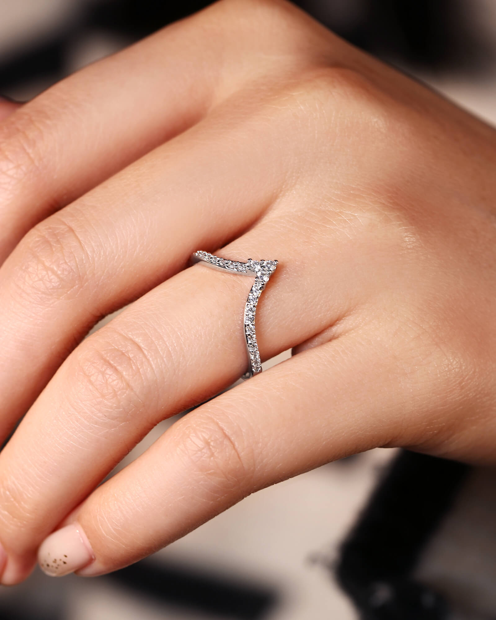 A delicate v-shape band, meticulously paved with brilliant round moissanite diamonds. This ORLI ring captures the promise of a love that shines brightly through every moment, designed to be worn alone or stacked for endless possibilities.