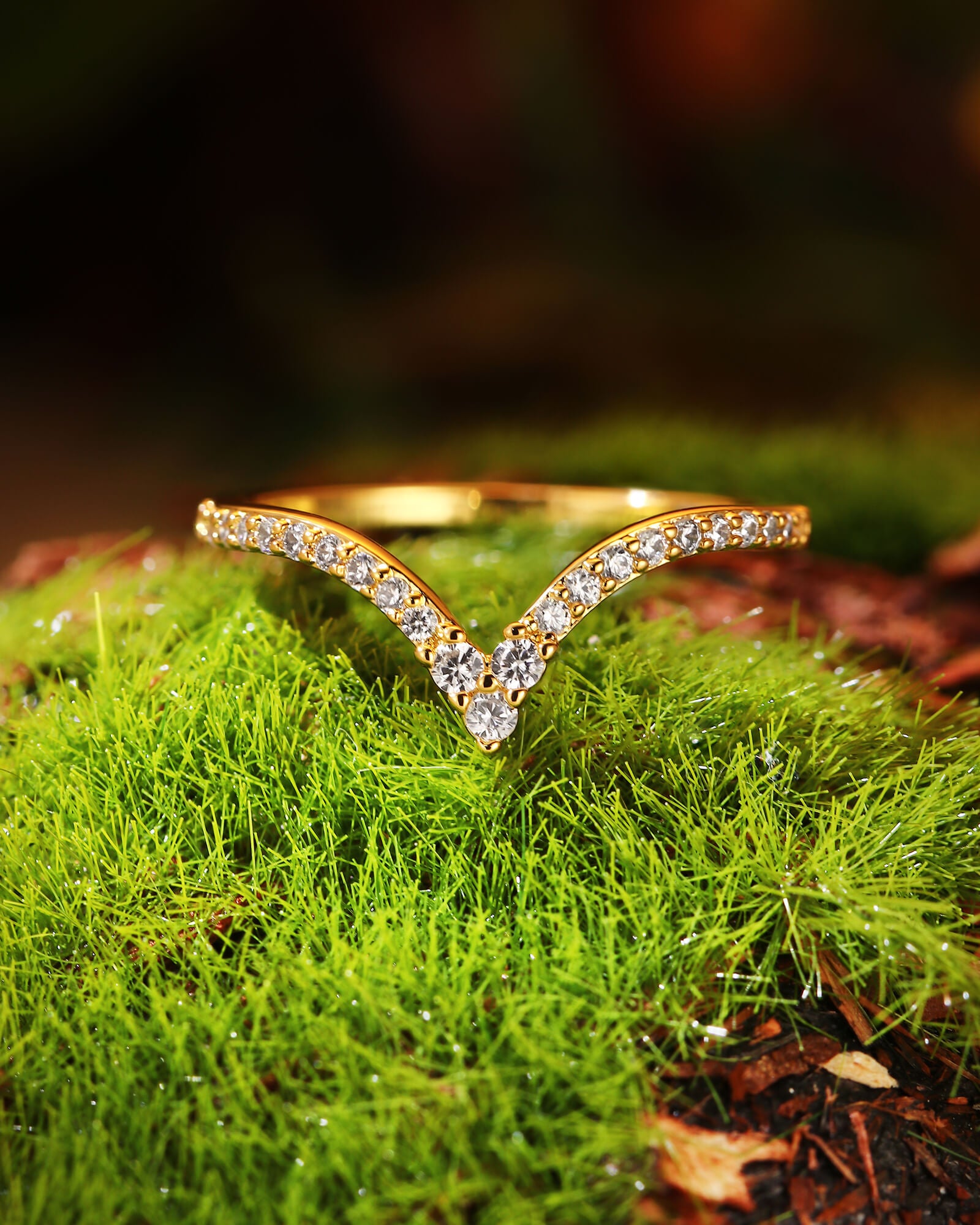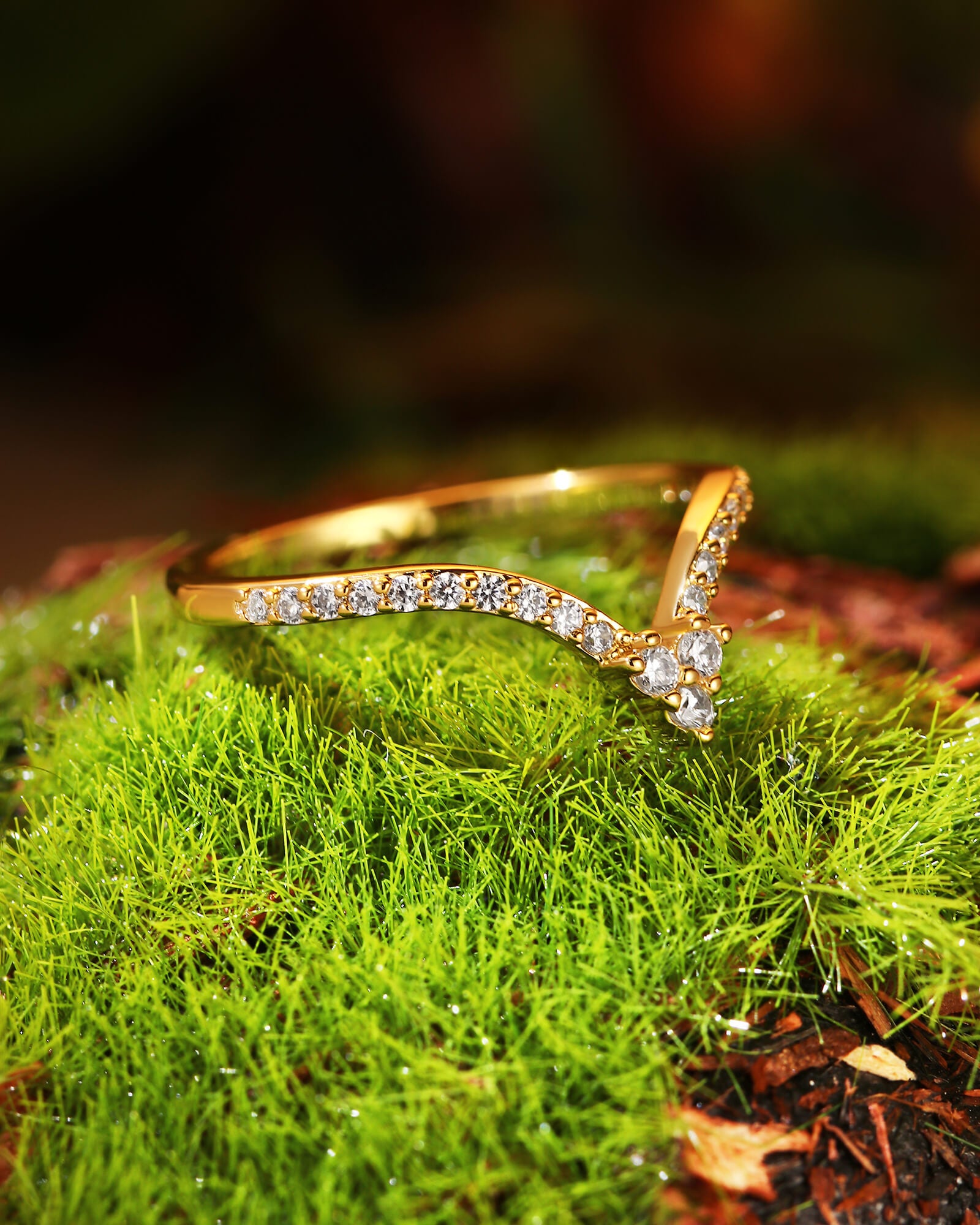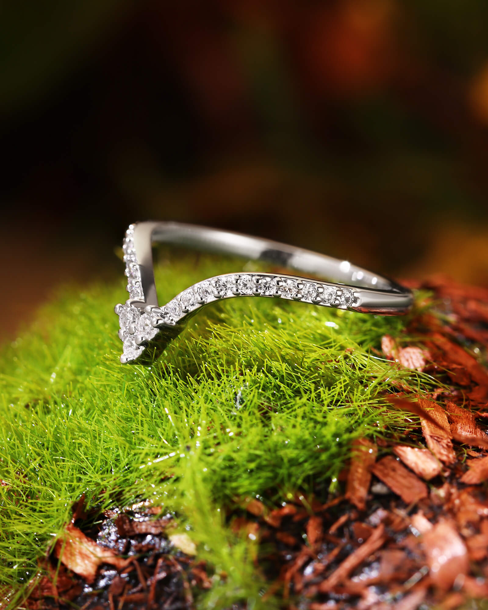 A delicate v-shape band, meticulously paved with brilliant round moissanite diamonds. This ORLI ring captures the promise of a love that shines brightly through every moment, designed to be worn alone or stacked for endless possibilities.