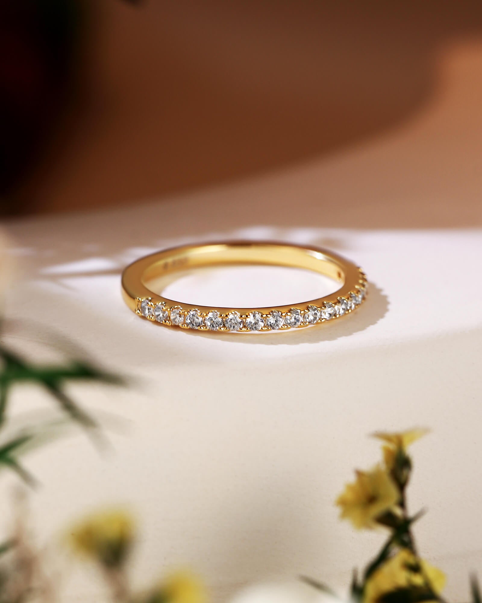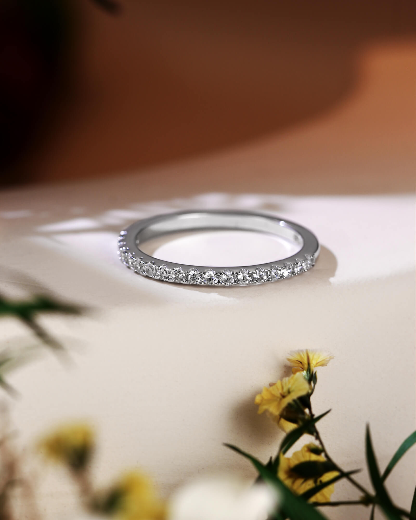 A delicate half-pave band, meticulously setting with brilliant round moissanite diamonds. This QUINN ring captures the promise of a love that shines brightly through every moment, designed to be worn alone or stacked for endless possibilities.