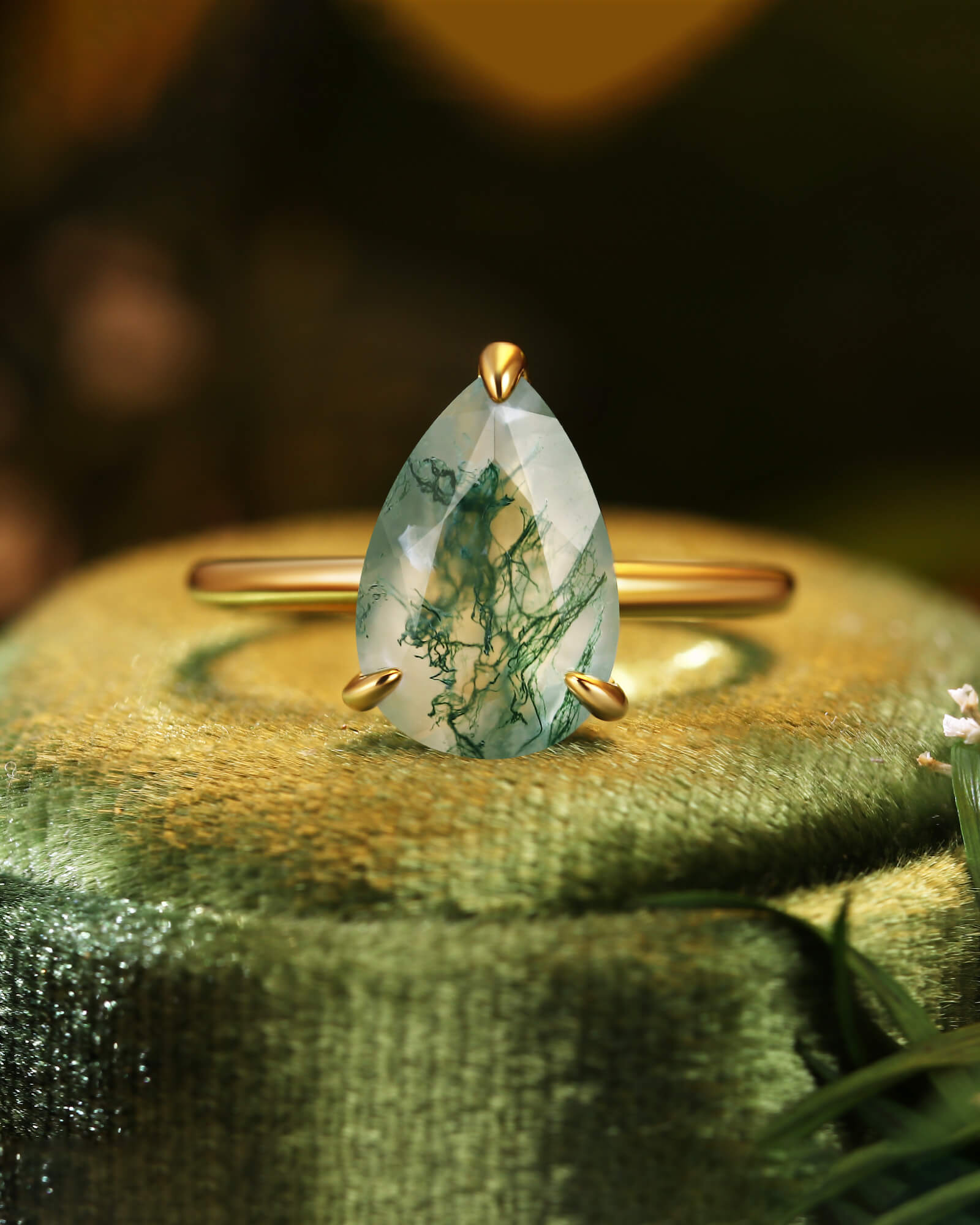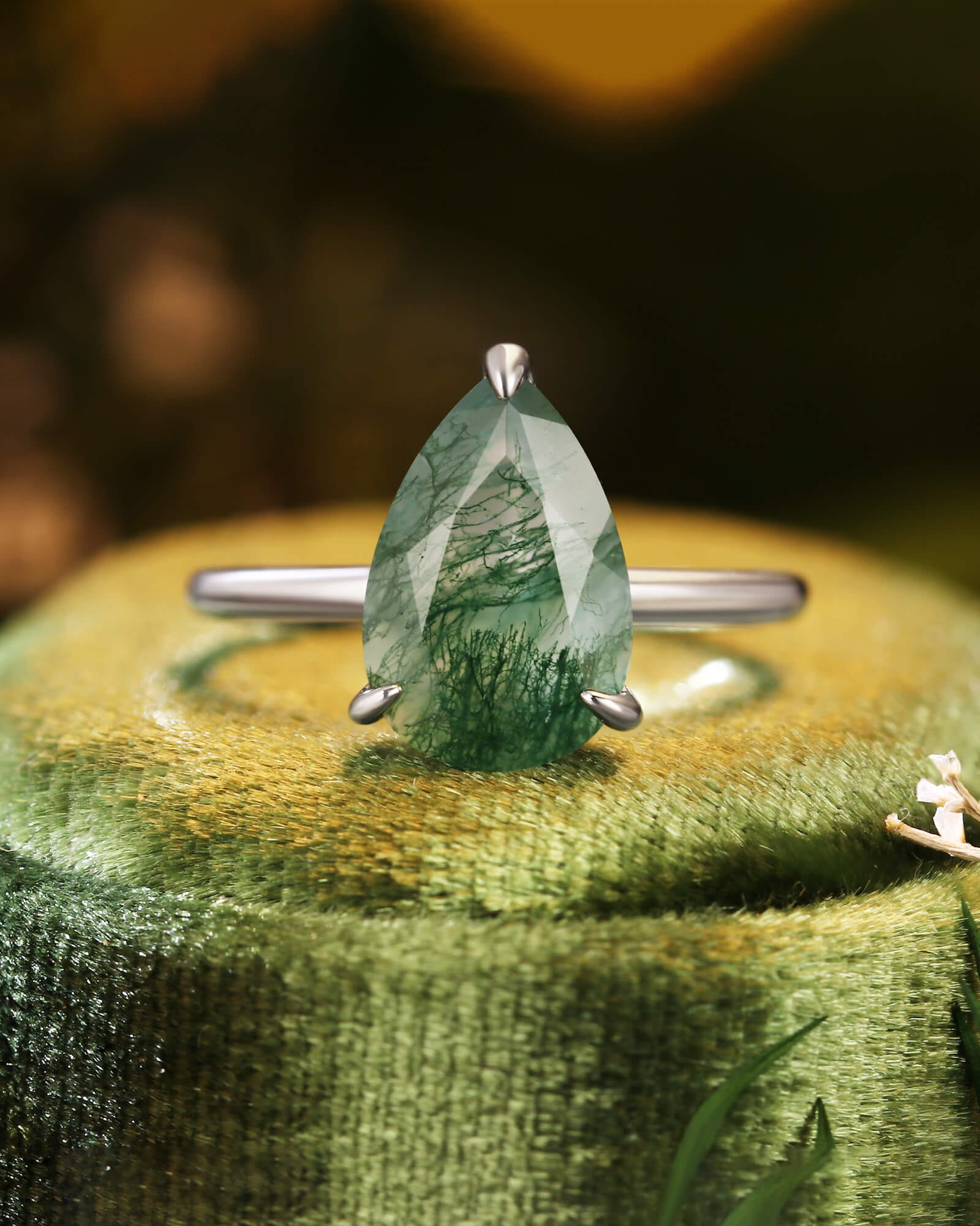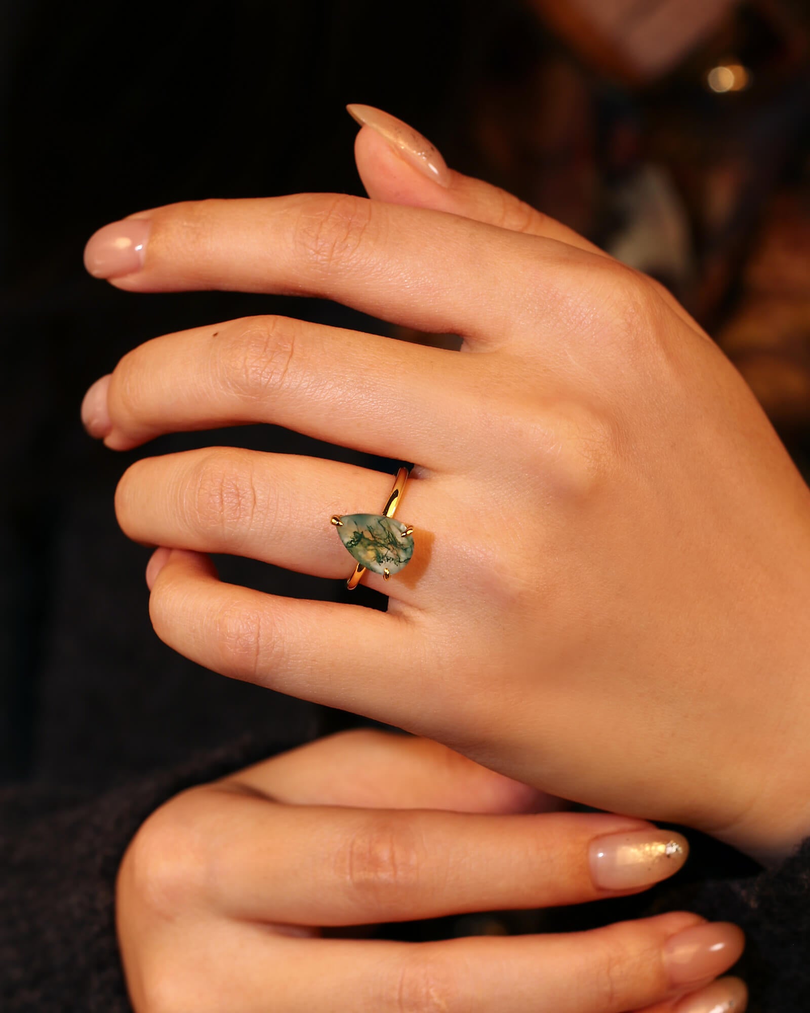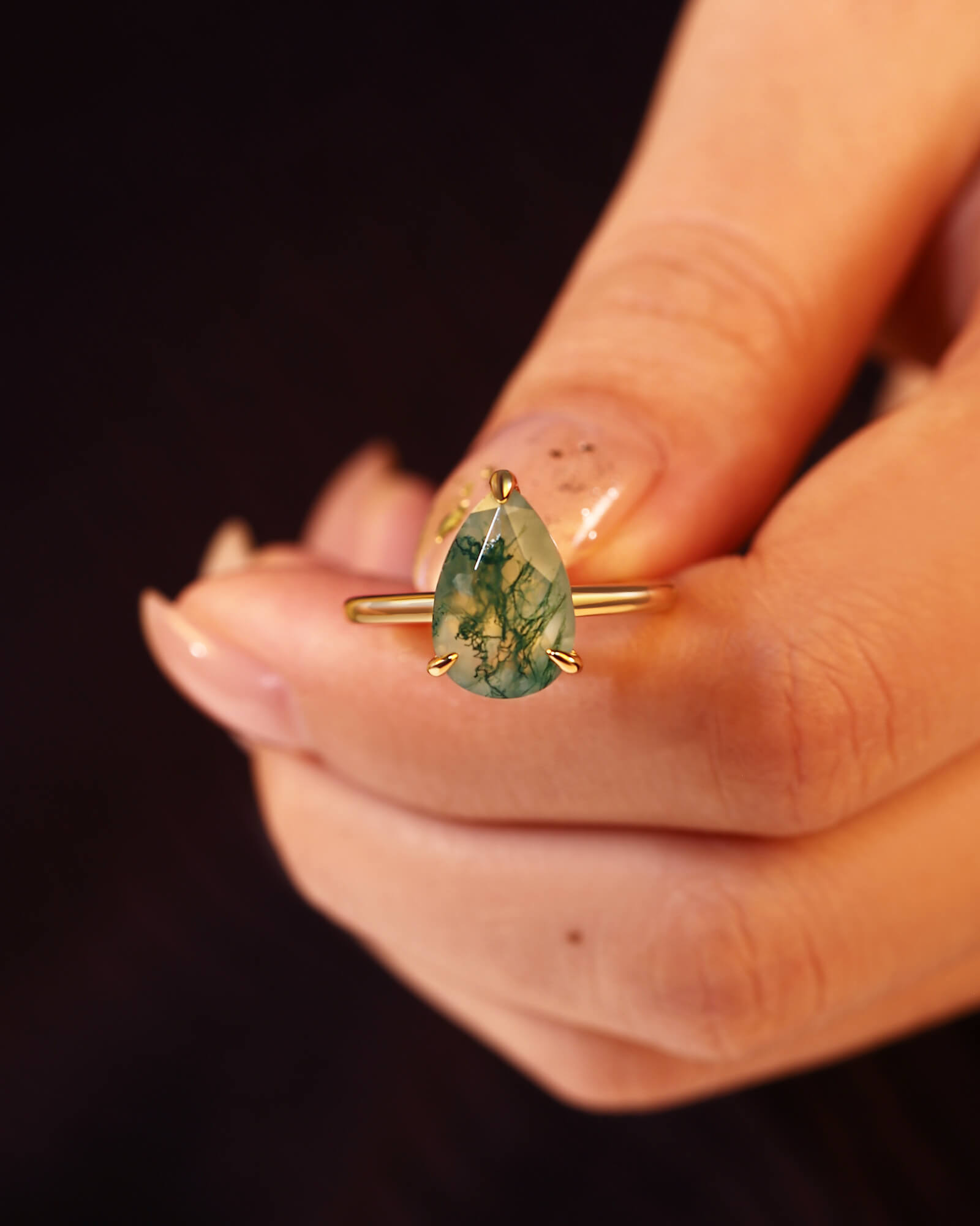 The LARK ring features a graceful pear-cut moss agate, a stone that naturally points toward your shared future. A solitaire design that symbolizes a love story always moving forward, full of growth and grace.