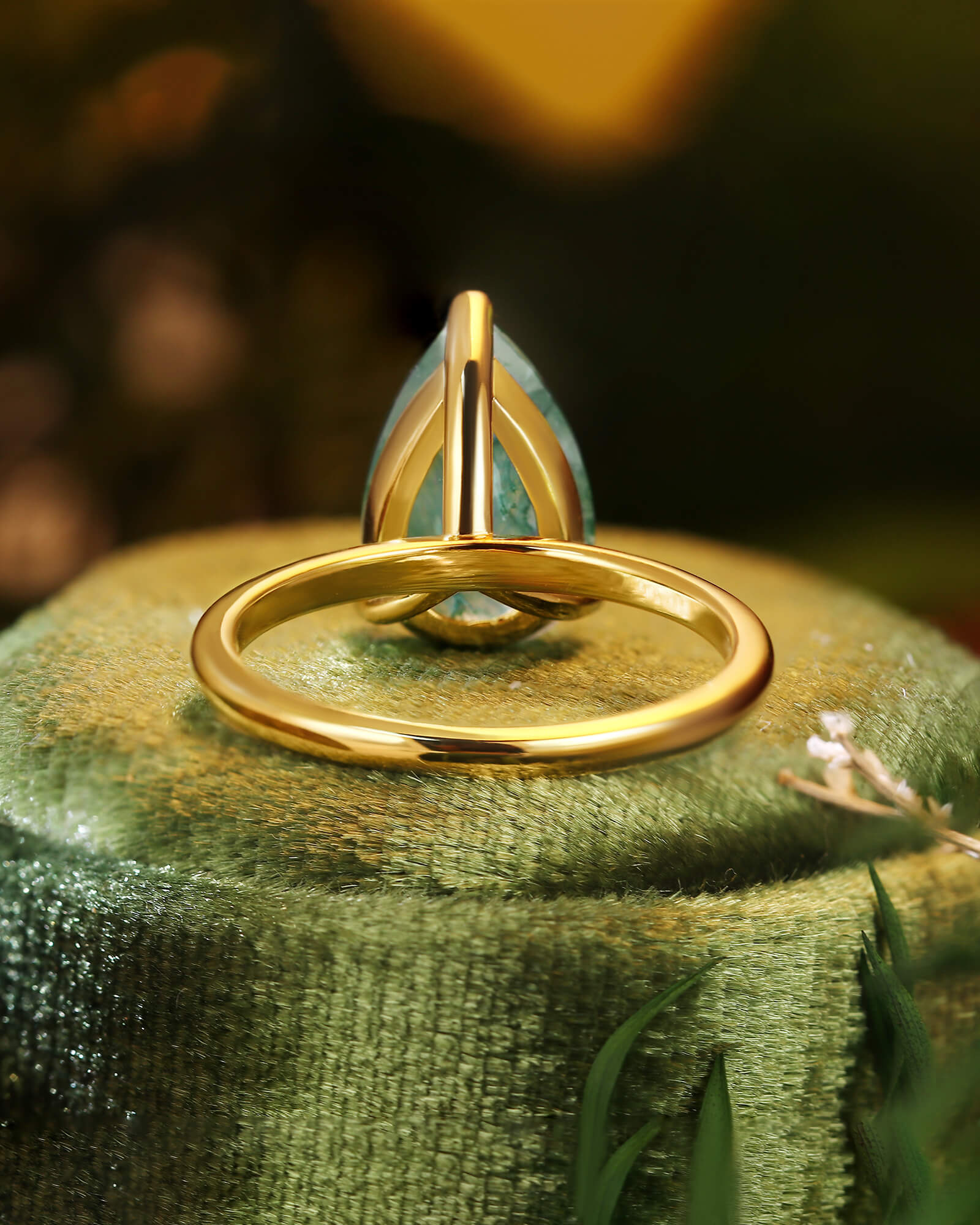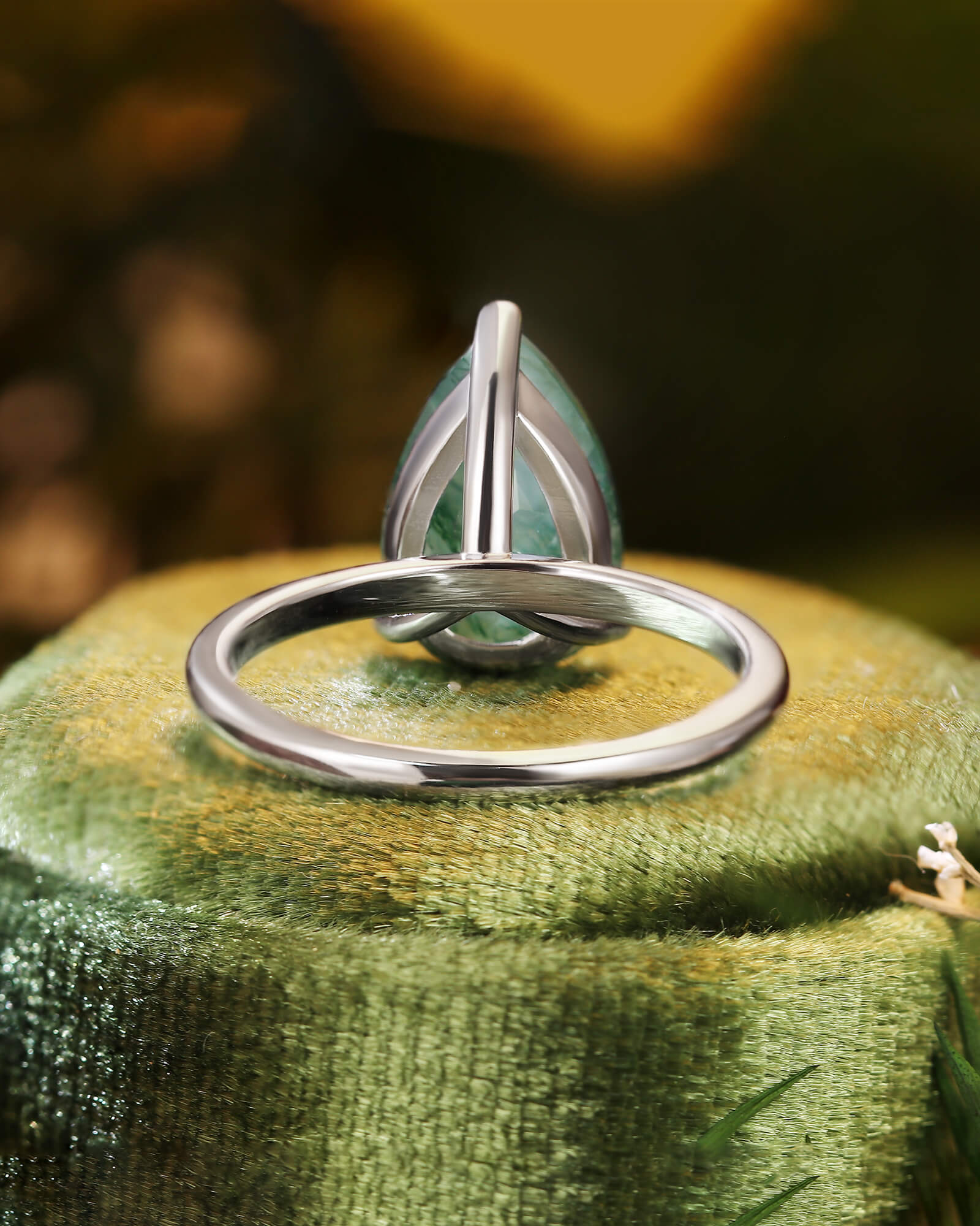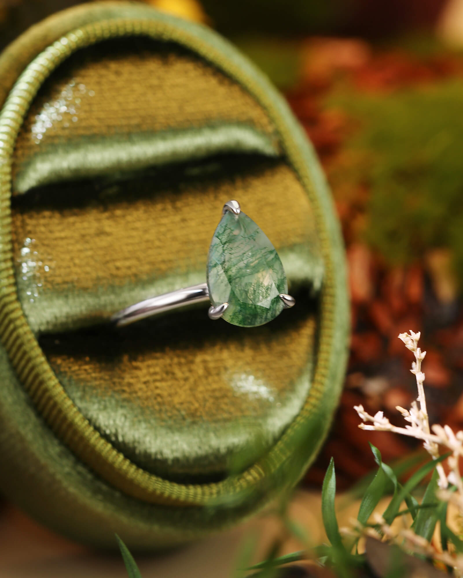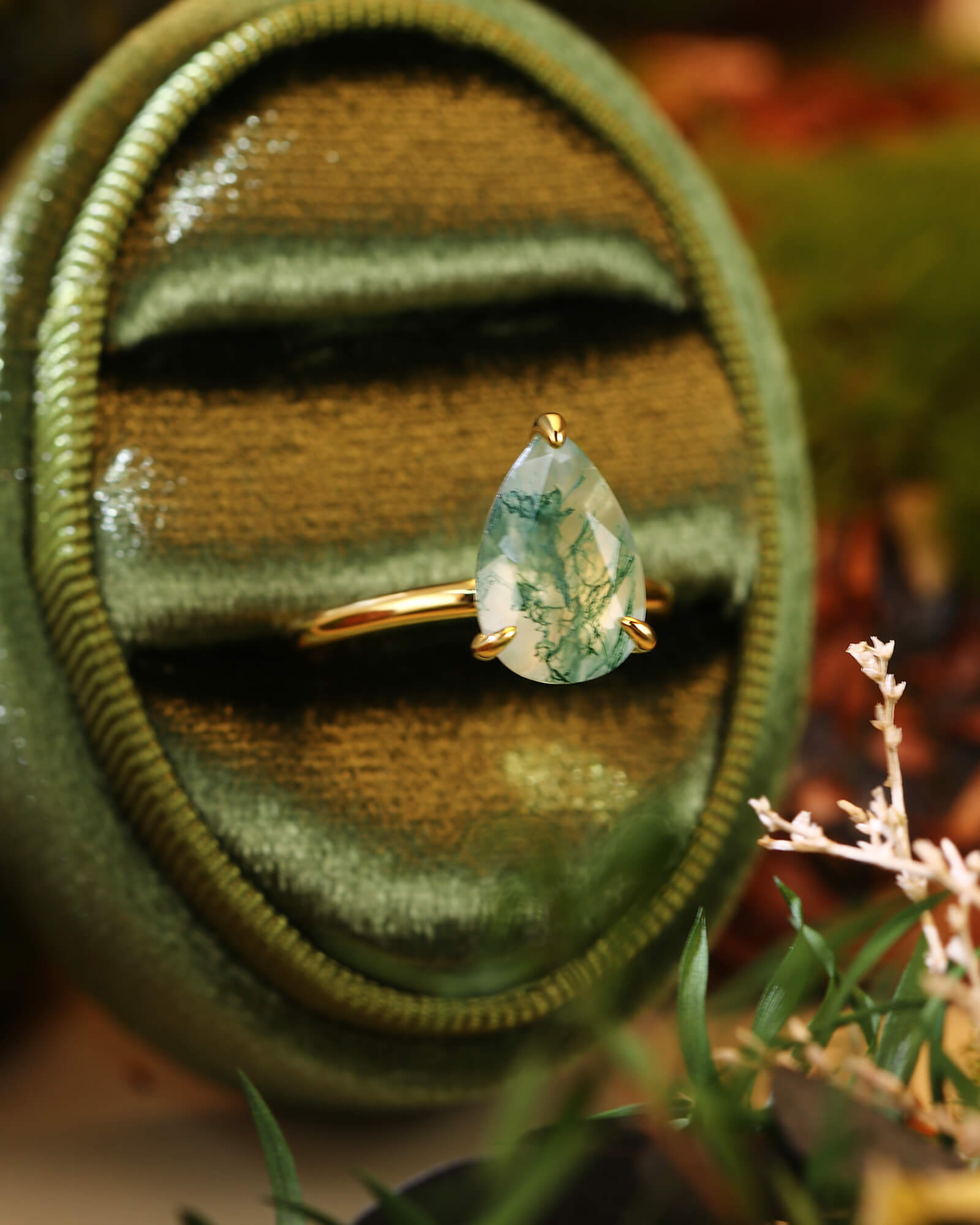 The LARK ring features a graceful pear-cut moss agate, a stone that naturally points toward your shared future. A solitaire design that symbolizes a love story always moving forward, full of growth and grace.