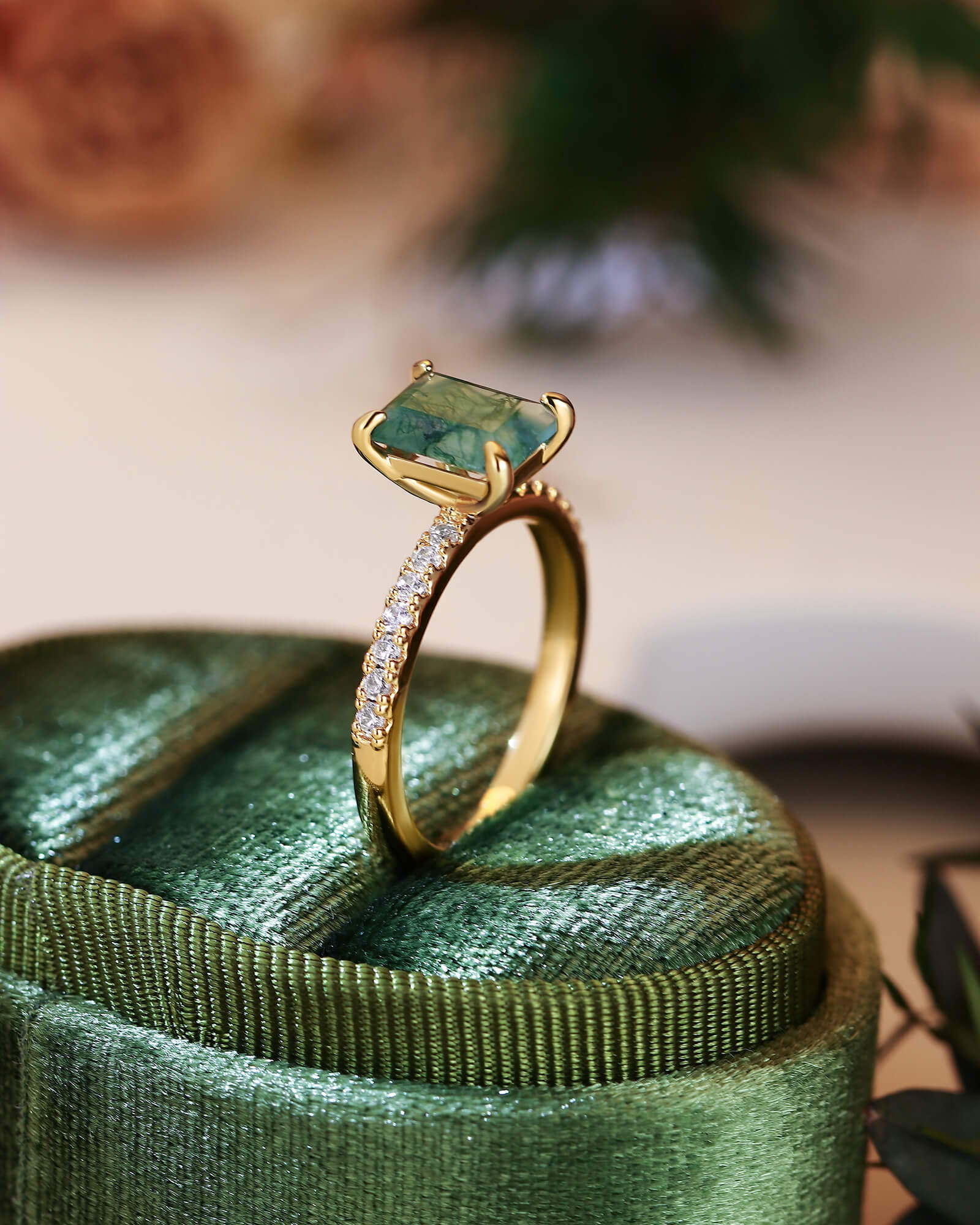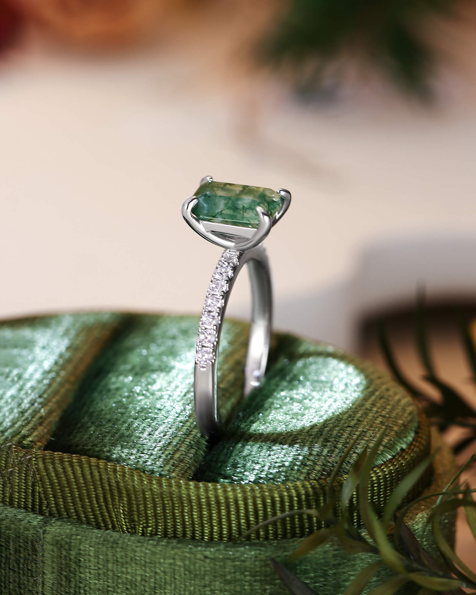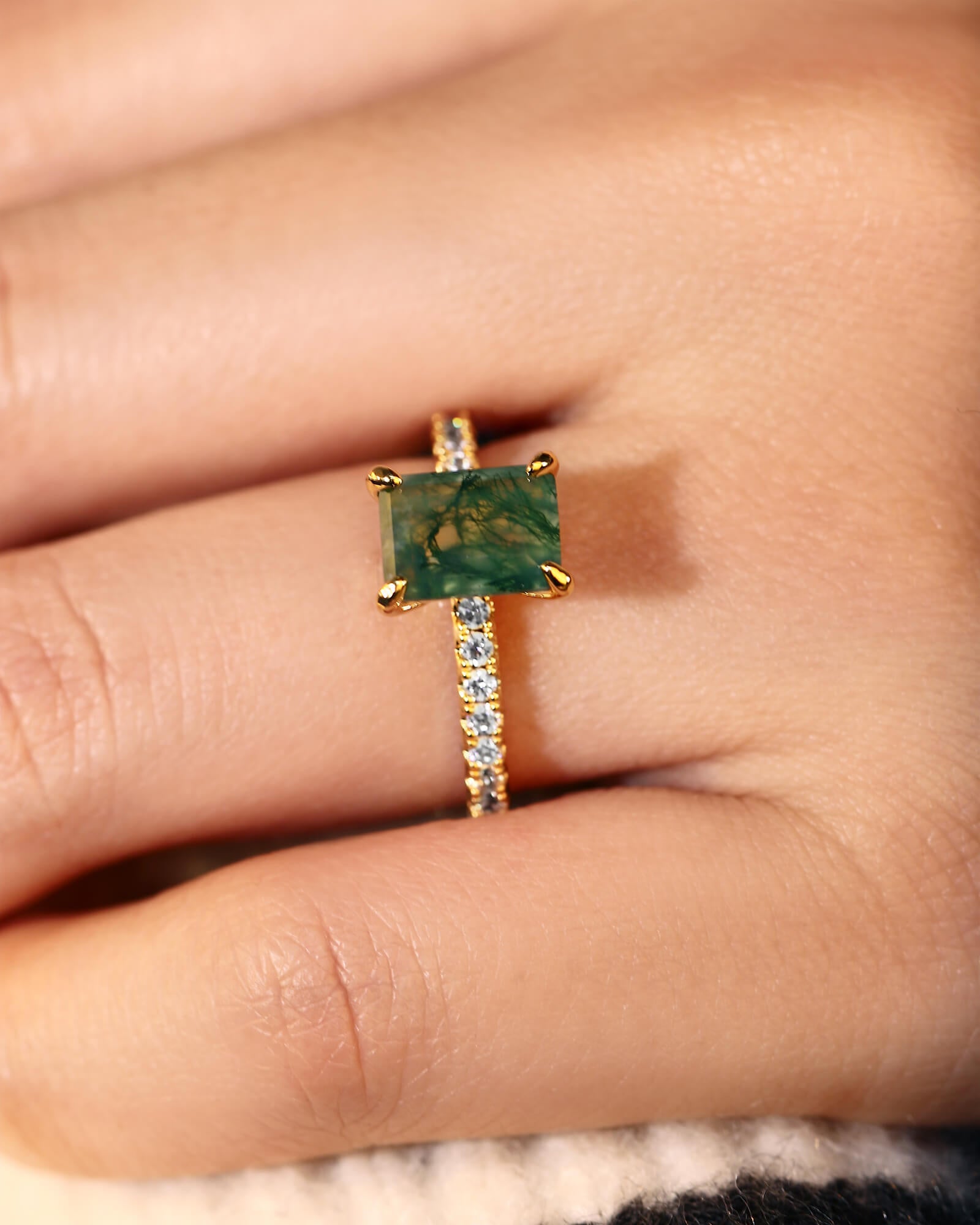 An emerald-cut moss agate, its elongated clarity a window to a serene inner world, is framed by a half pave band—where light travels from scattered stars to the deep green horizon. This is for love that reveals itself in layers of quiet revelation.