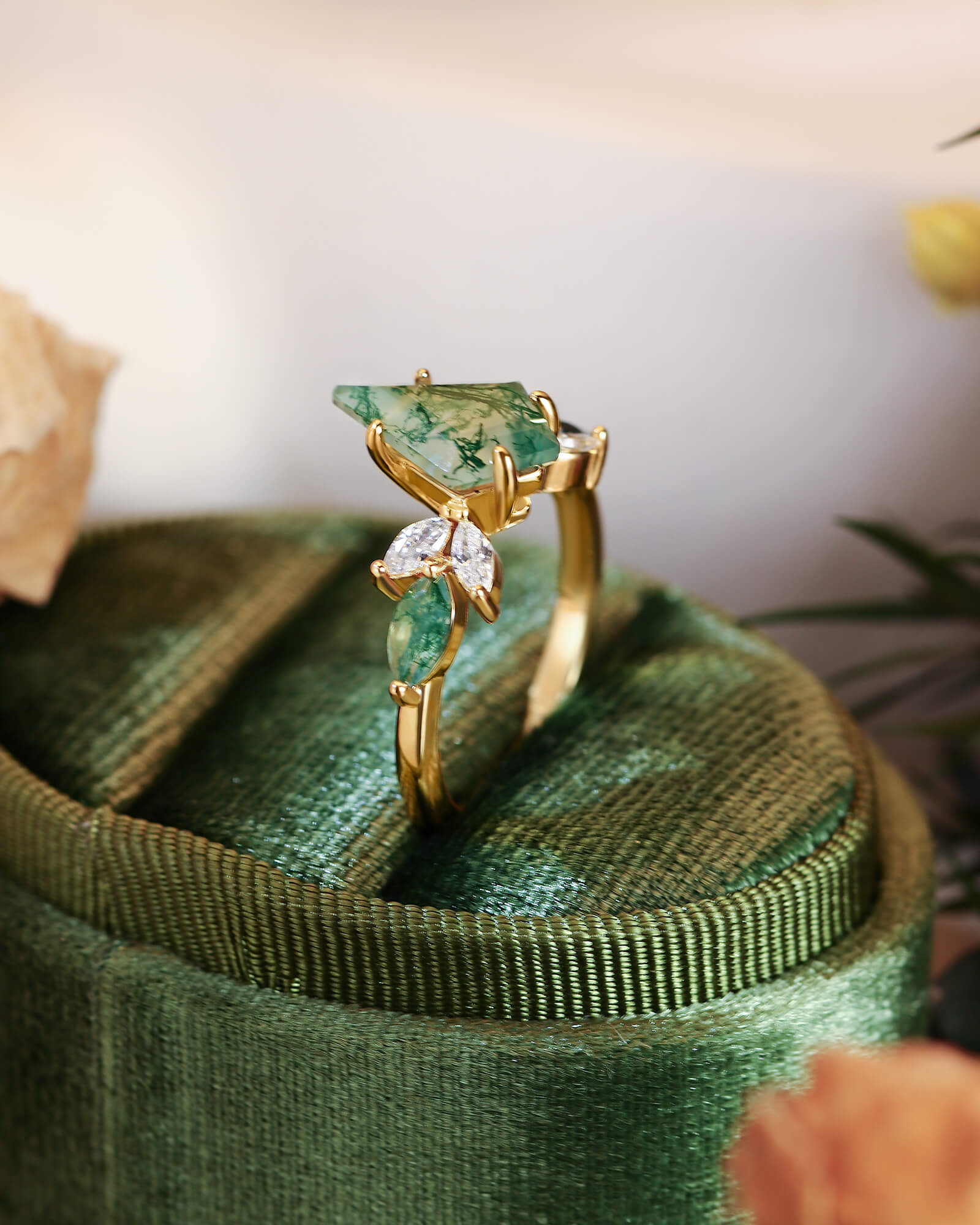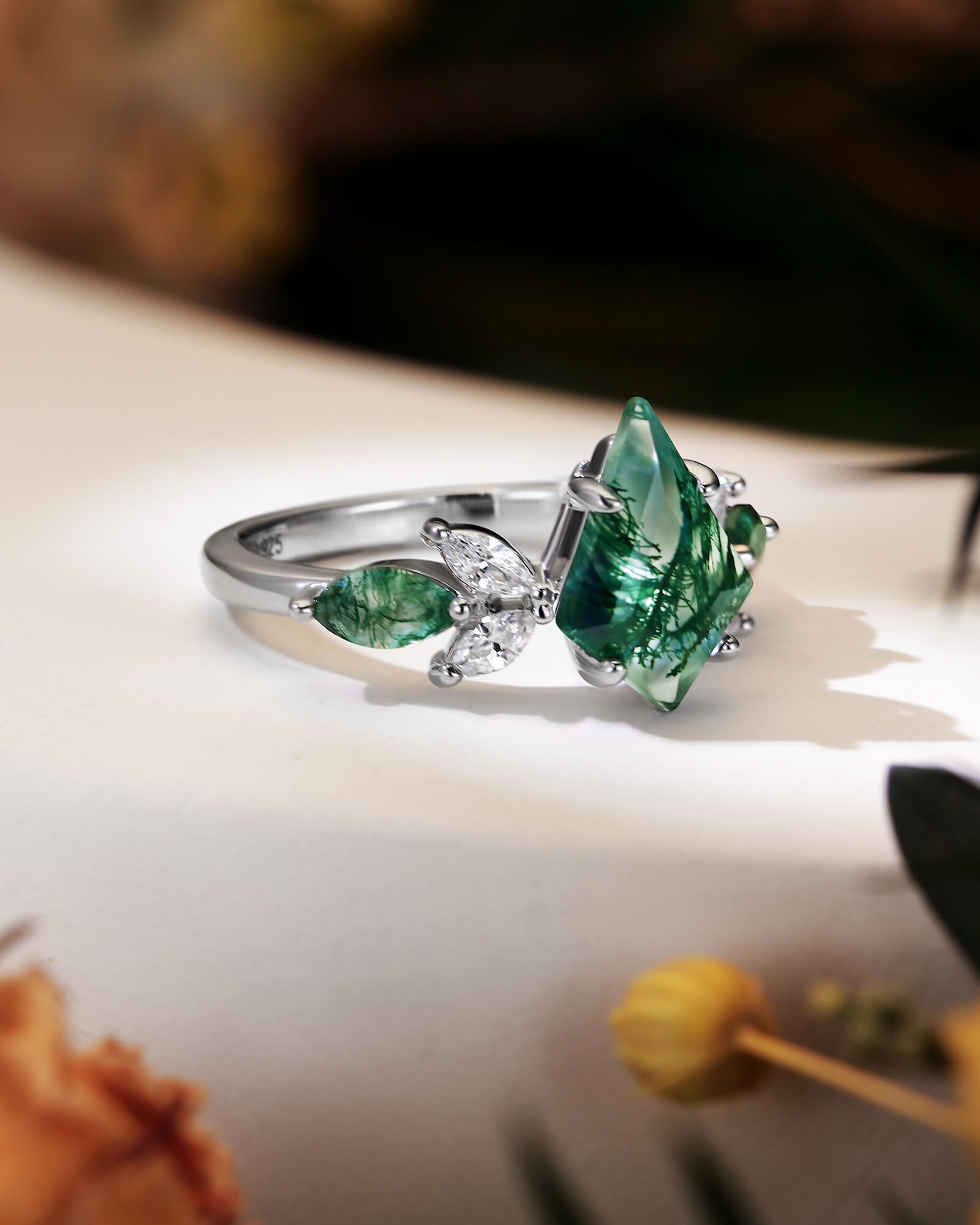 A dynamic kite cut moss agate takes flight, surrounded by a cluster of glittering marquise moissanites and moss agate. This ring is where the organic geometry of earth meets the dramatic sparkle of the stars.